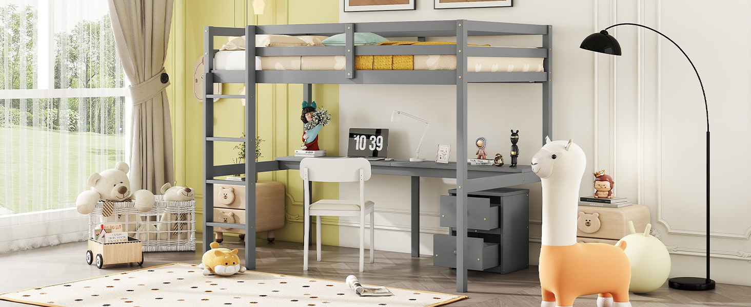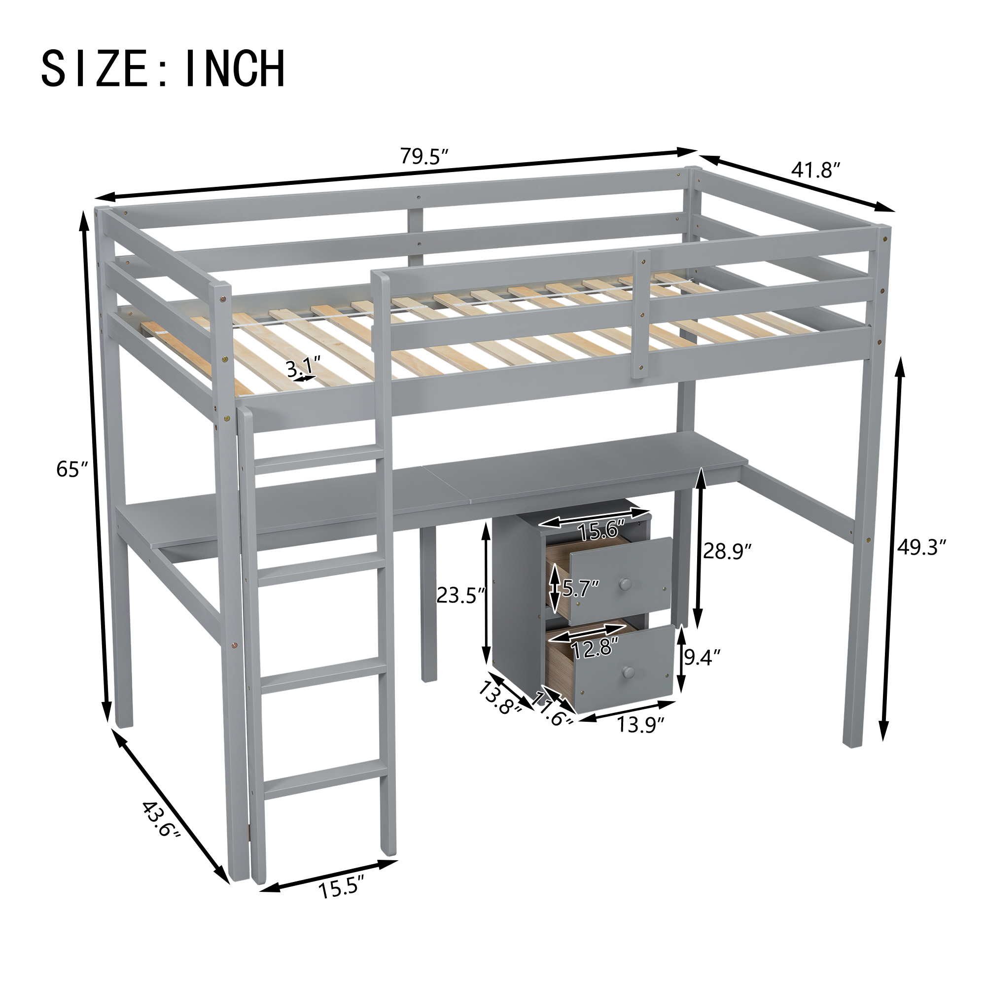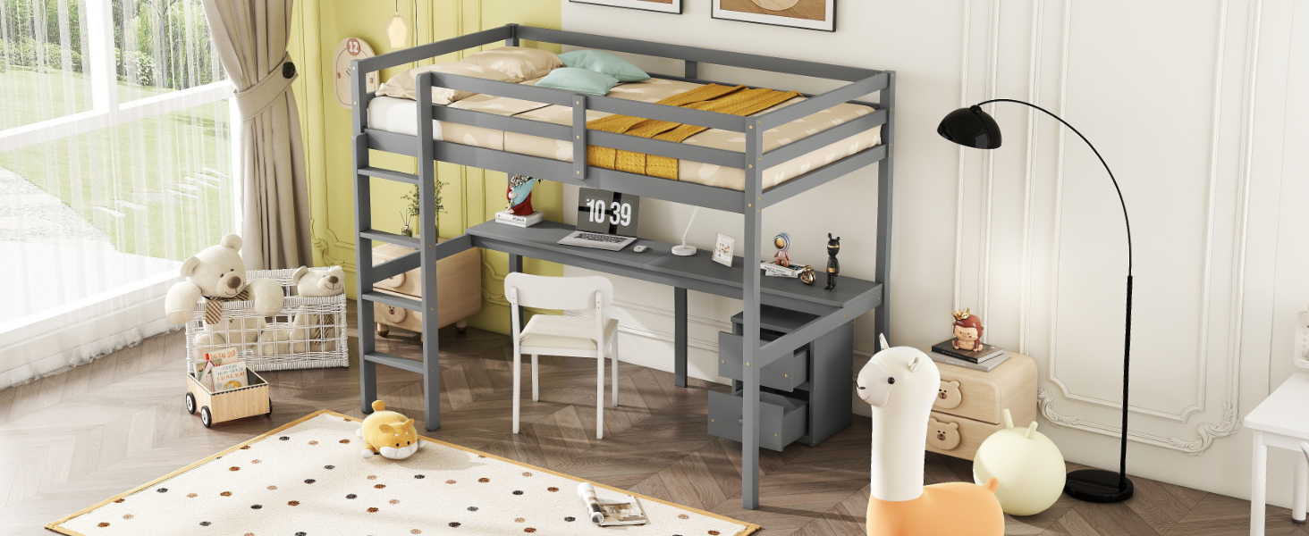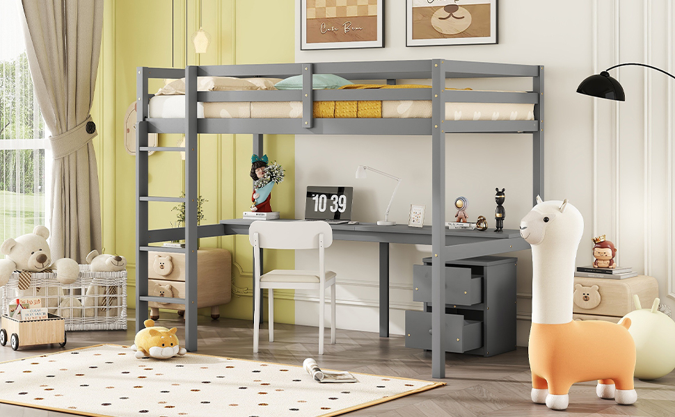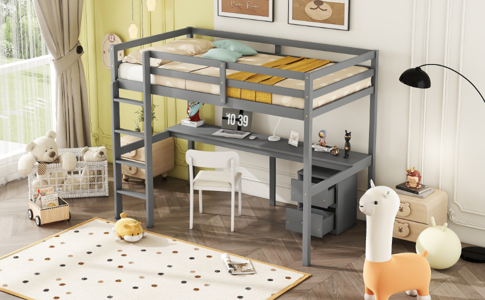 - [Comprehensive Design]The feature of this loft bed not only ensures better sturdy construction, but also reduce safety concerns, the desk offering the kids a quiet, cozy place for reading and writing. In addition, the built-in ladder against the upper bunk is designed with a safe and wider width to provide more spacious steps and solid support, making it easier for you to climb up and down the ladder.