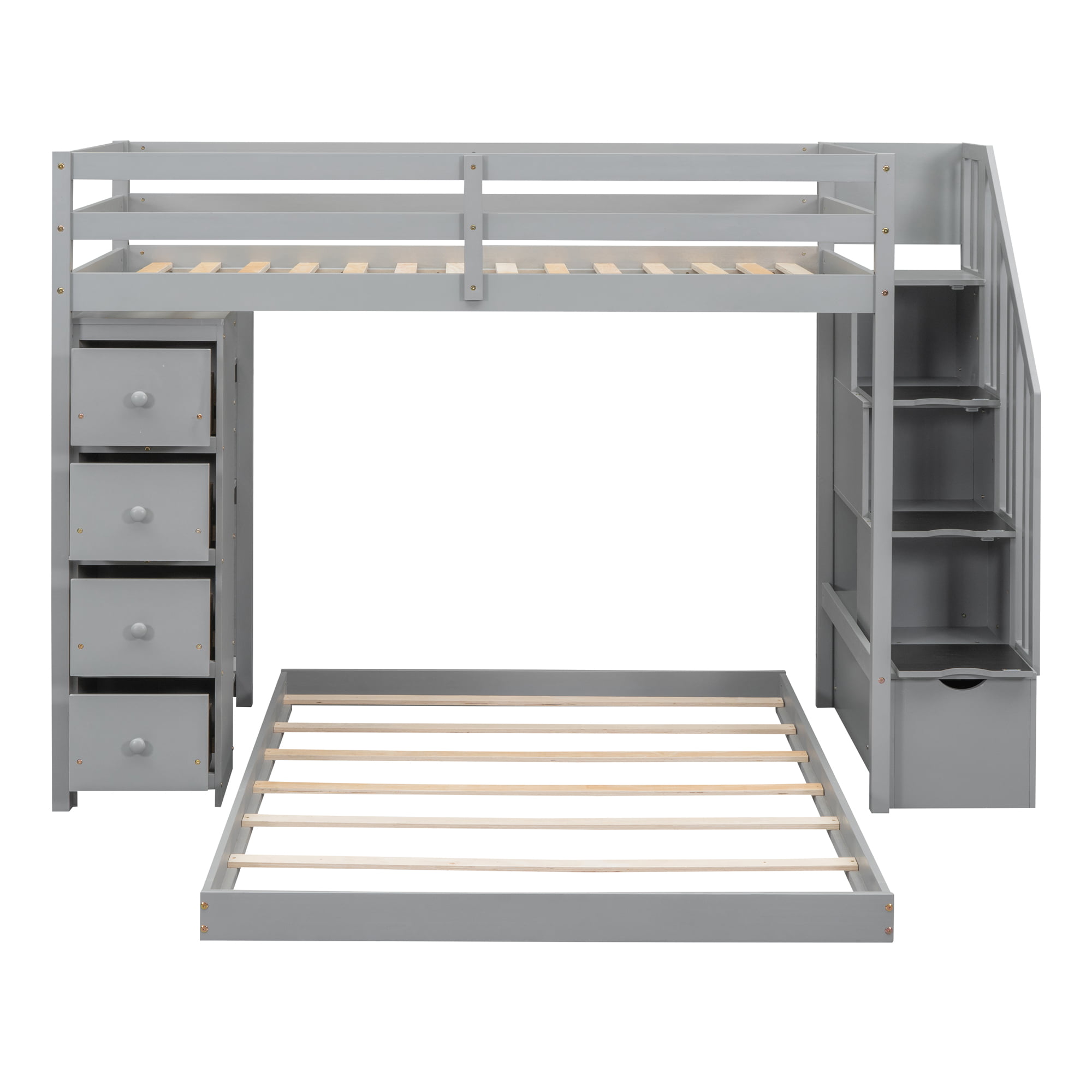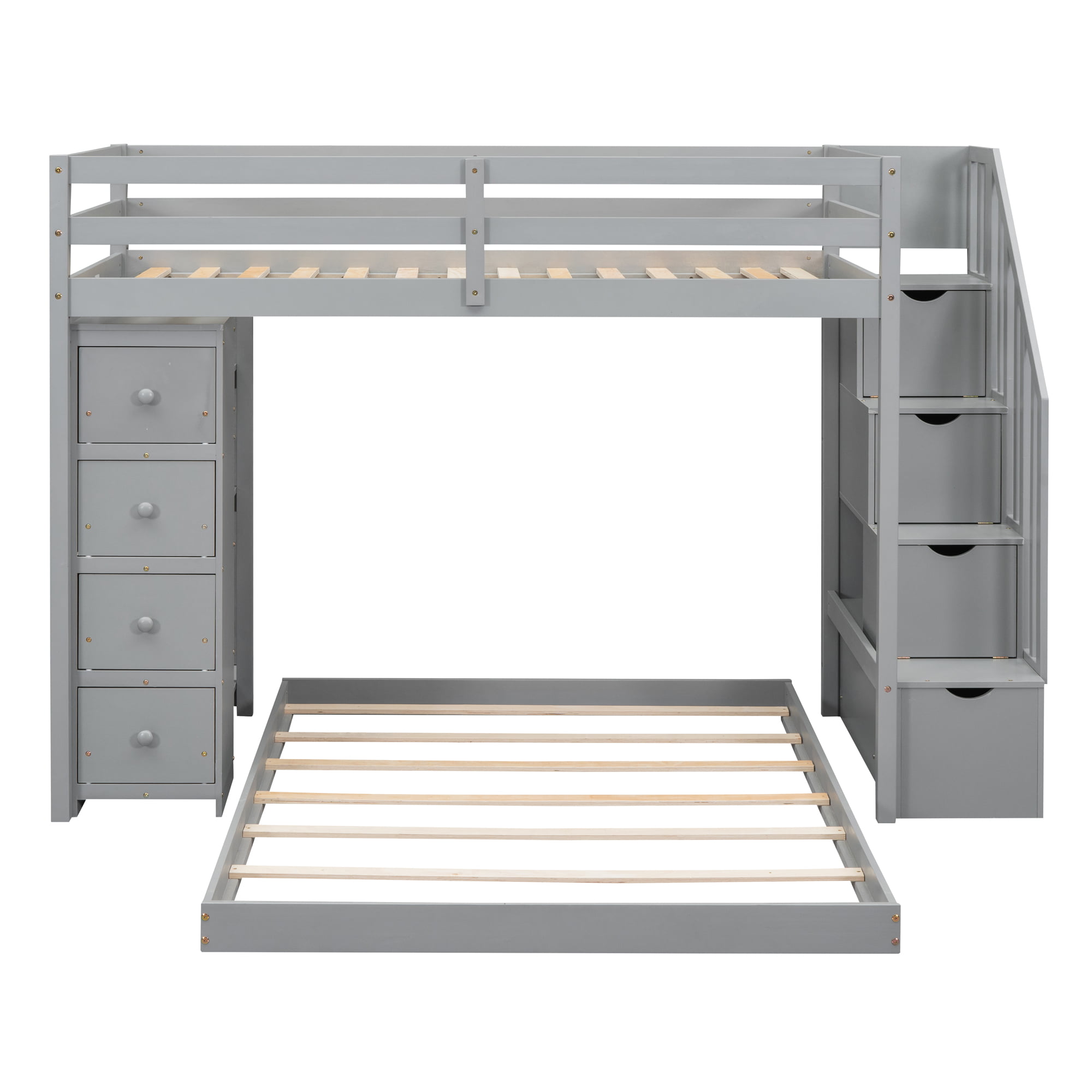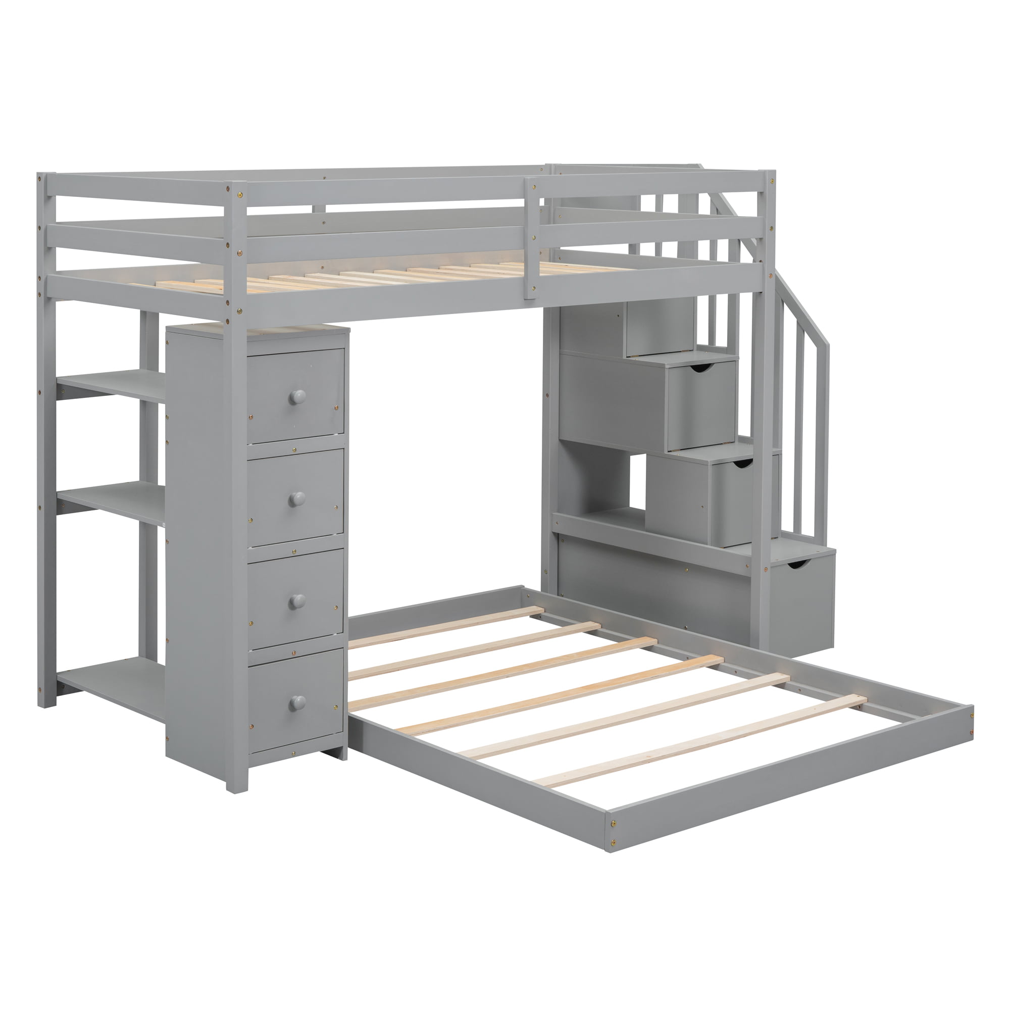 - [Versatility Galore] Four big drawers underneath the bed and the lateral shelves along with the storage stairs can provide enough space to stock your clothes, books, toys or any small items you like.You can also put some decorations on it to make the bed look even better. And the bottom bed can be pulled out for independent use.