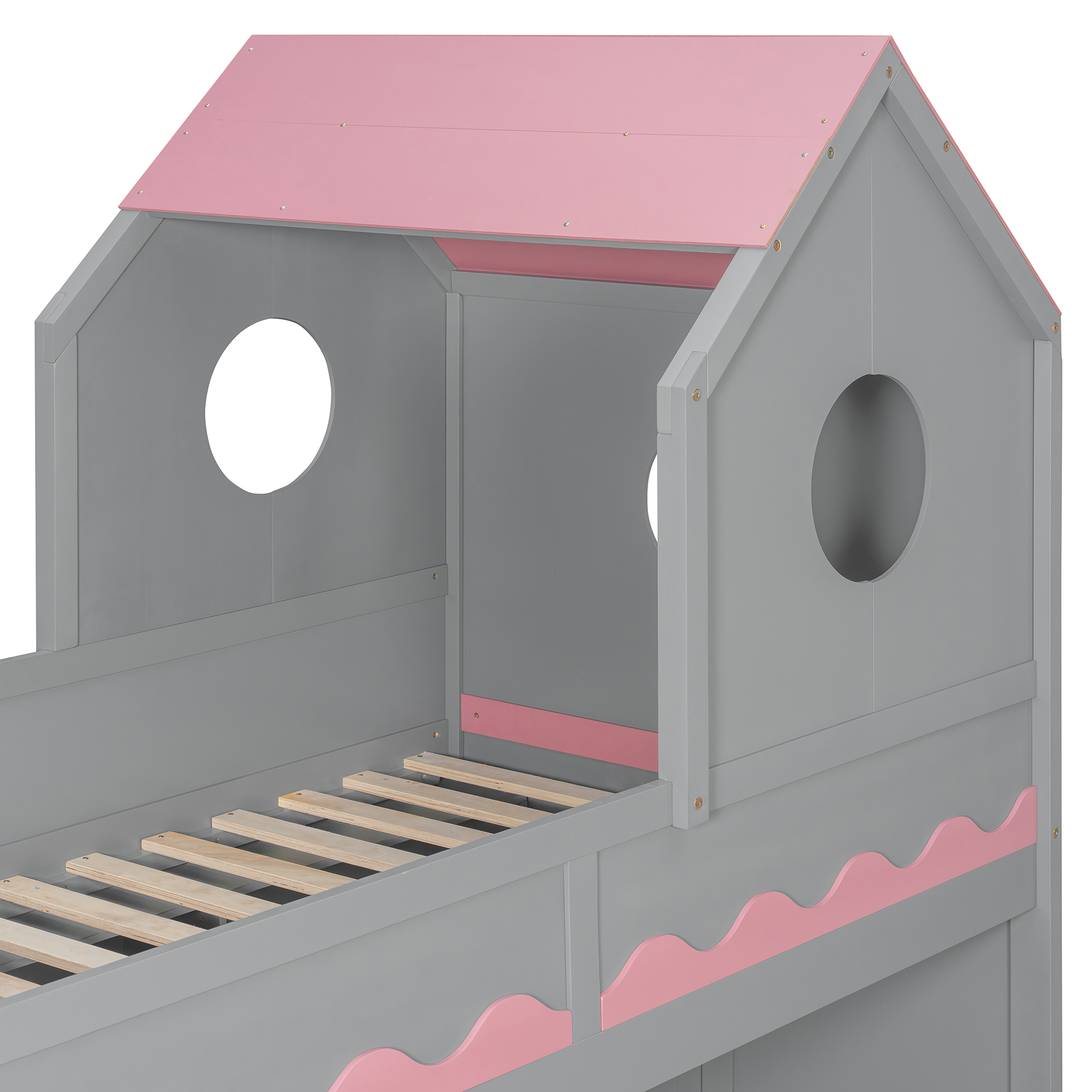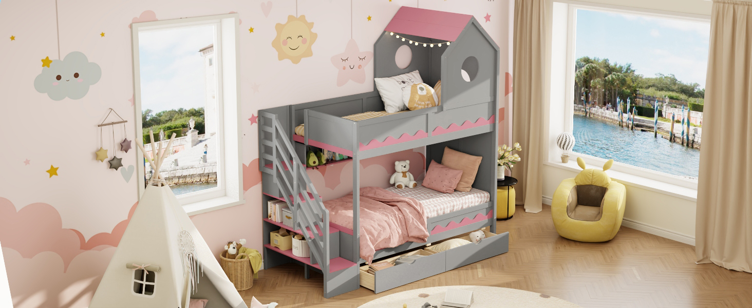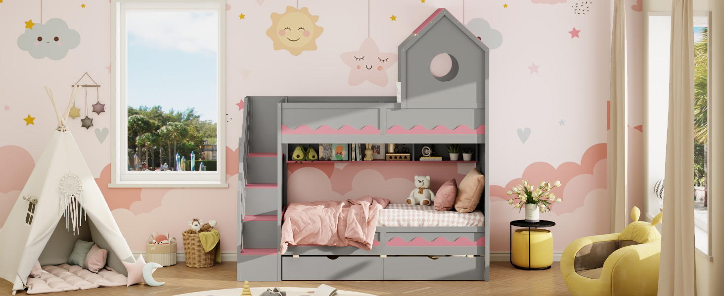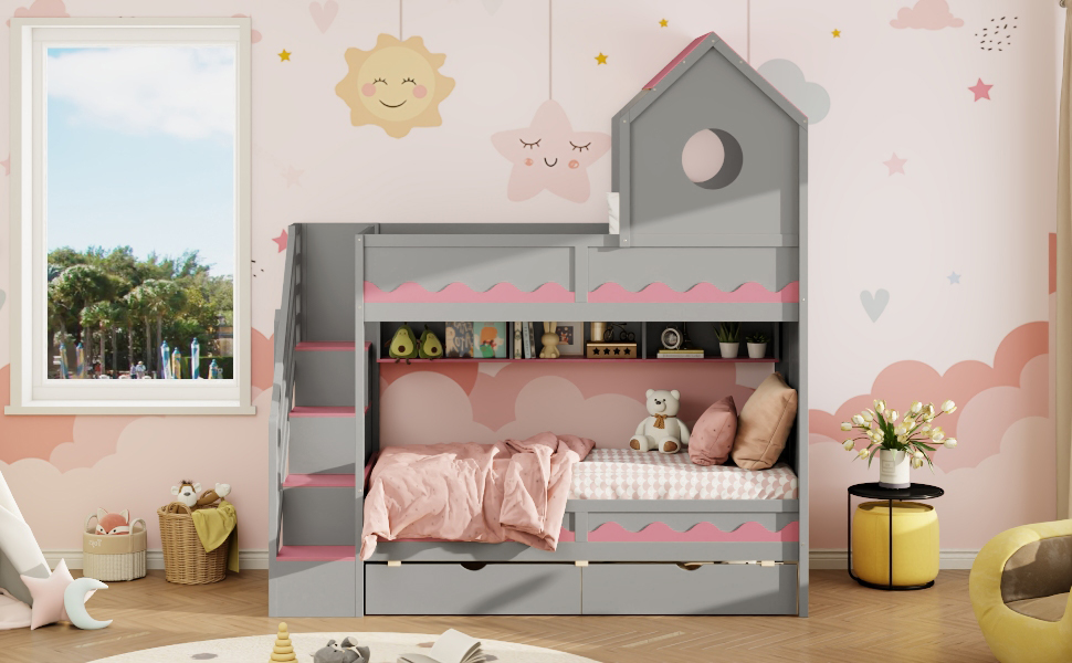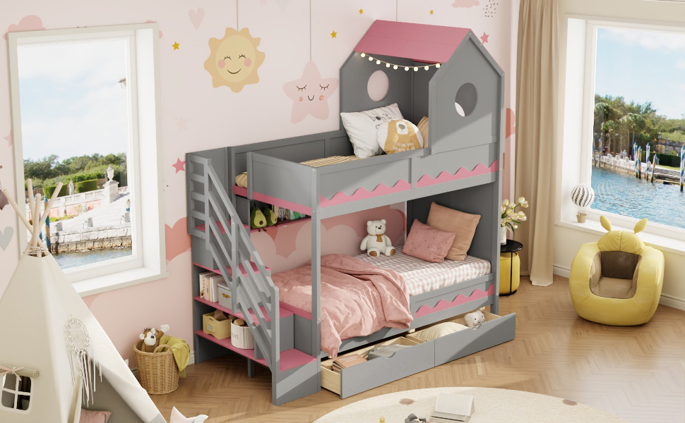 - [Enchanting Castle-Style Top Bunk] The upper bunk features a charming castle-inspired design, creating a magical, dream-like atmosphere that transforms the bed into a mini playhouse for your little ones.