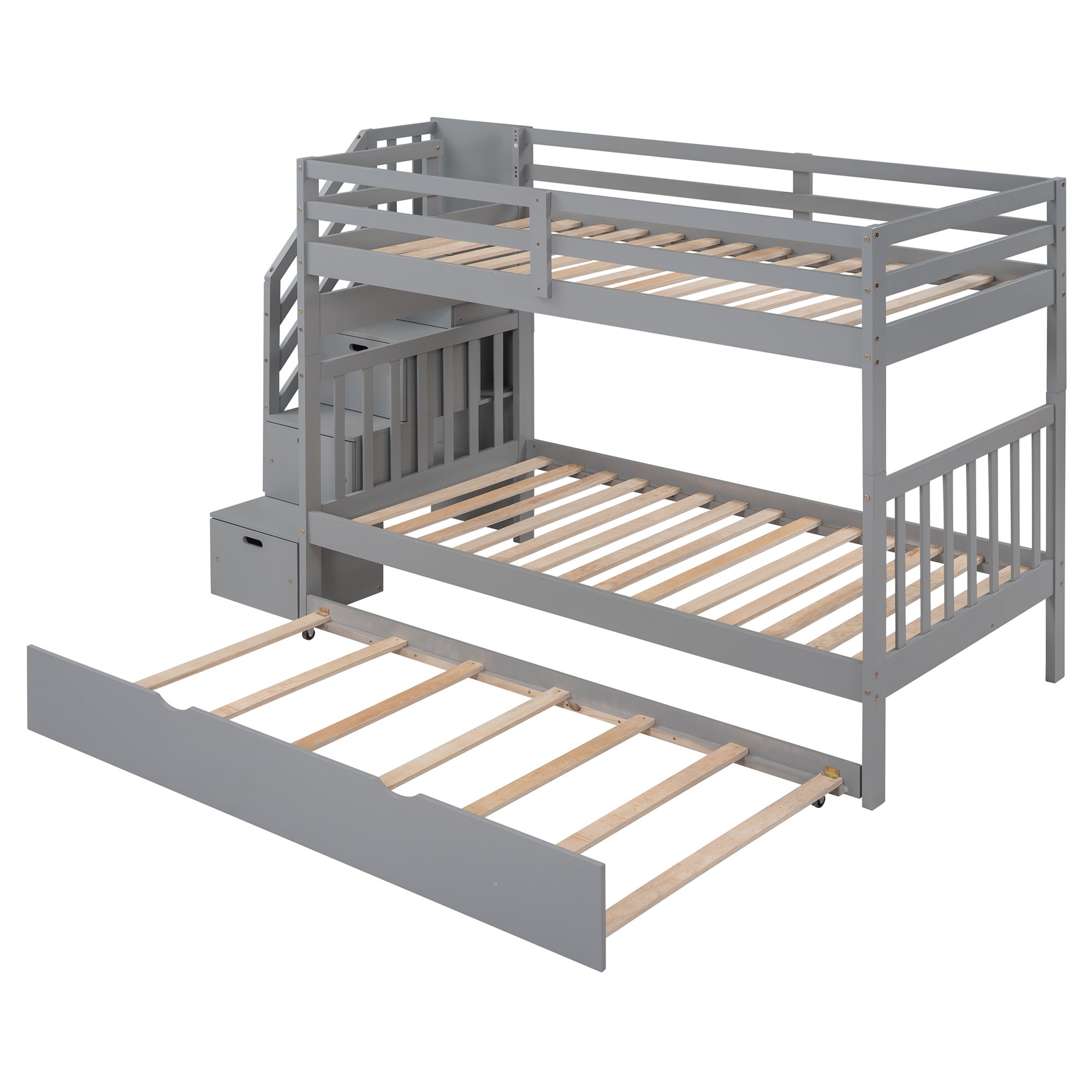 - [Versatility Galore] This bunk bed can be contracted into a twin over twin bunk bed with a twin size trundle or expanded into a twin over full bunk bed with a twin size trundle to accommodate your family or any overnight sleepers.The staircase can be placed on the left side or right side. No spring box is needed.