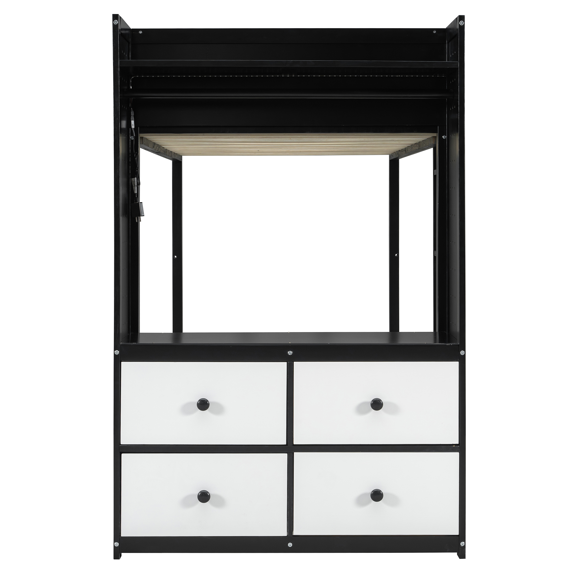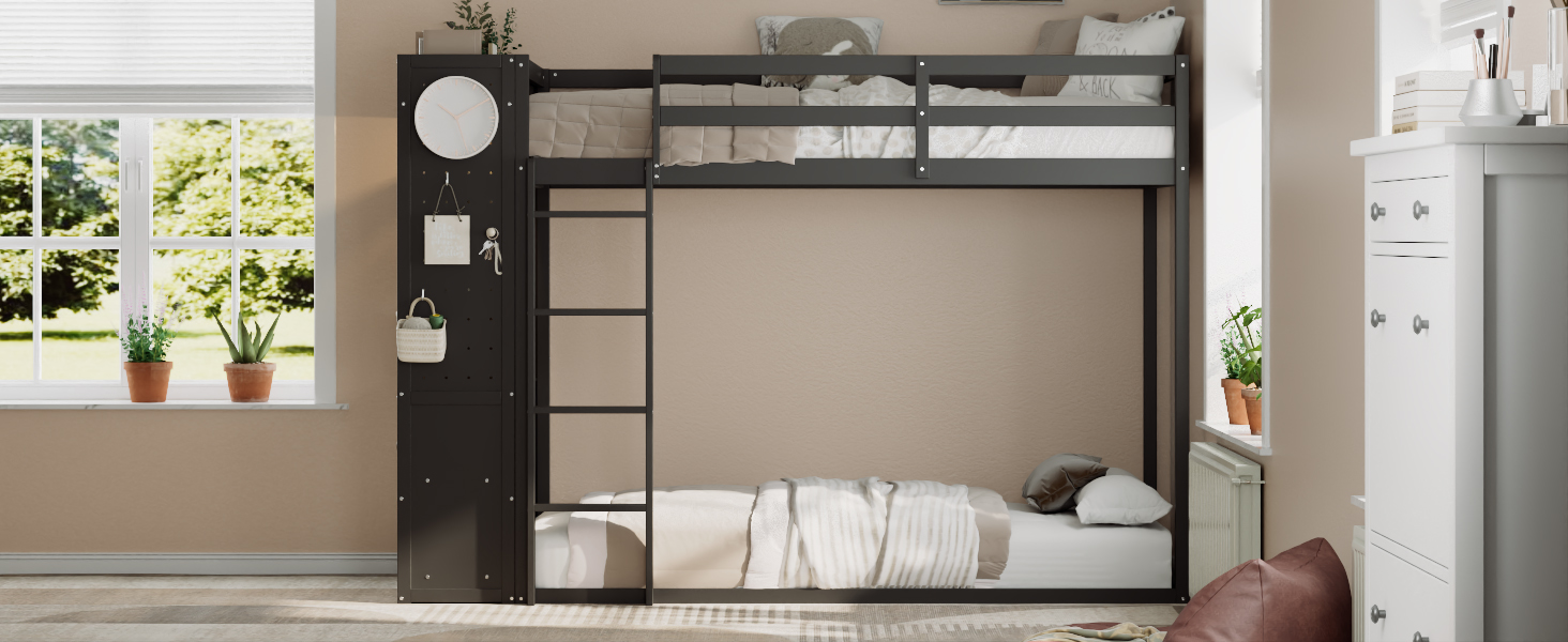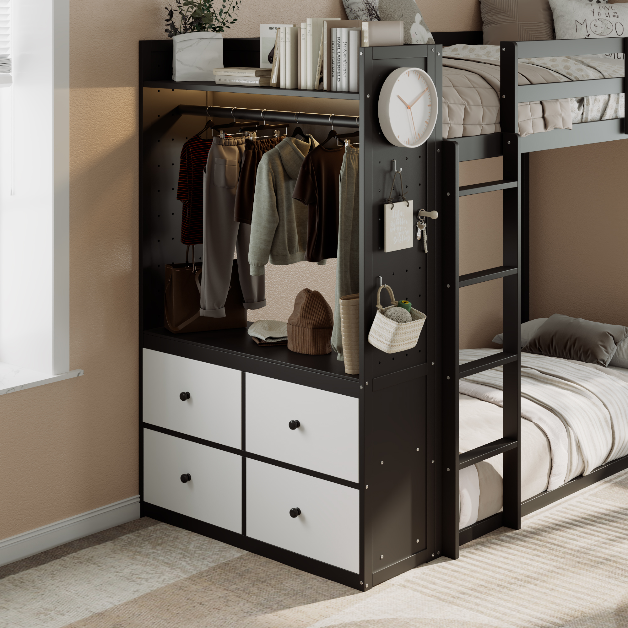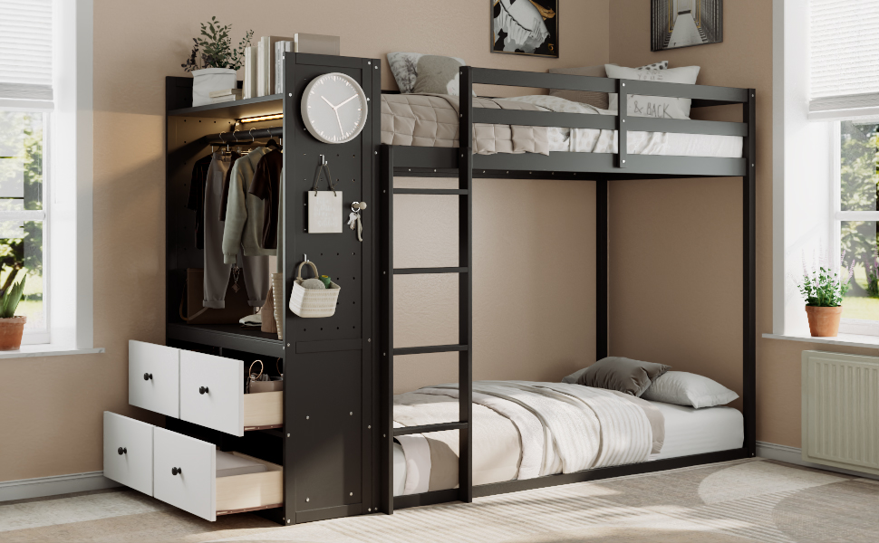 - [Integrated Wardrobe & Smart Illumination] This bunk bed features a unique built-in hanging area equipped with a durable rod, allowing you to organize your daily outfits directly within the bed frame. To enhance visibility and set a modern mood, the wardrobe section is topped with a vibrant light strip and an additional storage shelf for hats or accessories, making it a complete dressing station that saves you the cost and space of a separate closet.