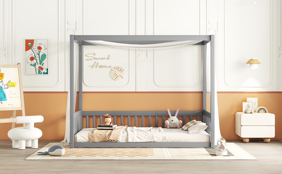 - [Safety and Quality Guaranteed]This floor bed is mainly crafted from premium pine wood, its canopy frame structure providing lasting sturdiness and durability. The bed is constructed with firmly secured structure, forging strong stability that ensures the safety of users while resting in the floor bed.