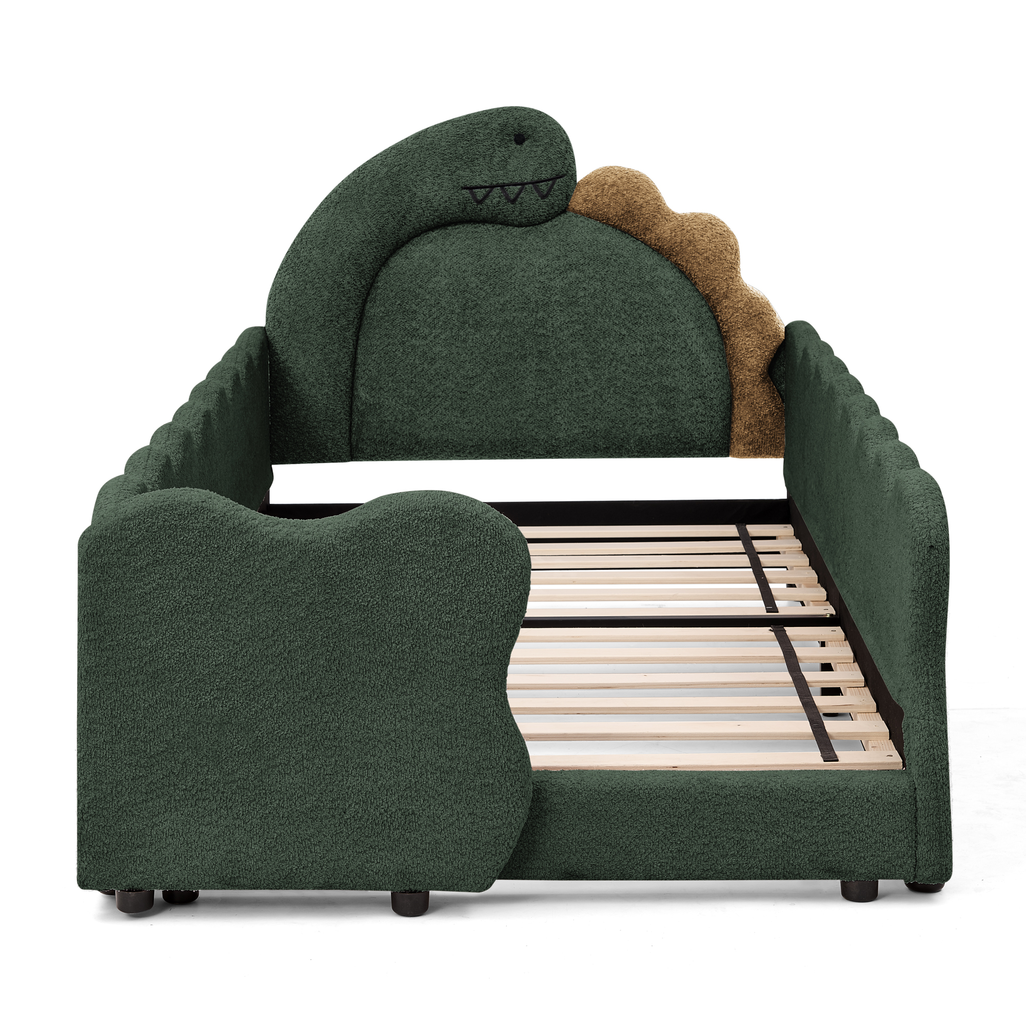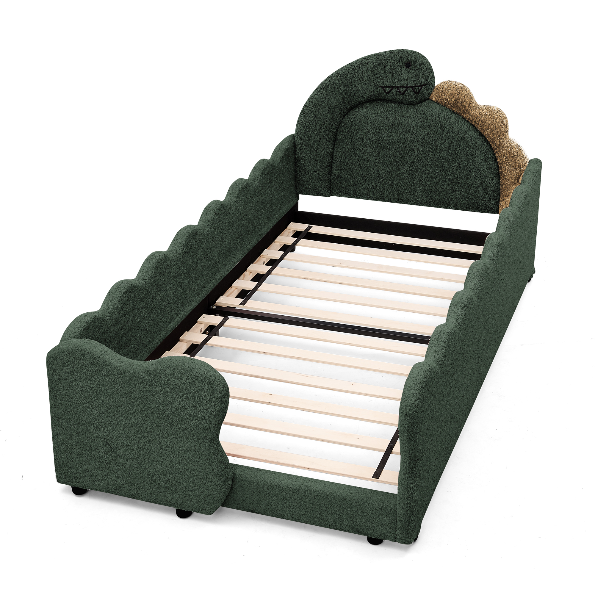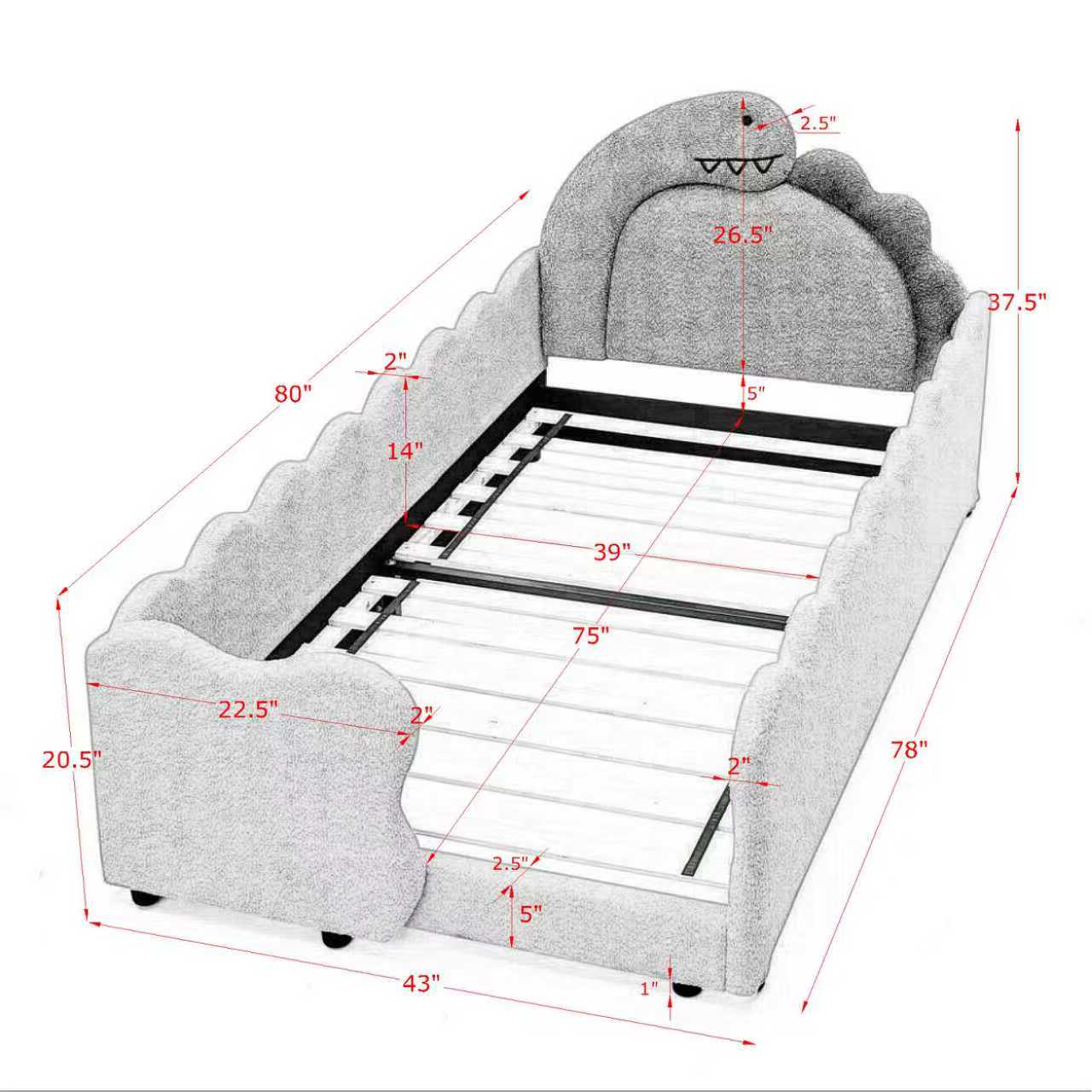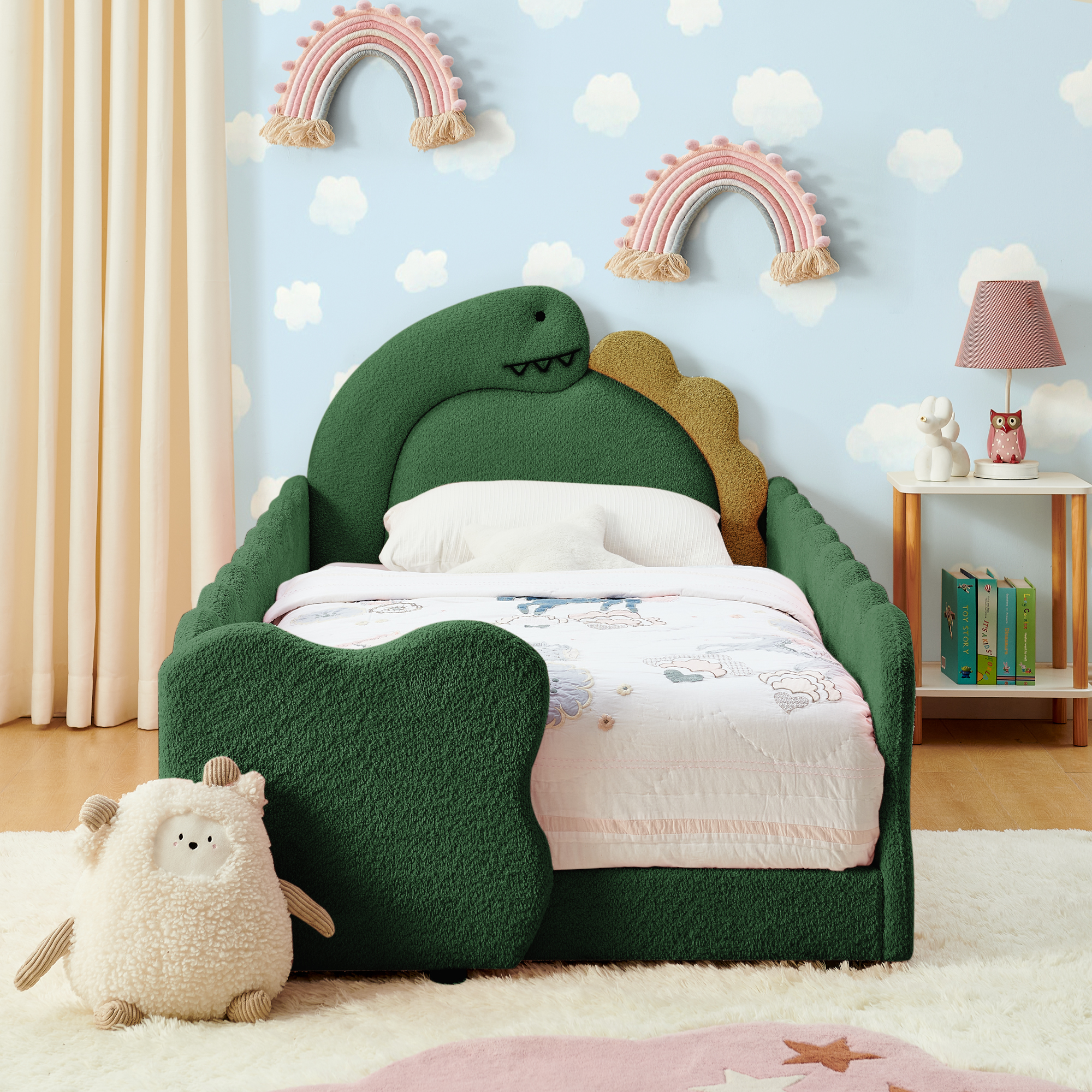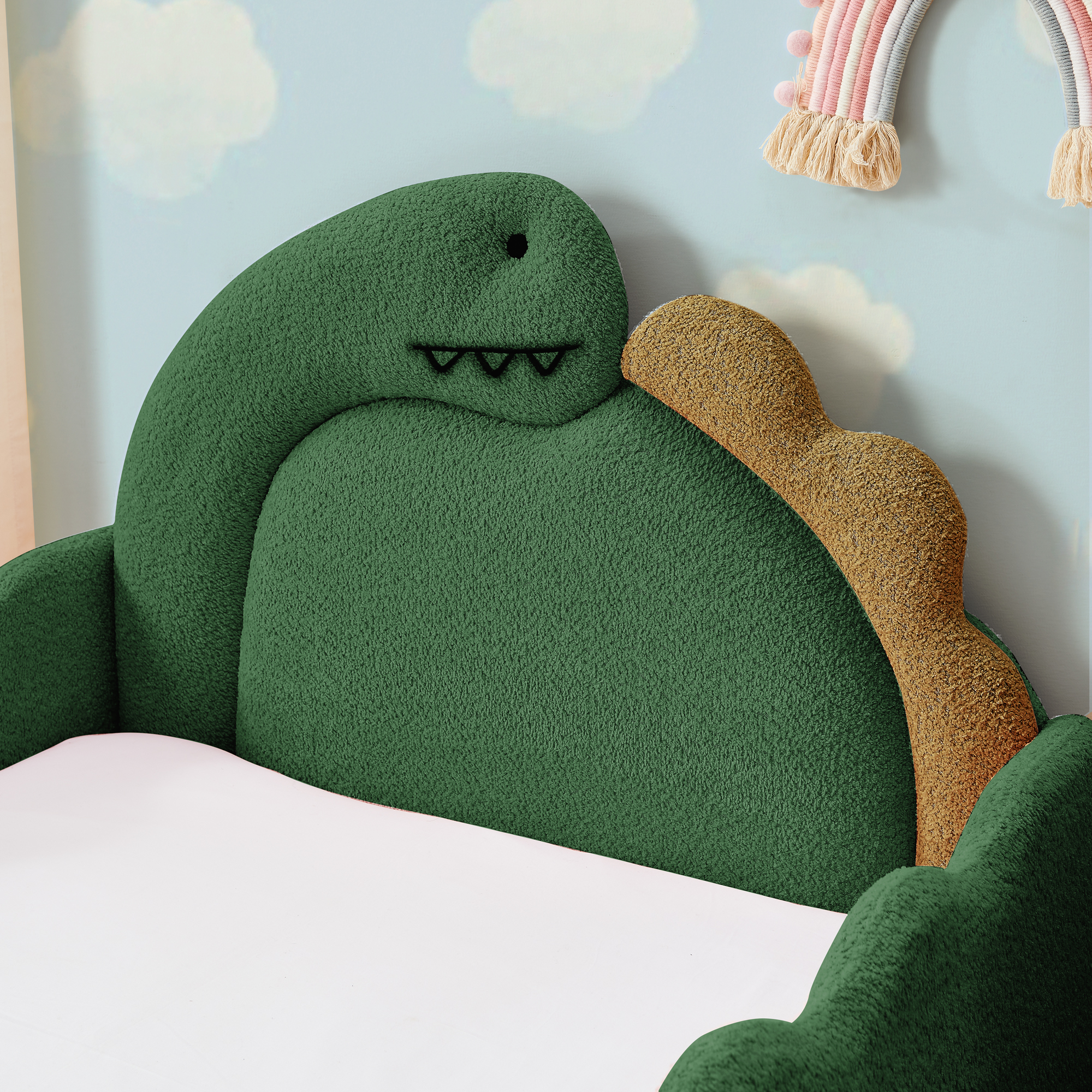 - Adorable 3D dinosaur-shaped headboard and spine-inspired guardrails spark kids’ imagination.