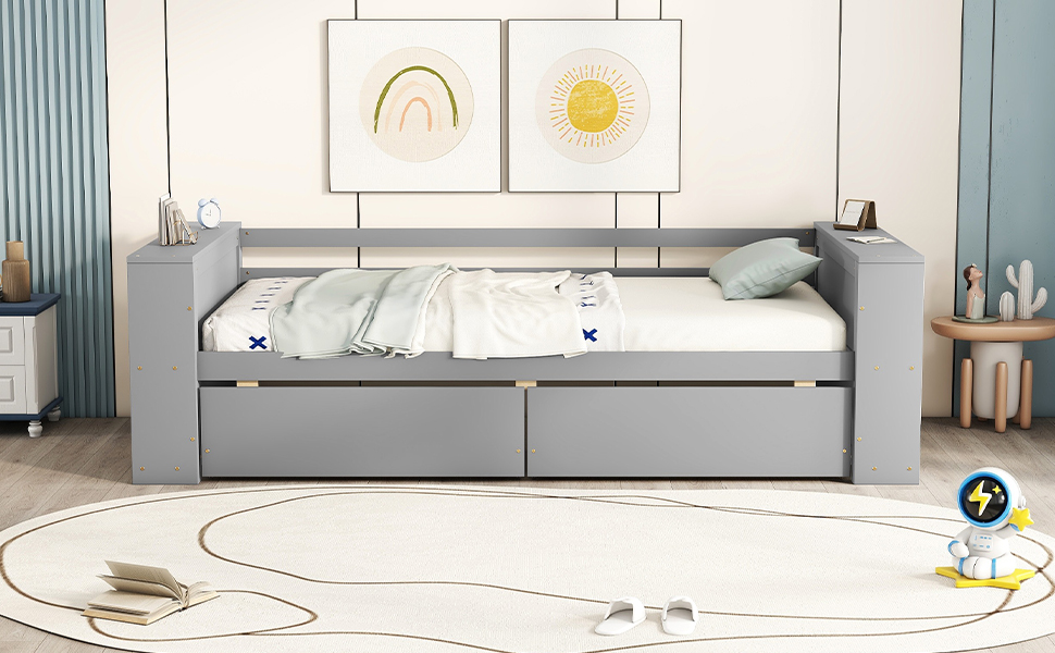 Enjoy sleeping and long naps on this modern and elegant sofa bed. Made of solid wood and MDF, this bed guarantees safety and stability, providing you with an extraordinary experience. The bed is designed with storage shelves on both sides, which is convenient and practical. 2 under-bed drawers for storing clothes, bedding and other items. Equipped with a hollow-free headboard, it can also be used as a double bed for children, and its compact design makes it suitable for any room, living room, bedroom, children’s room, spare room, etc.