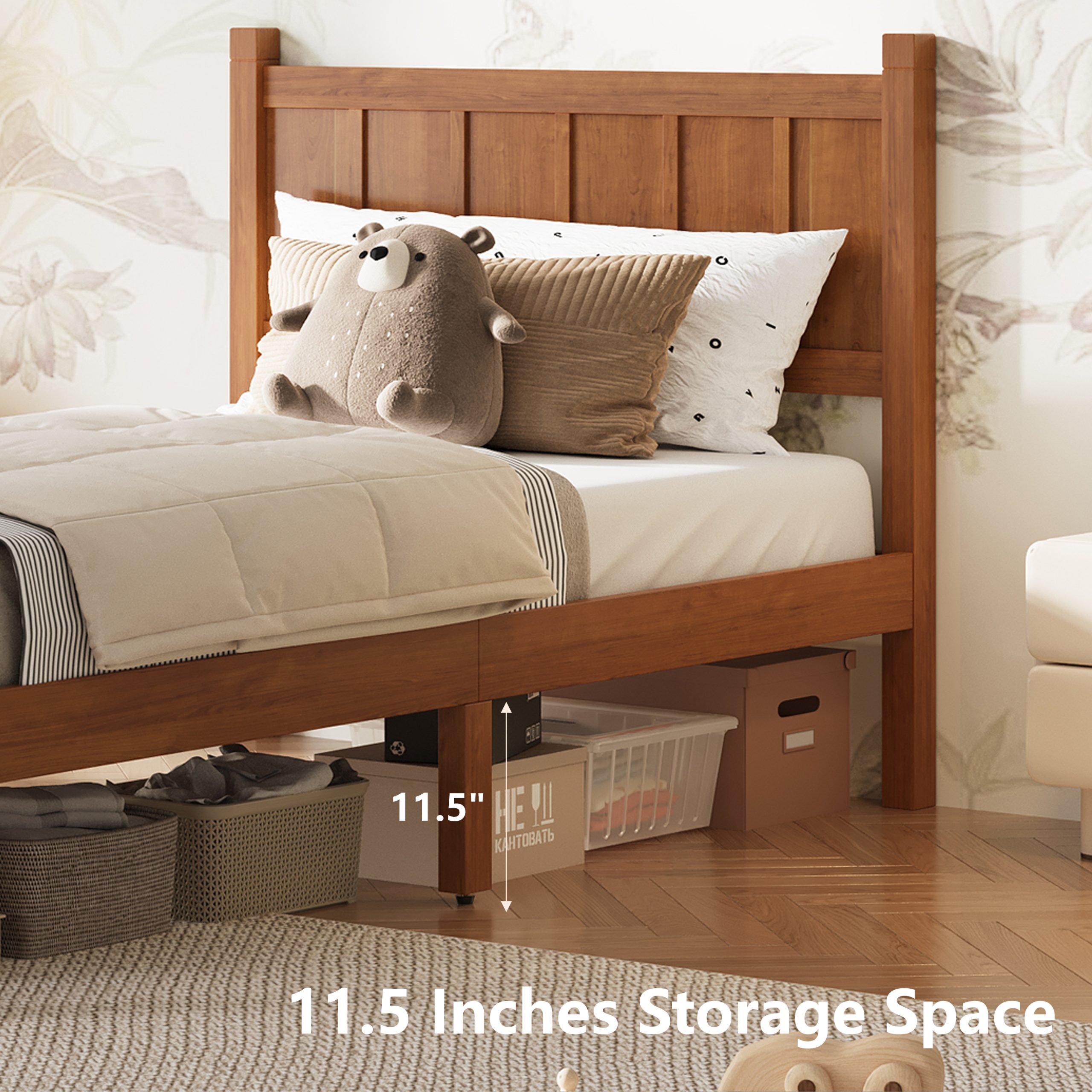 - Elevated Platform with 11.5” Under-Bed Storage:With an 11.5-inch clearance from the floor to the bed base, this platform bed offers generous under-bed storage space. Perfect for storage bins, baskets, extra bedding, or seasonal items, it helps you maximize bedroom organization while keeping clutter out of sight. This thoughtful design adds practical functionality without compromising style.
