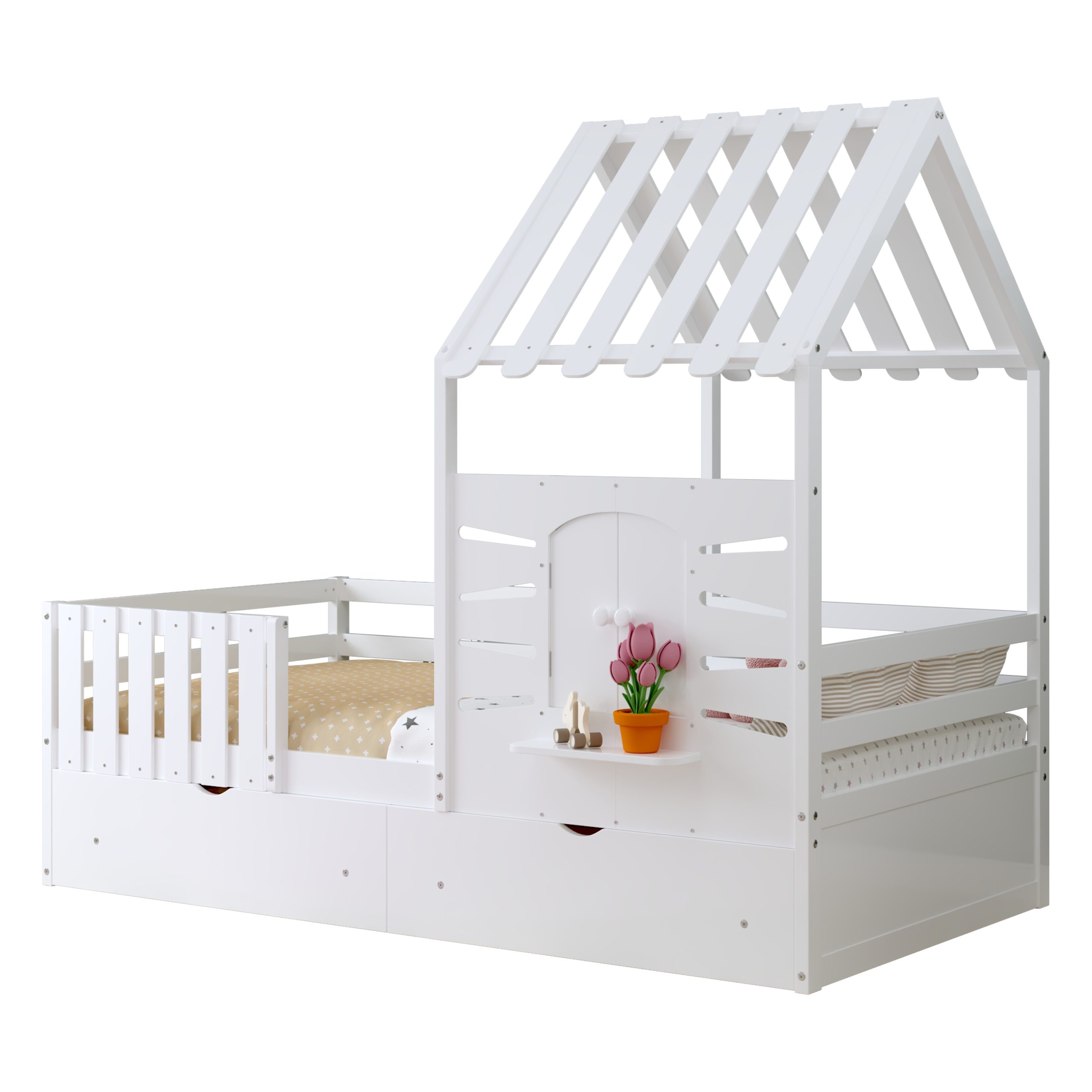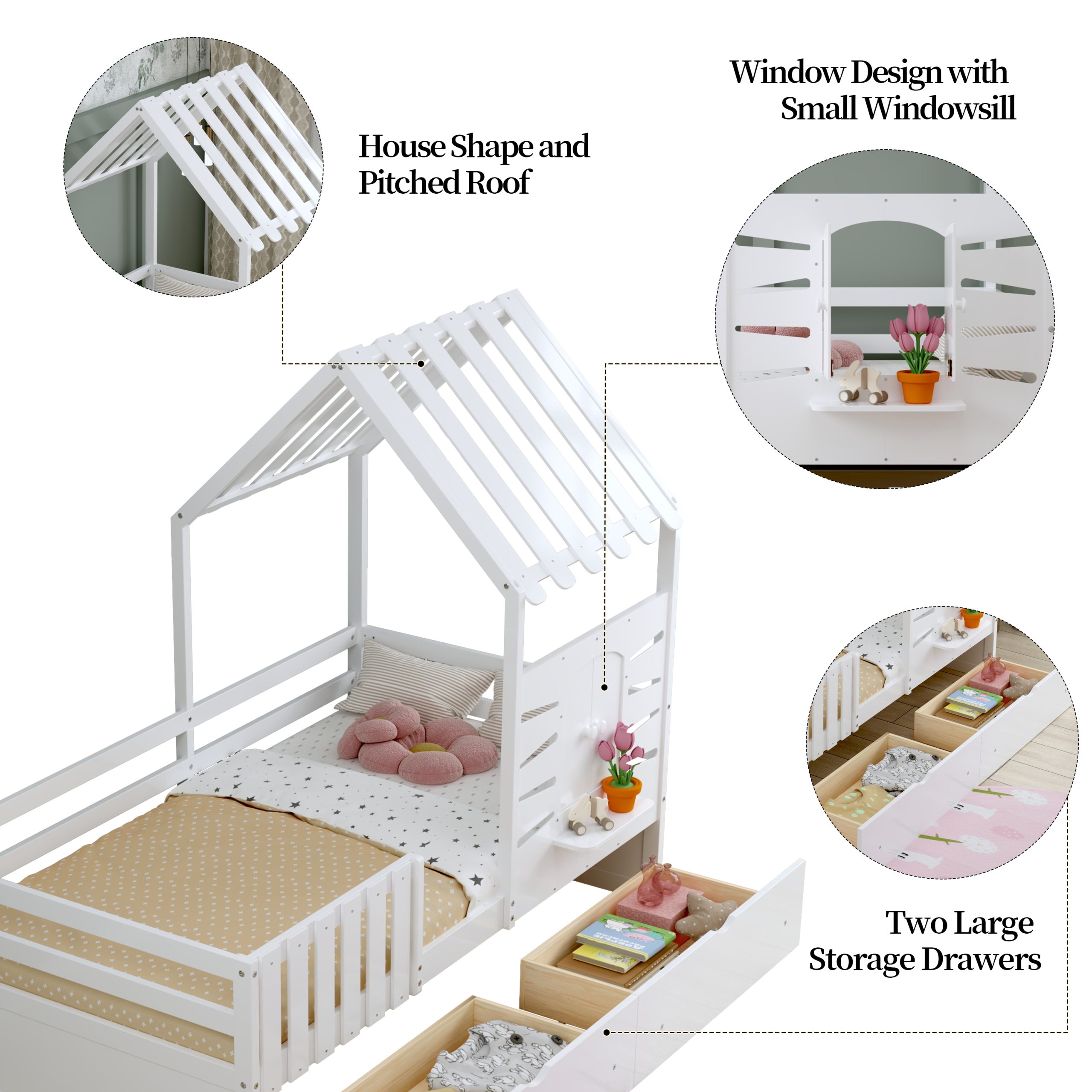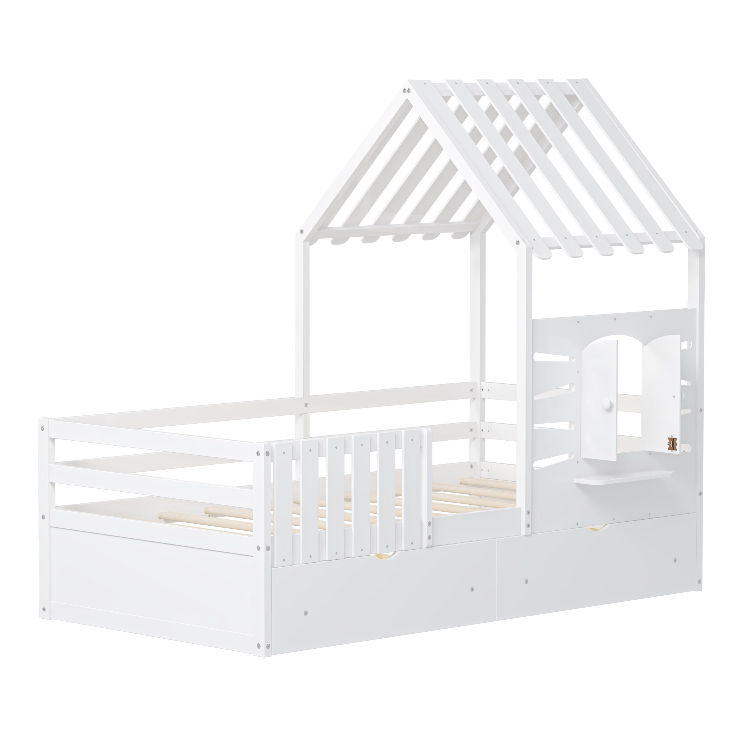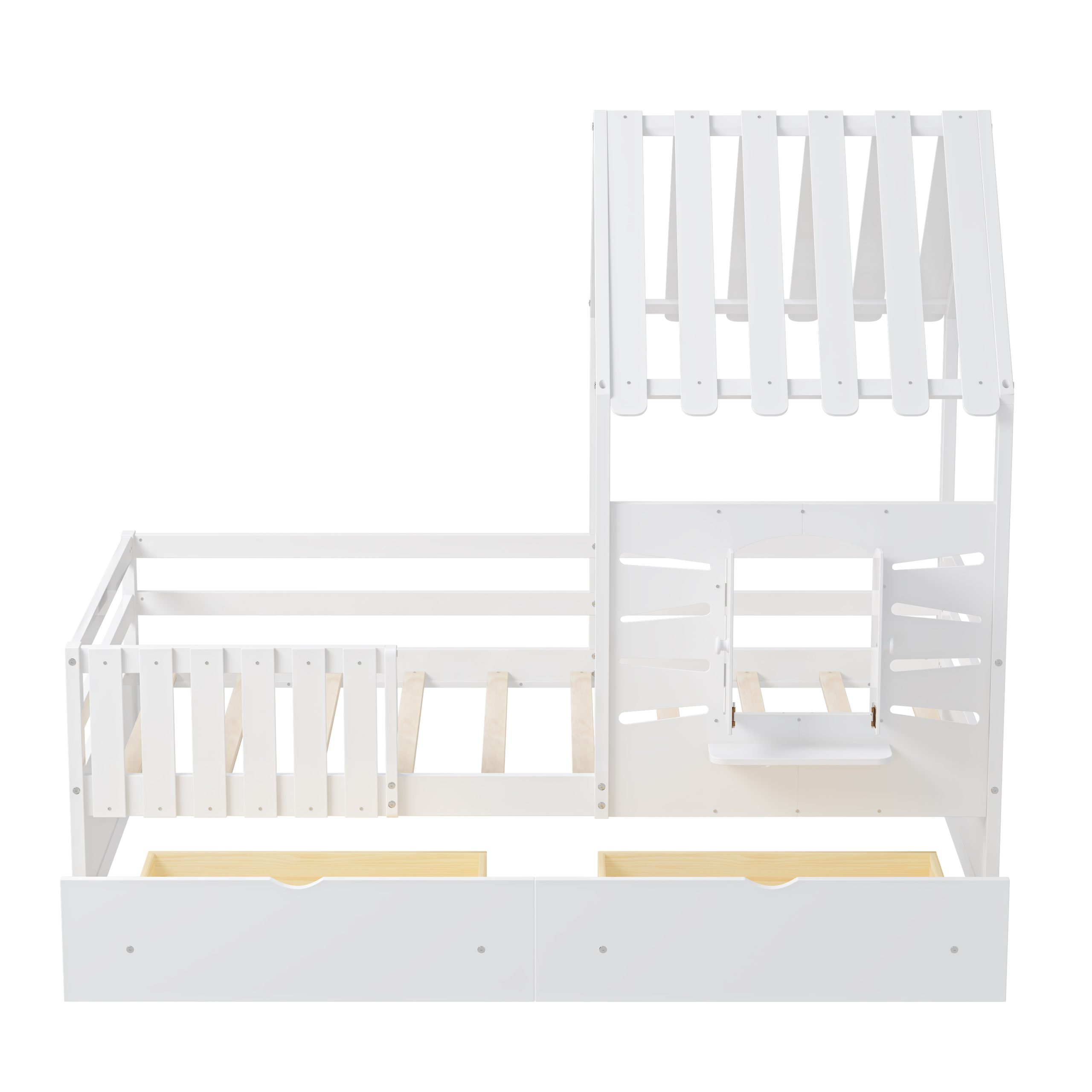 This twin-size house bed features a charming playhouse design with a pitched roof and a built-in window, creating a fun and cozy space for kids. Made from high-quality wood with sturdy guardrails, it ensures safety and durability. A small shelf below the window offers a spot for decorations, books, or toys, adding both function and charm. Two spacious pull-out drawers provide extra storage for clothes and bedding, keeping the room tidy. With a sturdy wooden slat system, it offers excellent mattress support without needing a box spring, making it a stylish and practical choice for any child’s bedroom.