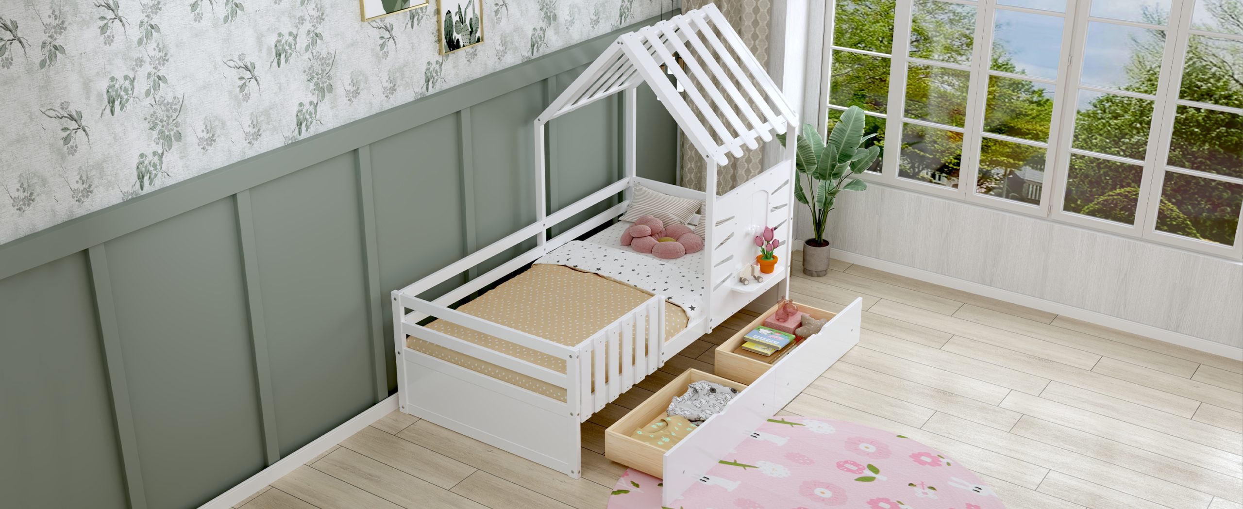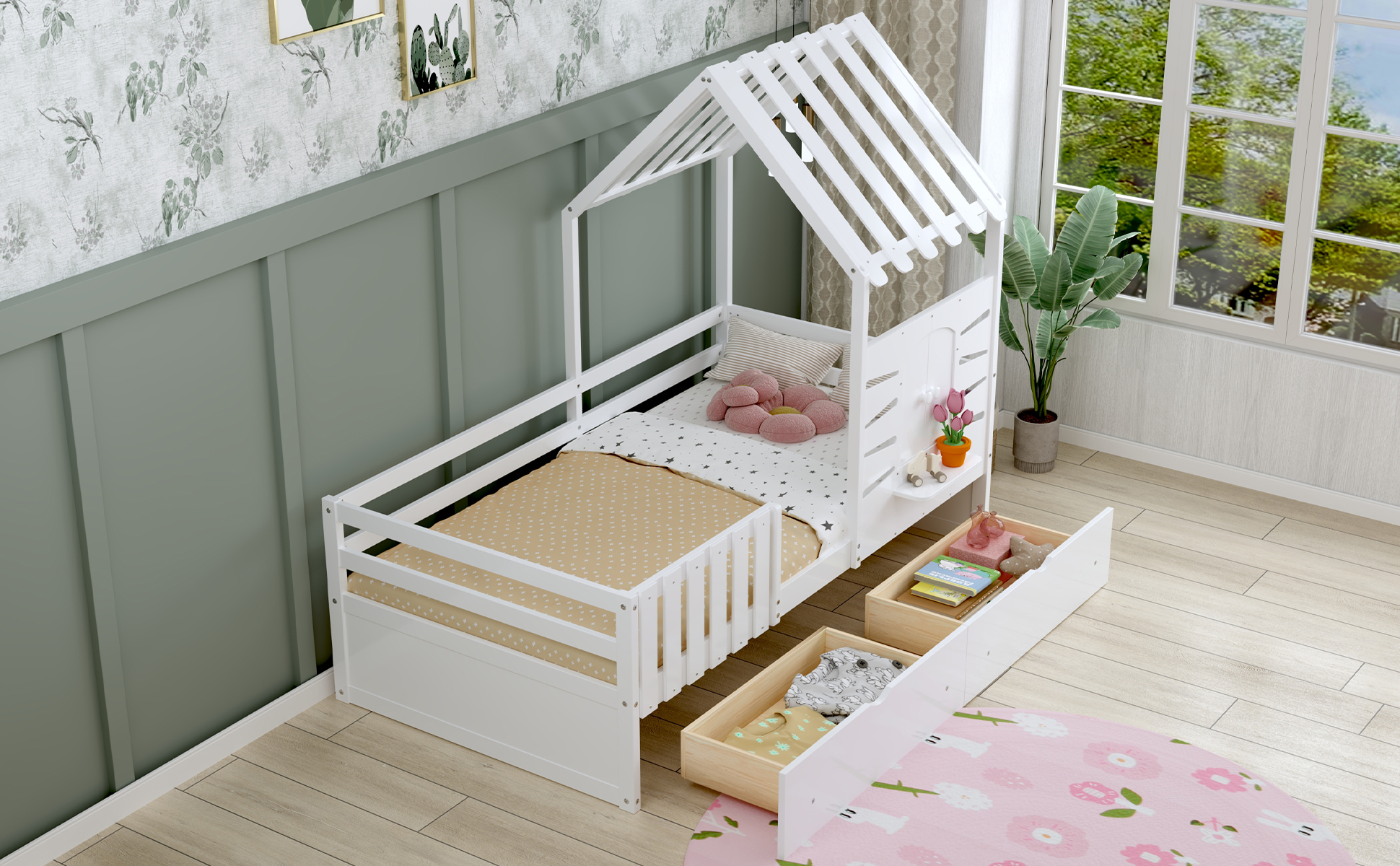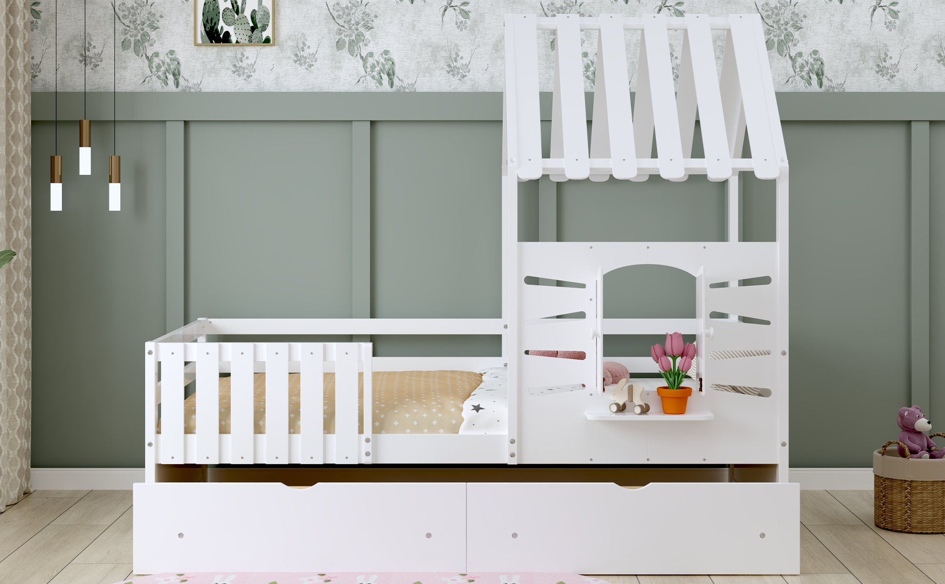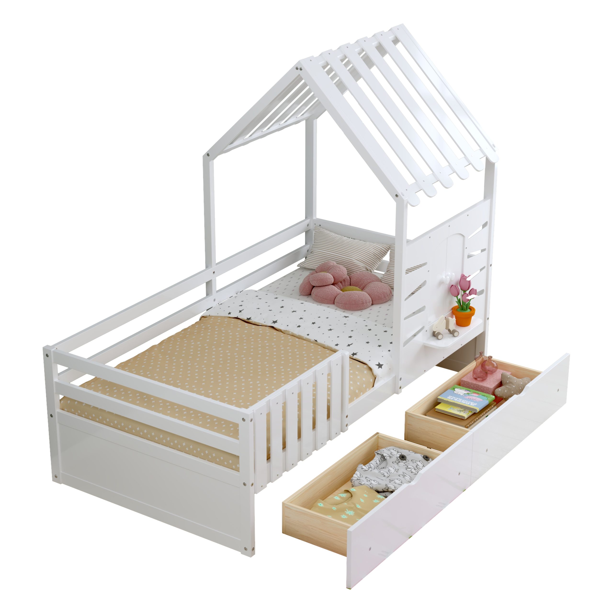 This twin-size house bed features a charming playhouse design with a pitched roof and a built-in window, creating a fun and cozy space for kids. Made from high-quality wood with sturdy guardrails, it ensures safety and durability. A small shelf below the window offers a spot for decorations, books, or toys, adding both function and charm. Two spacious pull-out drawers provide extra storage for clothes and bedding, keeping the room tidy. With a sturdy wooden slat system, it offers excellent mattress support without needing a box spring, making it a stylish and practical choice for any child’s bedroom.