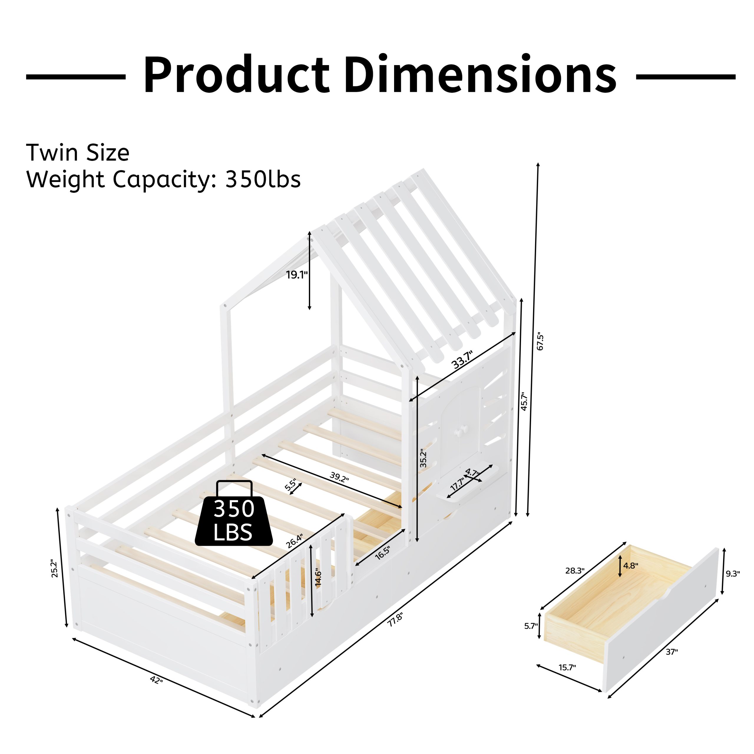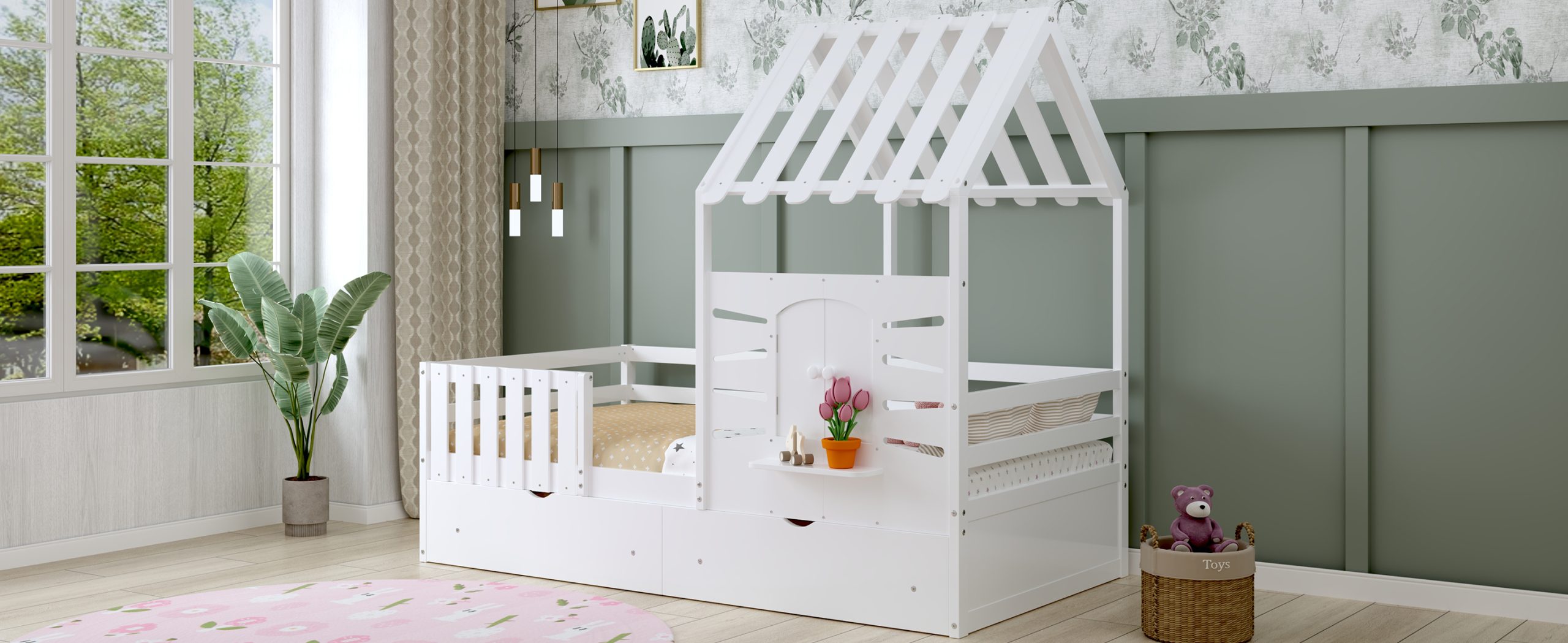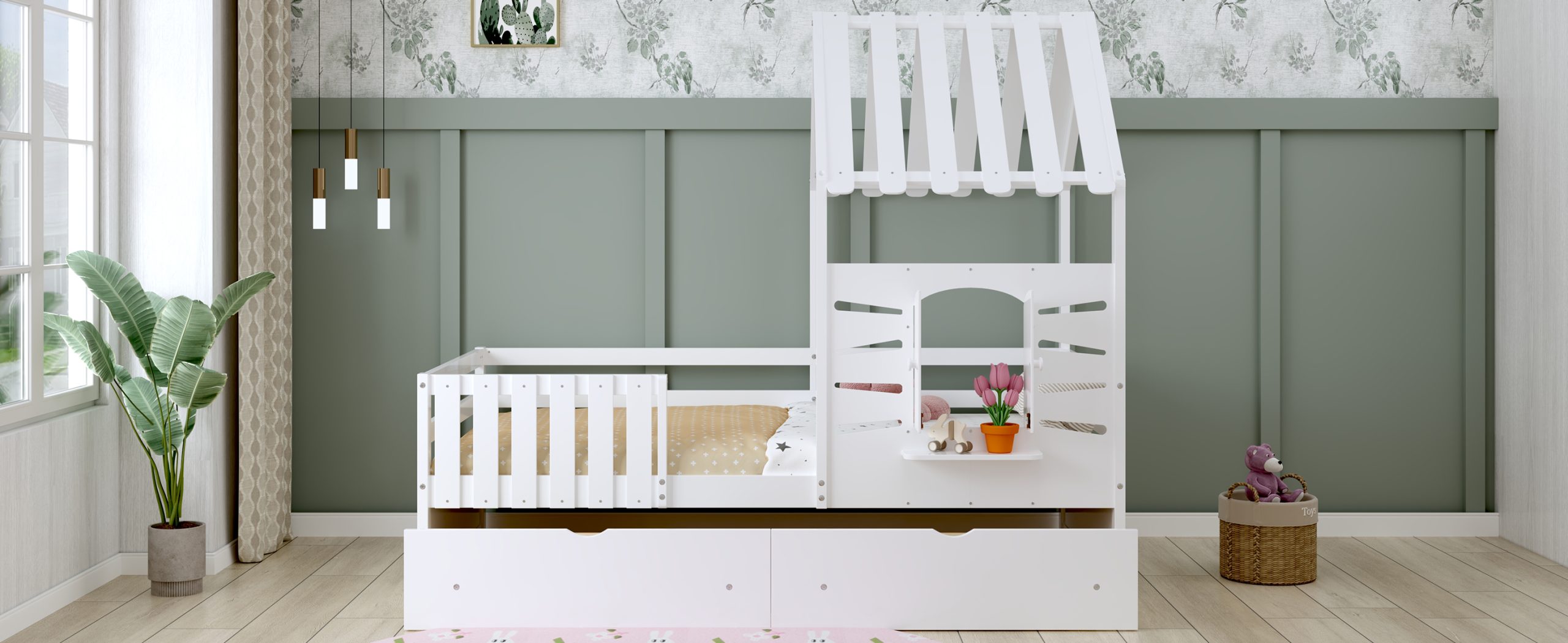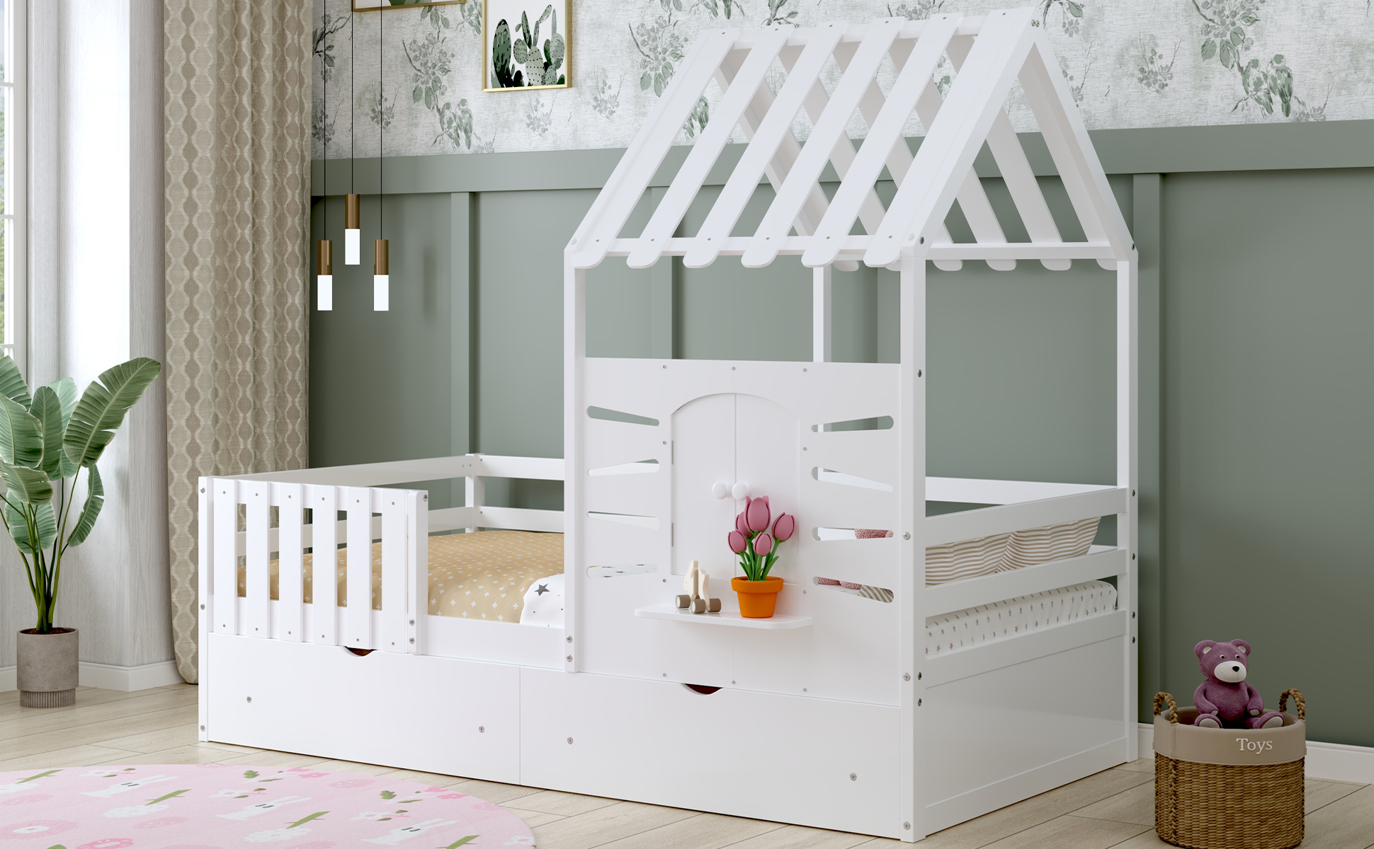 This twin-size house bed features a charming playhouse design with a pitched roof and a built-in window, creating a fun and cozy space for kids. Made from high-quality wood with sturdy guardrails, it ensures safety and durability. A small shelf below the window offers a spot for decorations, books, or toys, adding both function and charm. Two spacious pull-out drawers provide extra storage for clothes and bedding, keeping the room tidy. With a sturdy wooden slat system, it offers excellent mattress support without needing a box spring, making it a stylish and practical choice for any child’s bedroom.