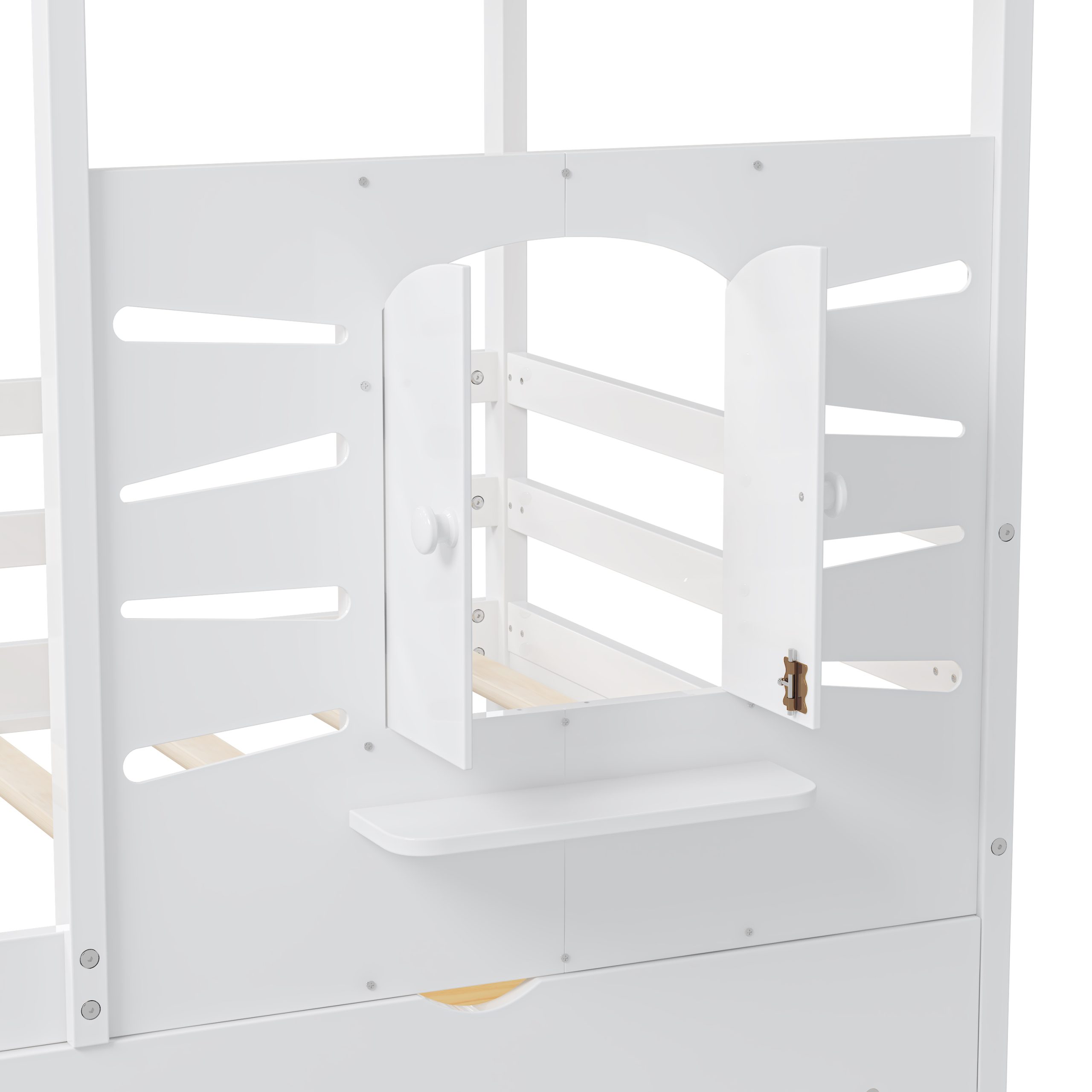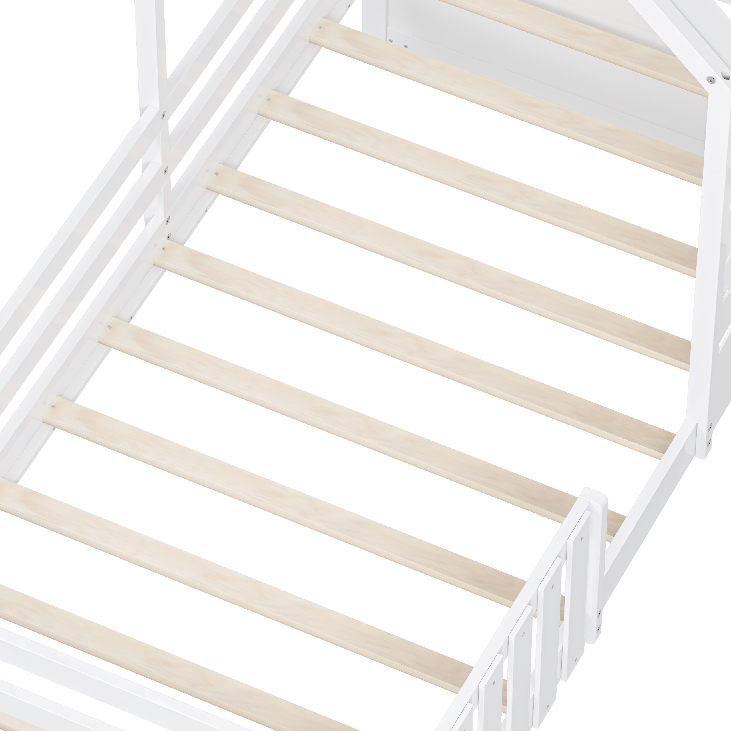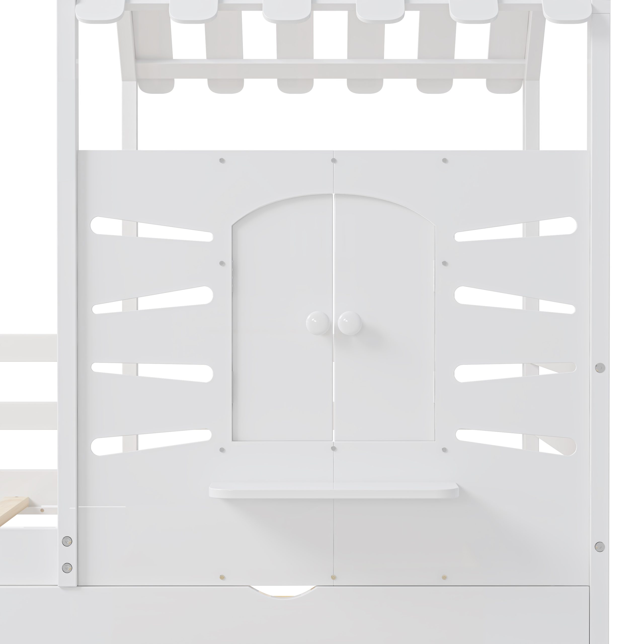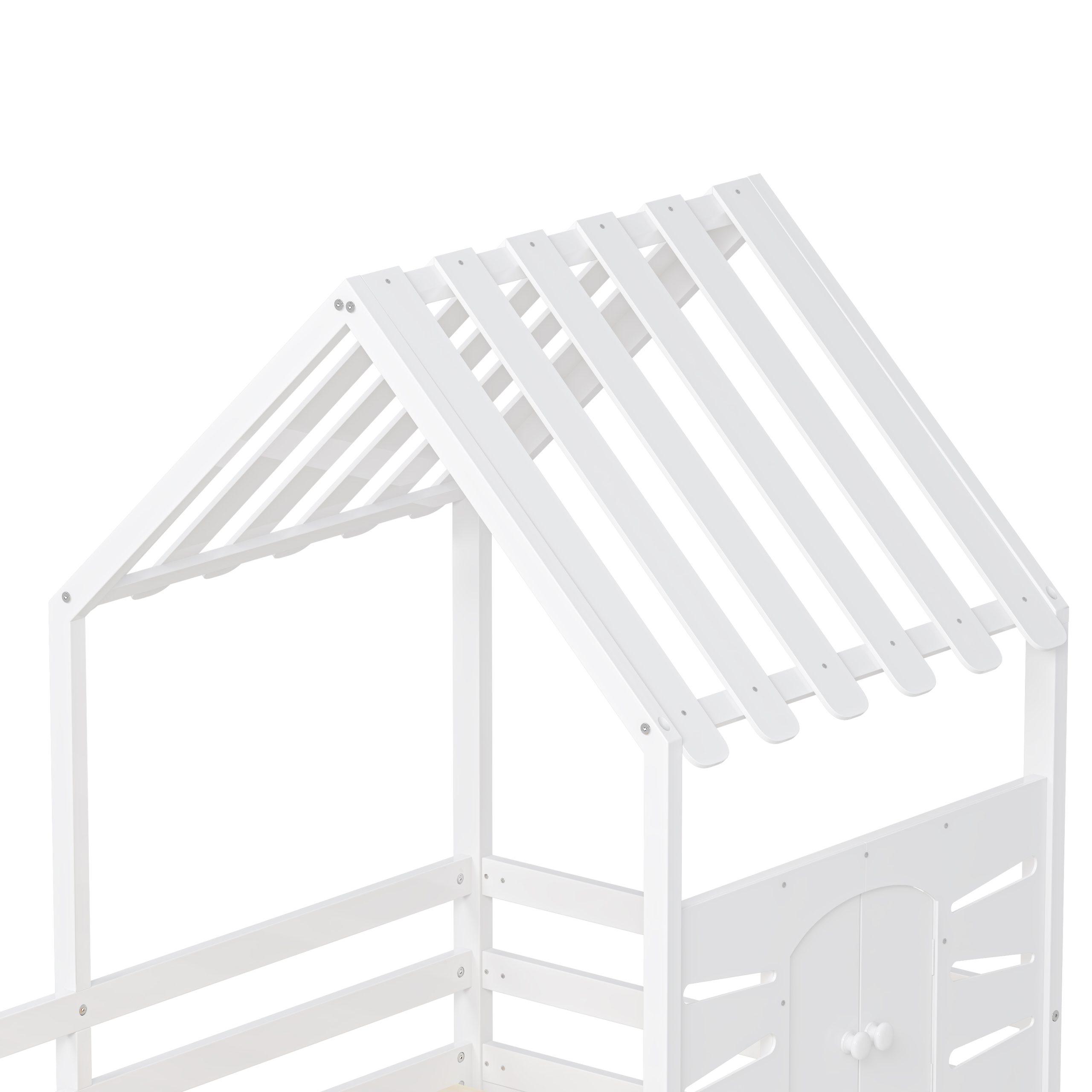 This twin-size house bed features a charming playhouse design with a pitched roof and a built-in window, creating a fun and cozy space for kids. Made from high-quality wood with sturdy guardrails, it ensures safety and durability. A small shelf below the window offers a spot for decorations, books, or toys, adding both function and charm. Two spacious pull-out drawers provide extra storage for clothes and bedding, keeping the room tidy. With a sturdy wooden slat system, it offers excellent mattress support without needing a box spring, making it a stylish and practical choice for any child’s bedroom.