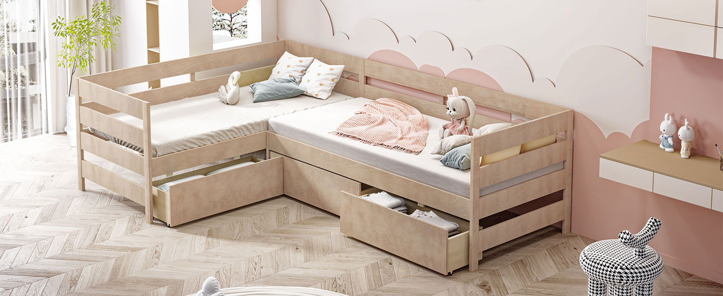 Twin Size L-Shaped Platform Bed With Three Storage Drawers