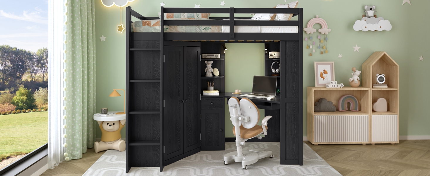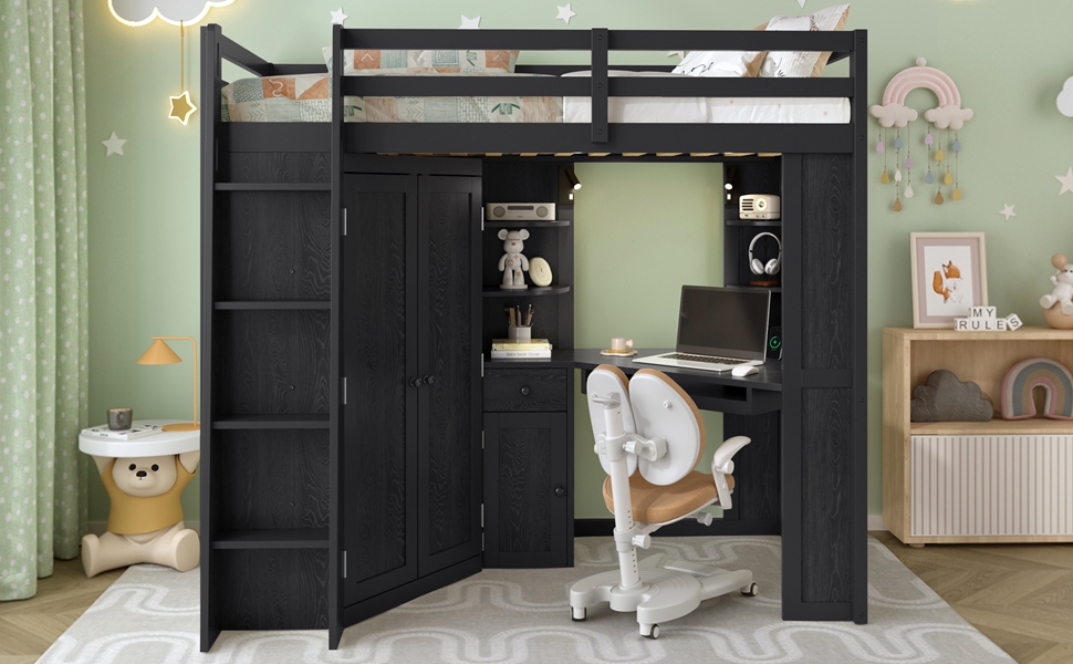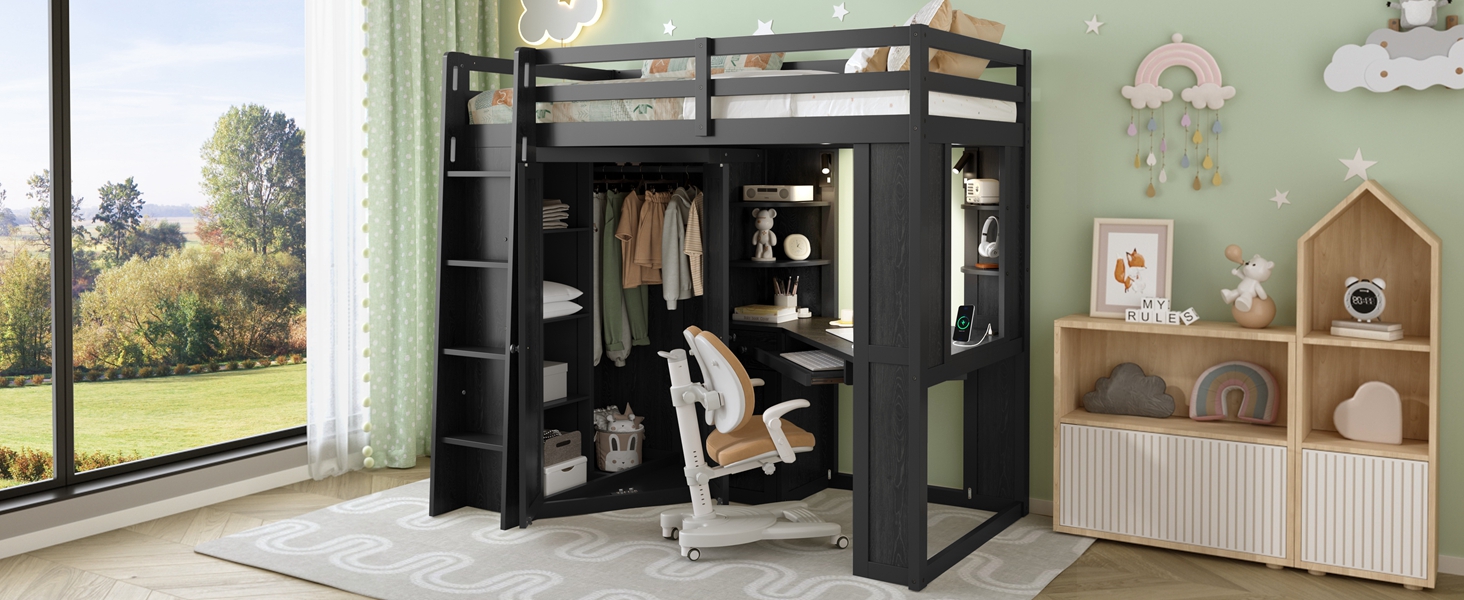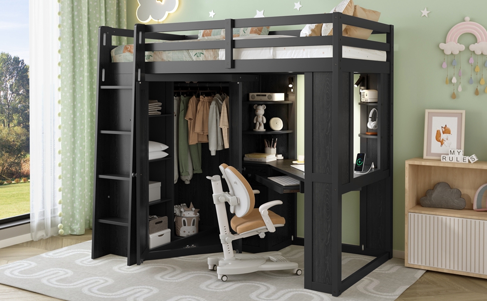 - Integrated Mega Wardrobe & Hanging Rail: The left section beneath the bed features a comprehensive large-scale wardrobe, a rare find in loft bed designs, which eliminates the need for an external closet, freeing up massive floor space in your room.. Equipped with a sturdy metal hanging rail and three built-in tiers of shelving, it provides ample vertical space to store everything from seasonal coats and long dresses to folded sweaters and storage bins.