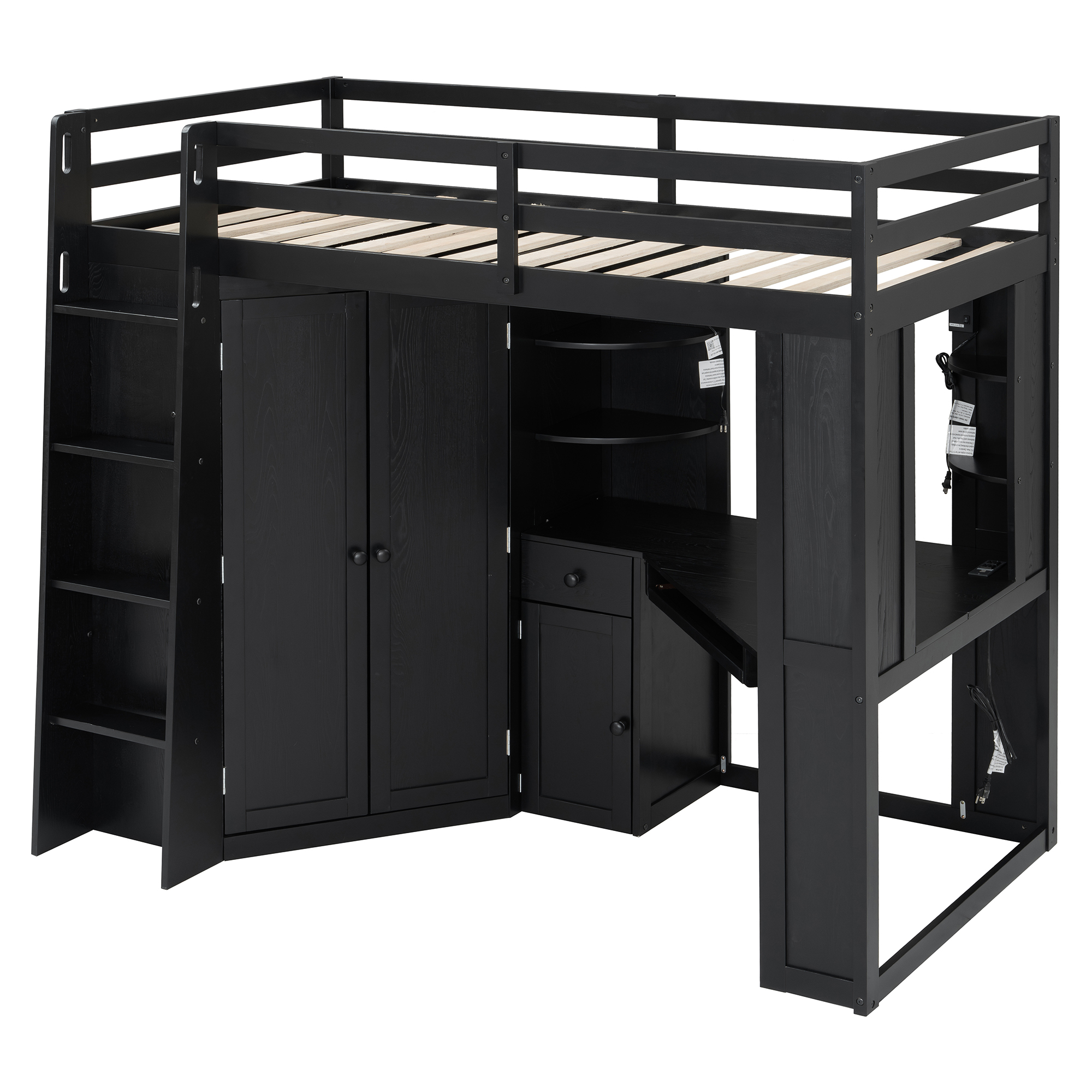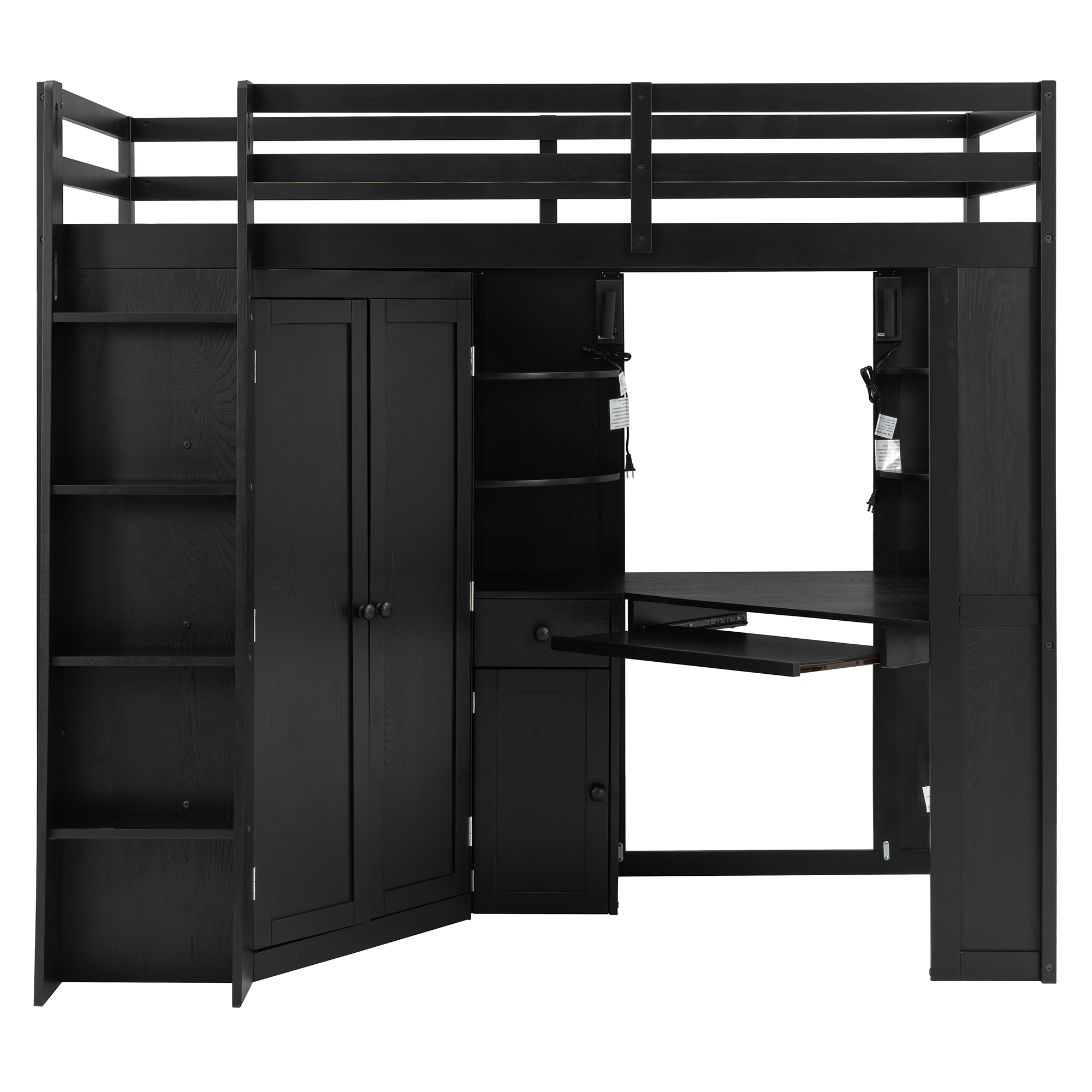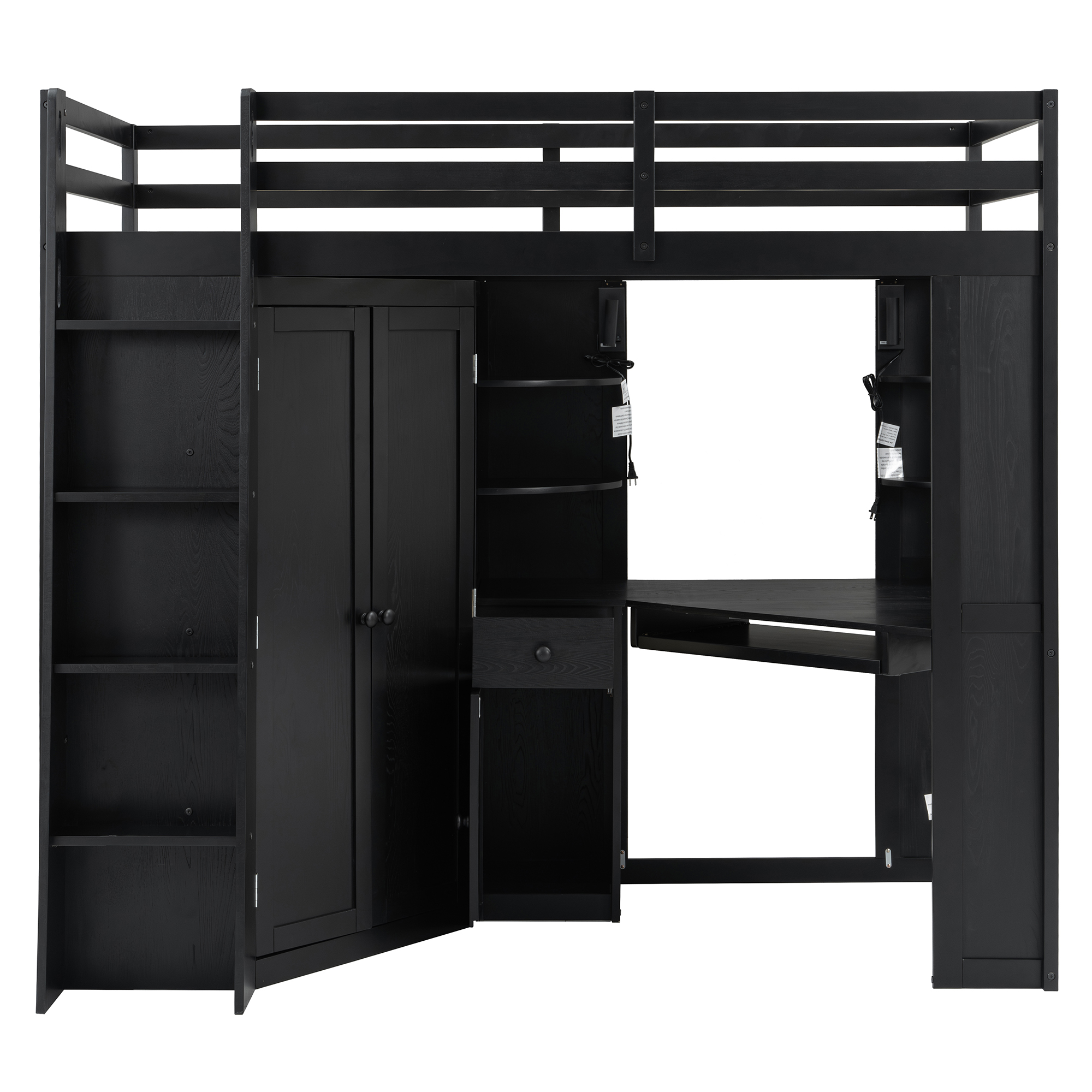 - Integrated Mega Wardrobe & Hanging Rail: The left section beneath the bed features a comprehensive large-scale wardrobe, a rare find in loft bed designs, which eliminates the need for an external closet, freeing up massive floor space in your room.. Equipped with a sturdy metal hanging rail and three built-in tiers of shelving, it provides ample vertical space to store everything from seasonal coats and long dresses to folded sweaters and storage bins.