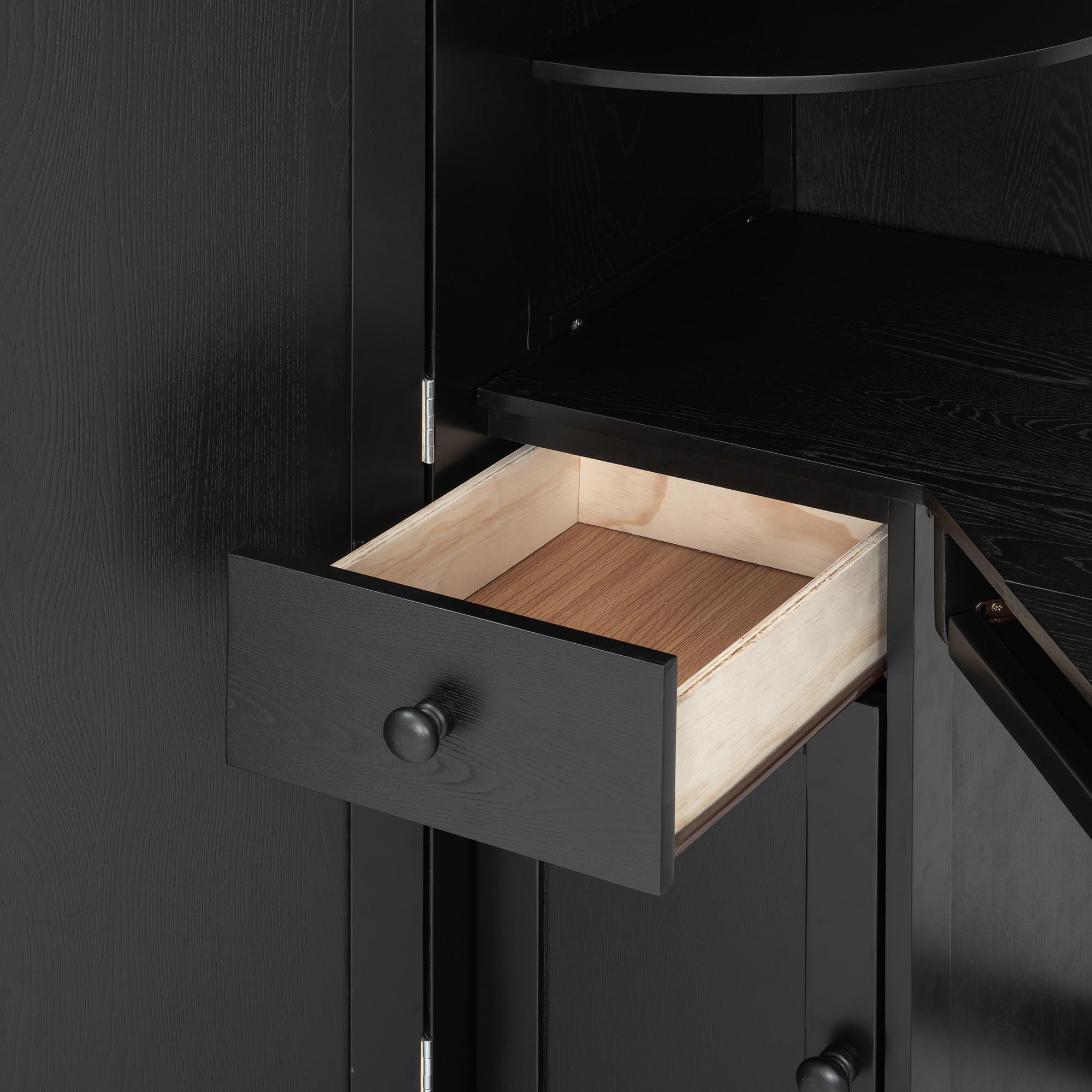 - Dual Adjustable Spotlights & Tiered Shelving: Lighting and organization are harmoniously combined. Two stylish, rotatable spotlights are mounted above the desk, providing focused illumination for late-night tasks without disturbing others. Complementing this are two tiers of shelving on both the left and right sides of the desk, plus a cabinet and a deep drawer below, offering a perfect home for your books, gadgets, and stationery.