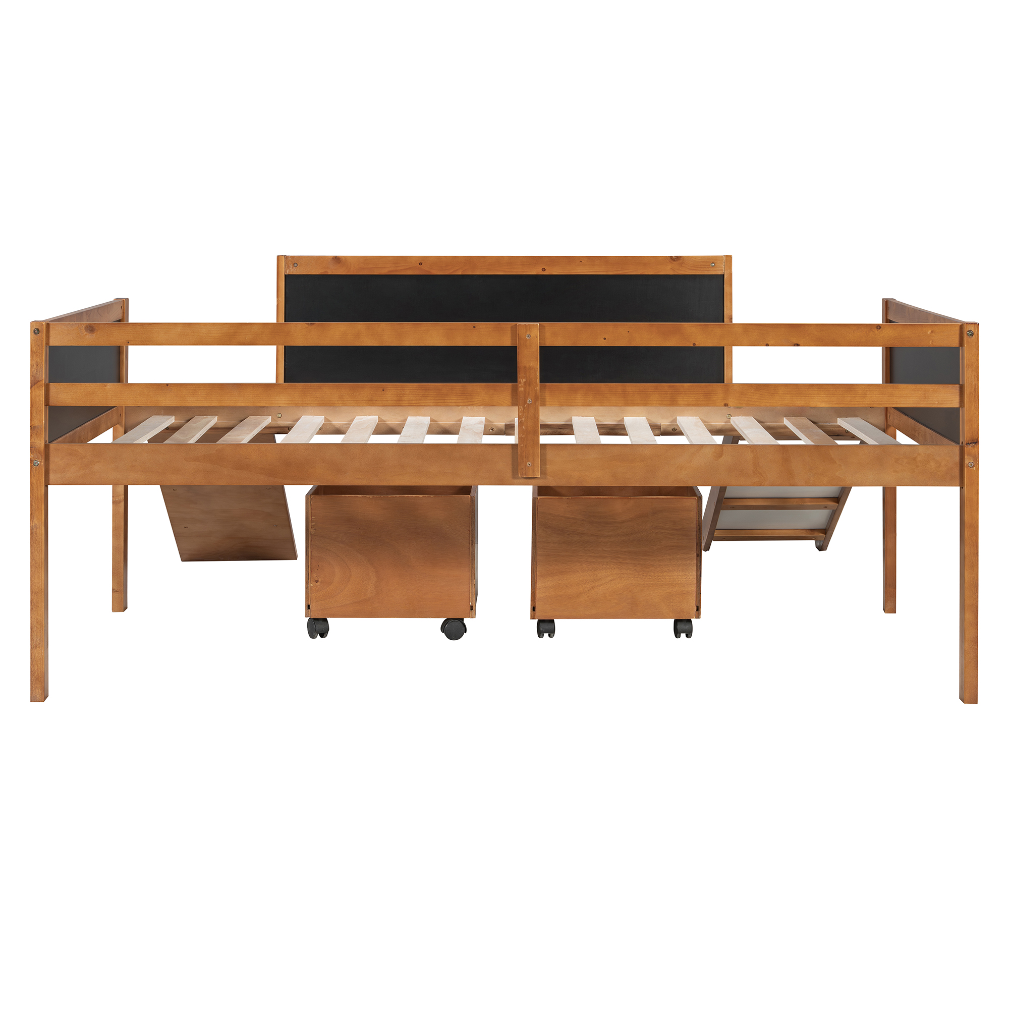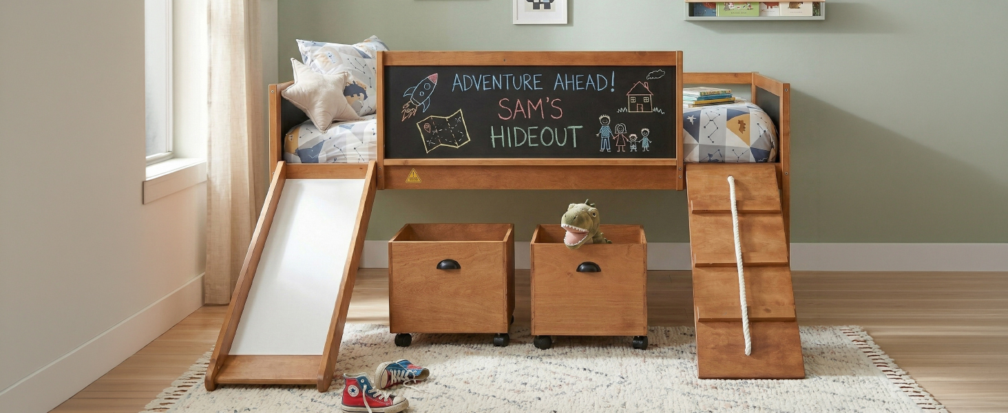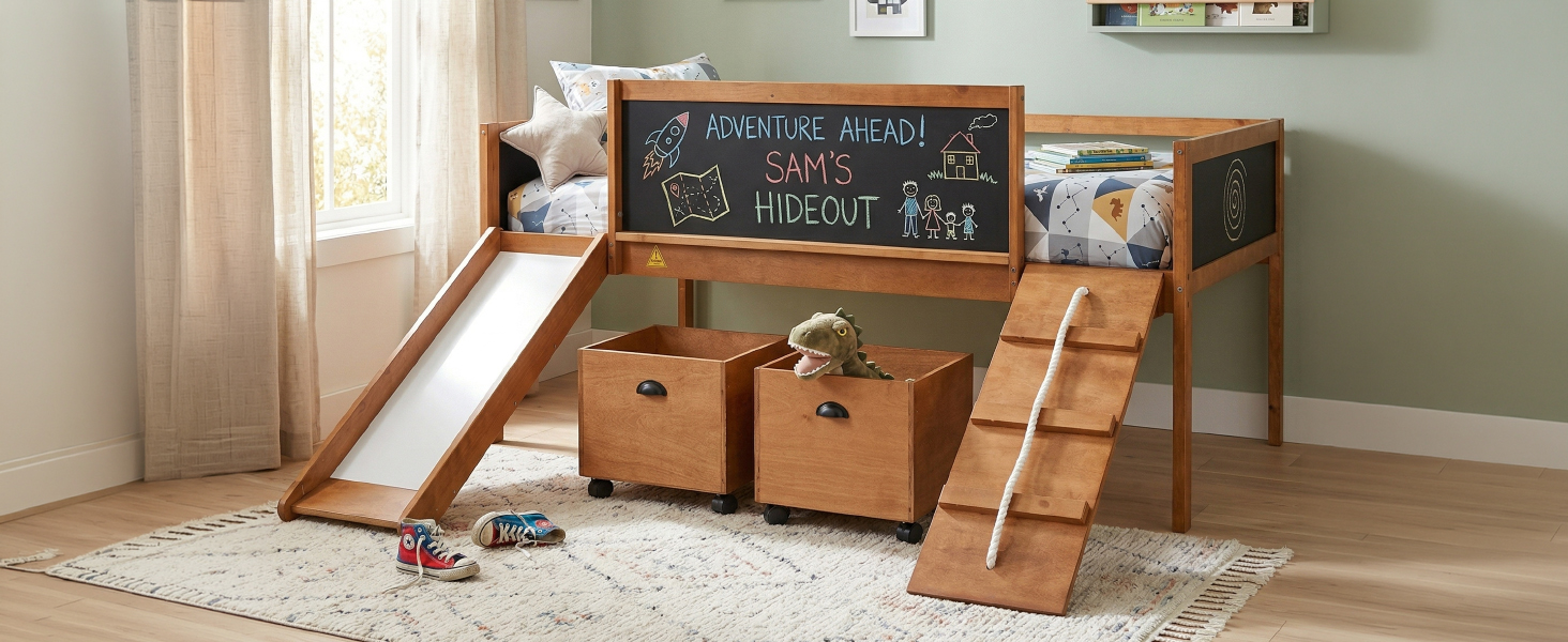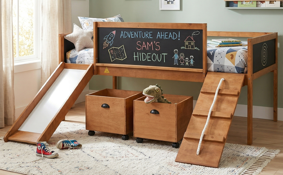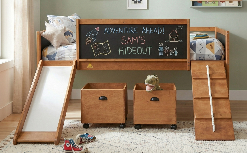 A novel idea be put into design when manufacturing this marvelous loft bed, a ladder be exchanged to a climbing frame which appealed to most people much more. And the way to get out of bed is sliding. This interesting design loft bed offer the chance to train your physical coordination in daily life and push them gain more happiness in bedroom. The double-sided chalkboard set on three sides allow you use your imagination and creativity at any time, and stimulate the potential of your brain. Additional storage boxes is another shining idea in design as they are great useful and helpful tools for parents. The open design storage boxes are the perfect space to store all sorts of toys and daily necessities. Four classic colors make you can choose your favorite color freely.