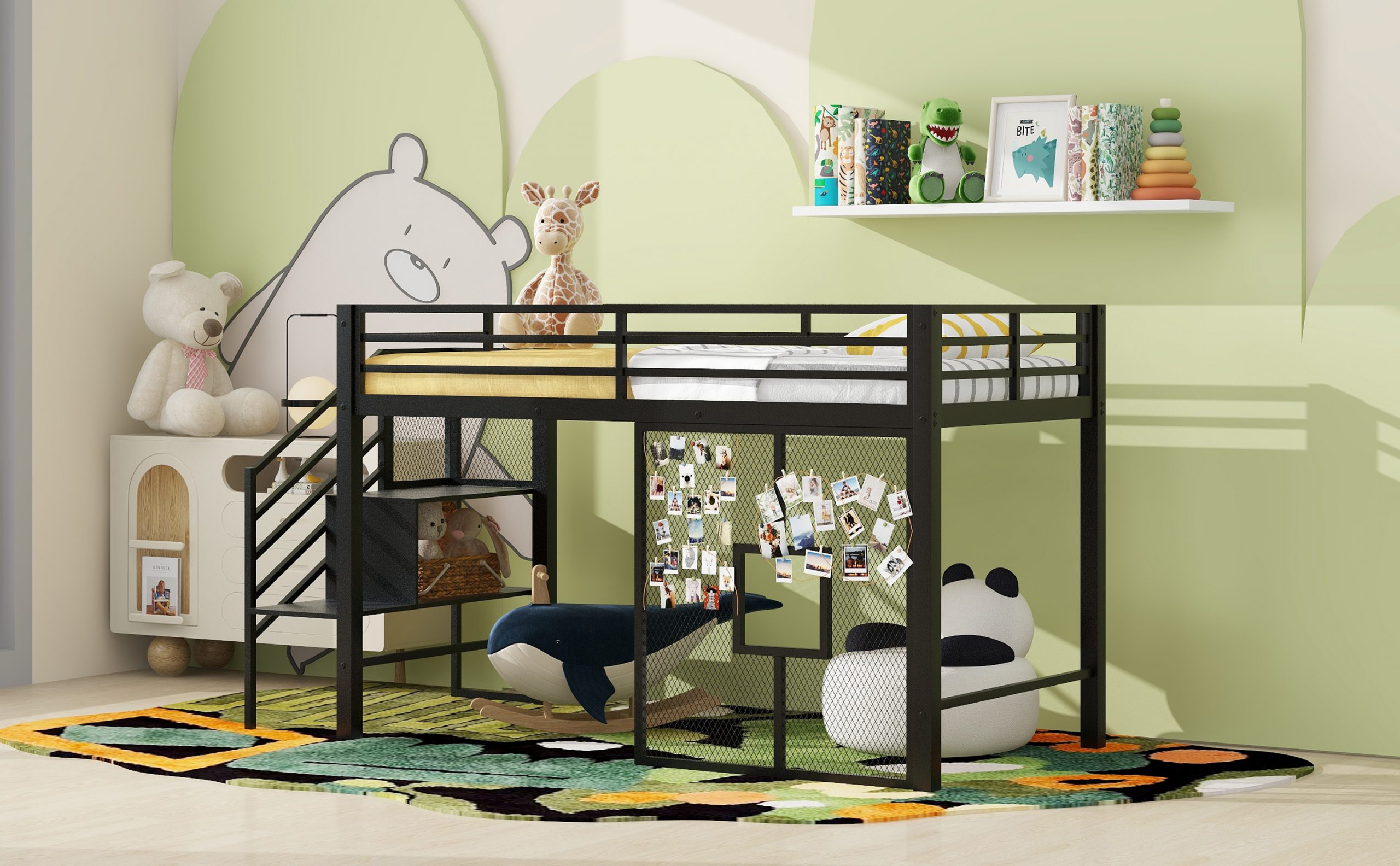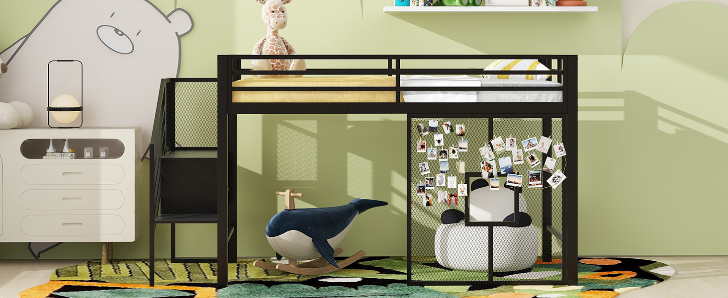 - [Safer for kids] The built-in 2-step ladder with smooth rounded edges offers comfortable,easy climbing.What’s more,this twin size loft bed with stair features full length guardrails to protect kids from falling off.