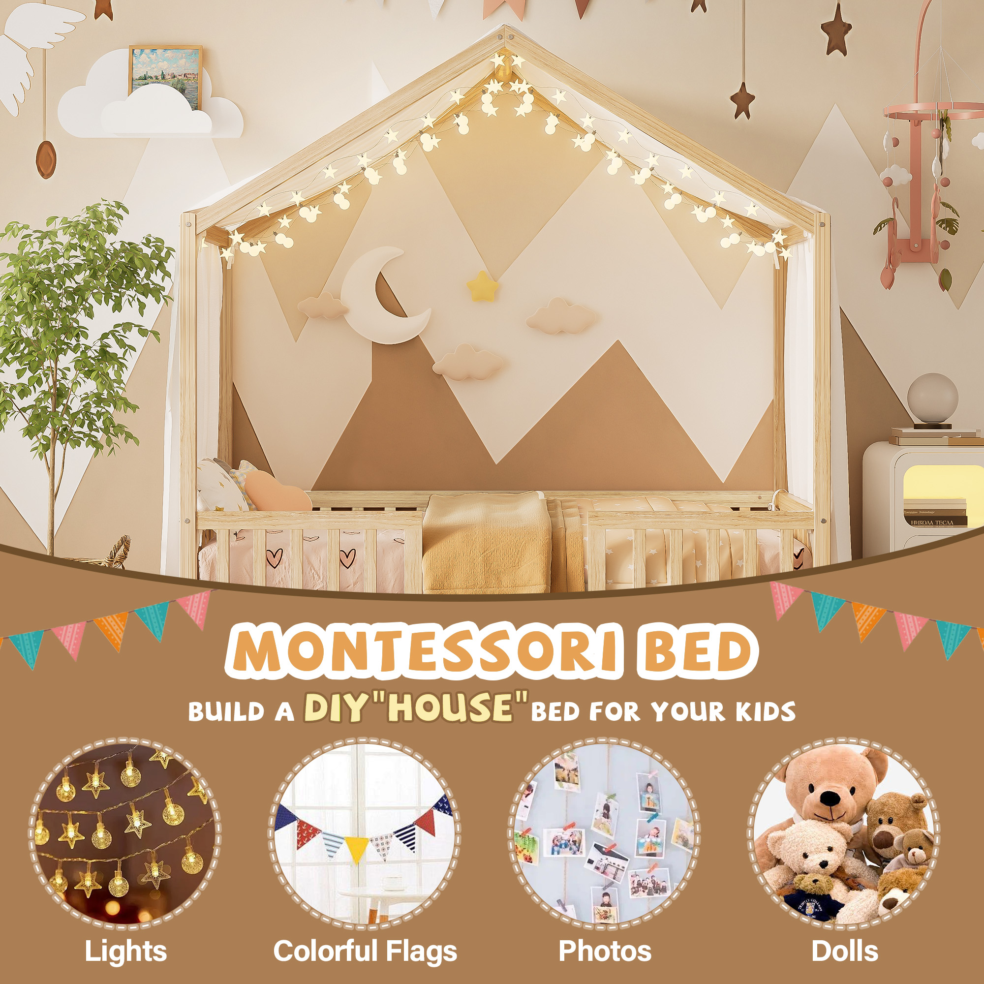 - [Twin Size House Bed for Kids]: Turn bedtime into a magical adventure with our wooden house-shaped bed! Its cute roof design isn’t just charming—it’s a canvas for creativity. Decorate the roof frame with toys, lights, or ornaments, and let your little one personalize their very own dream hideaway. Perfect for sparking imagination, this DIY-friendly bed makes every night fun, cozy, and uniquely theirs!