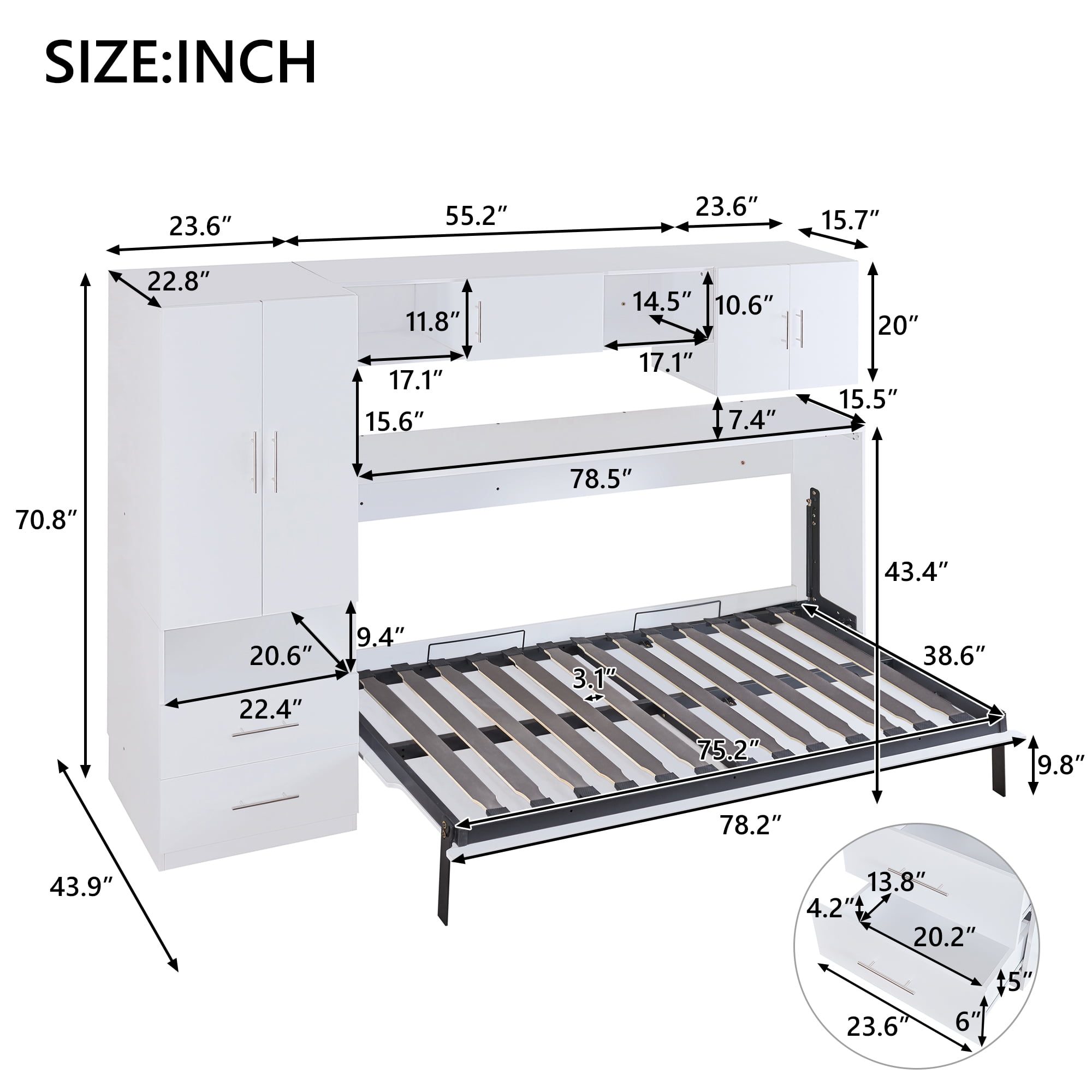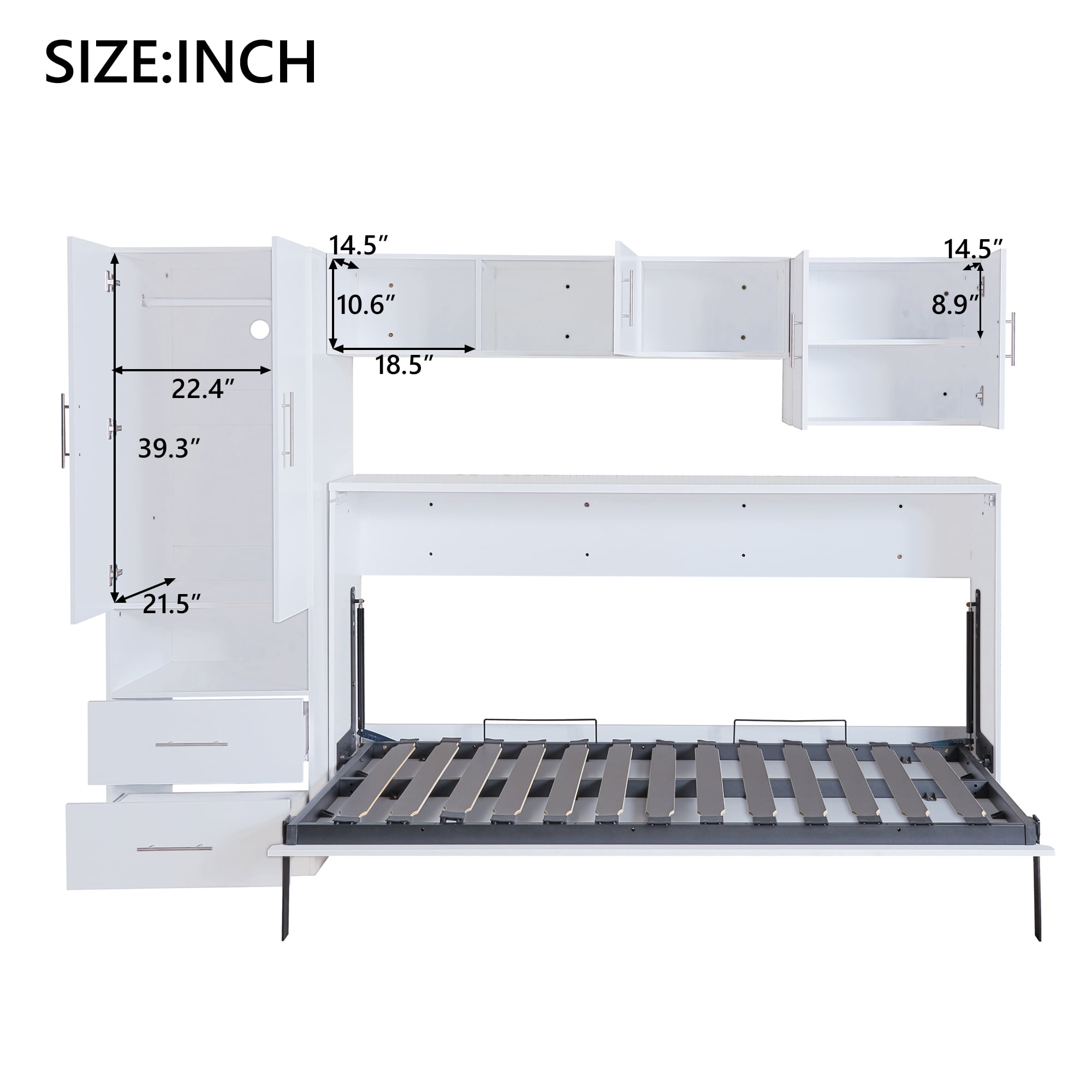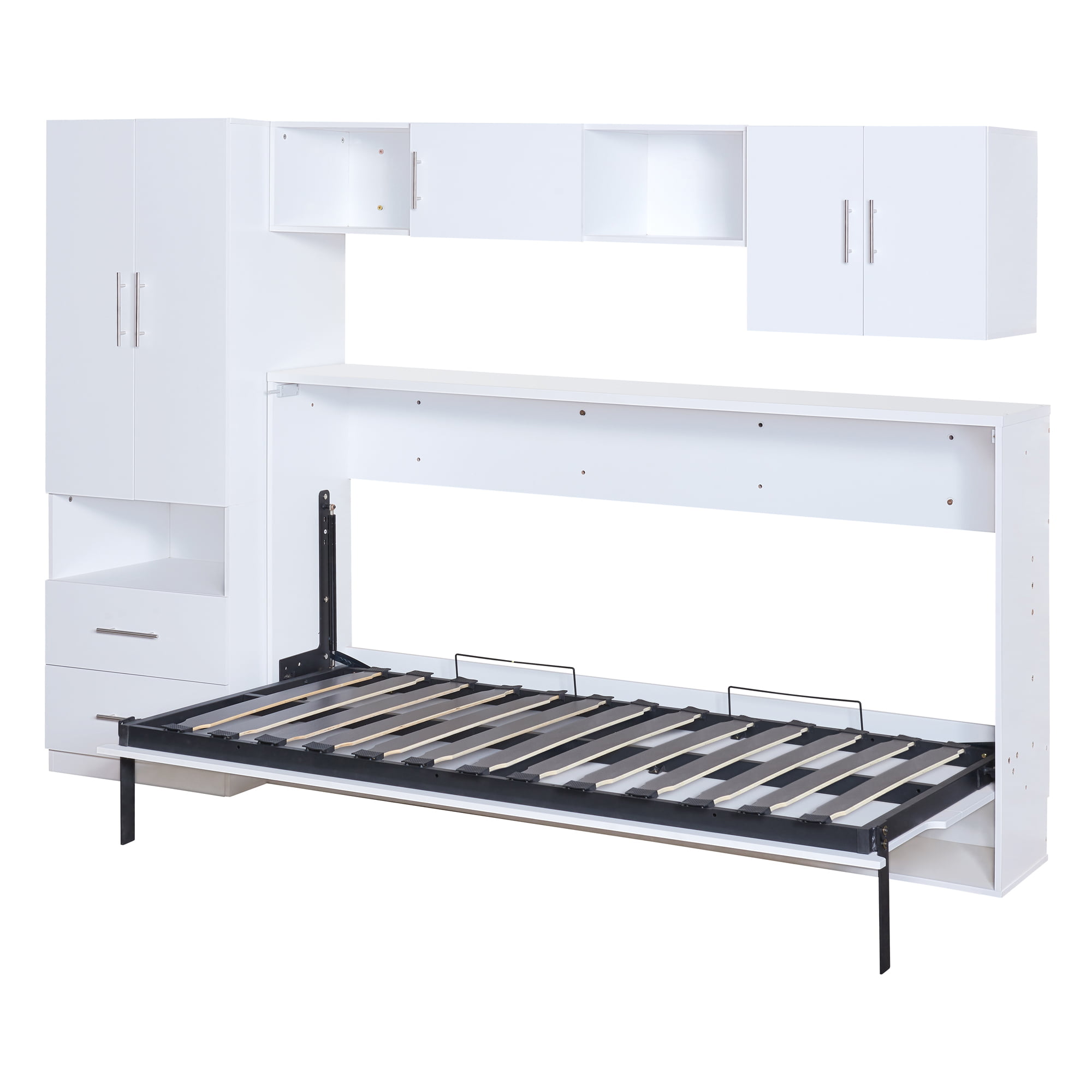 Twin Size Murphy Bed with Open Shelves and Storage Drawers, Built-in Wardrobe and Table