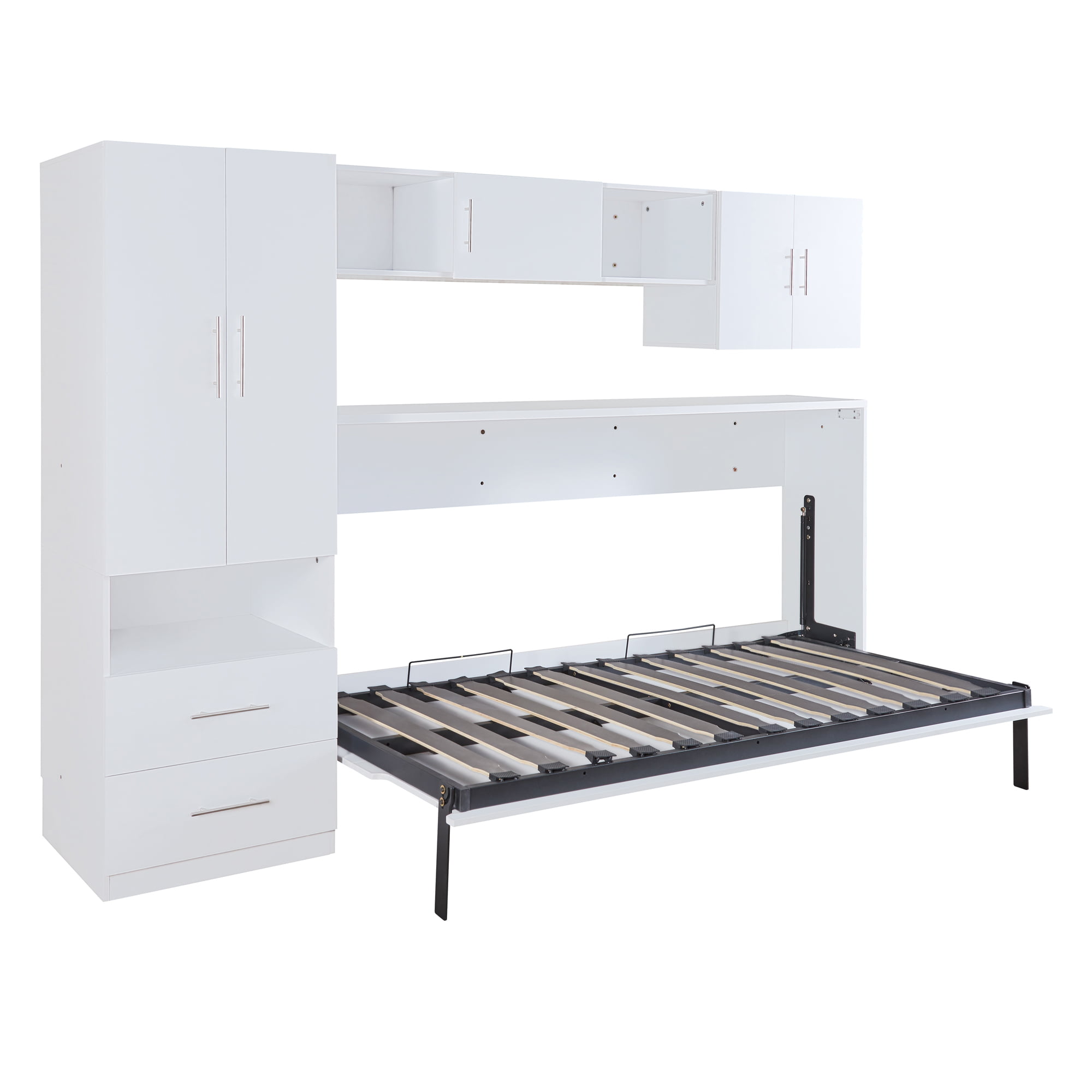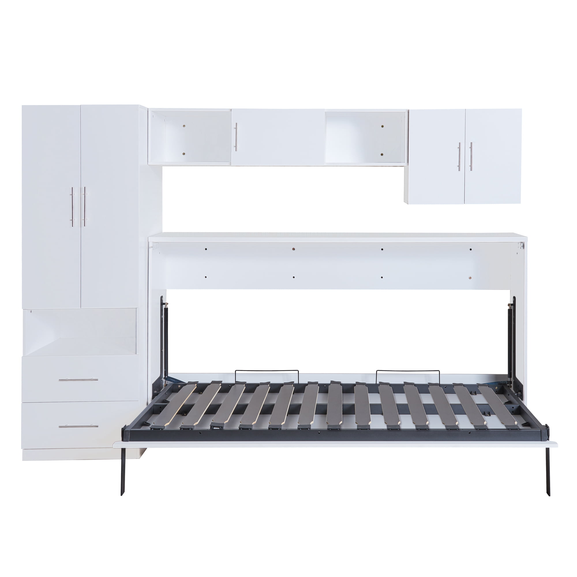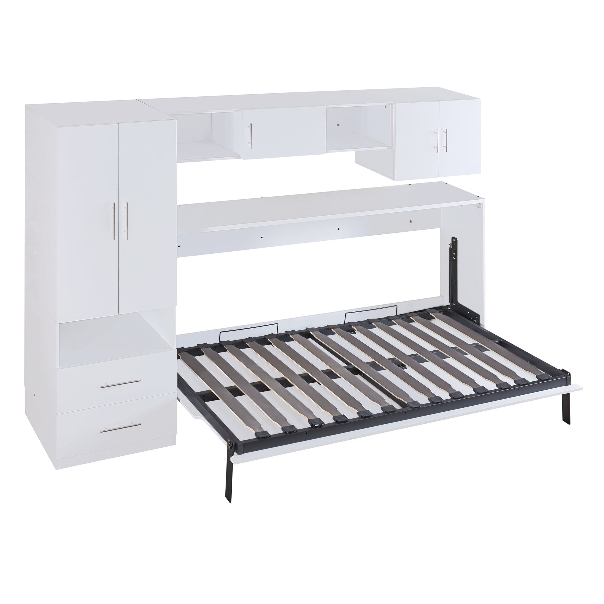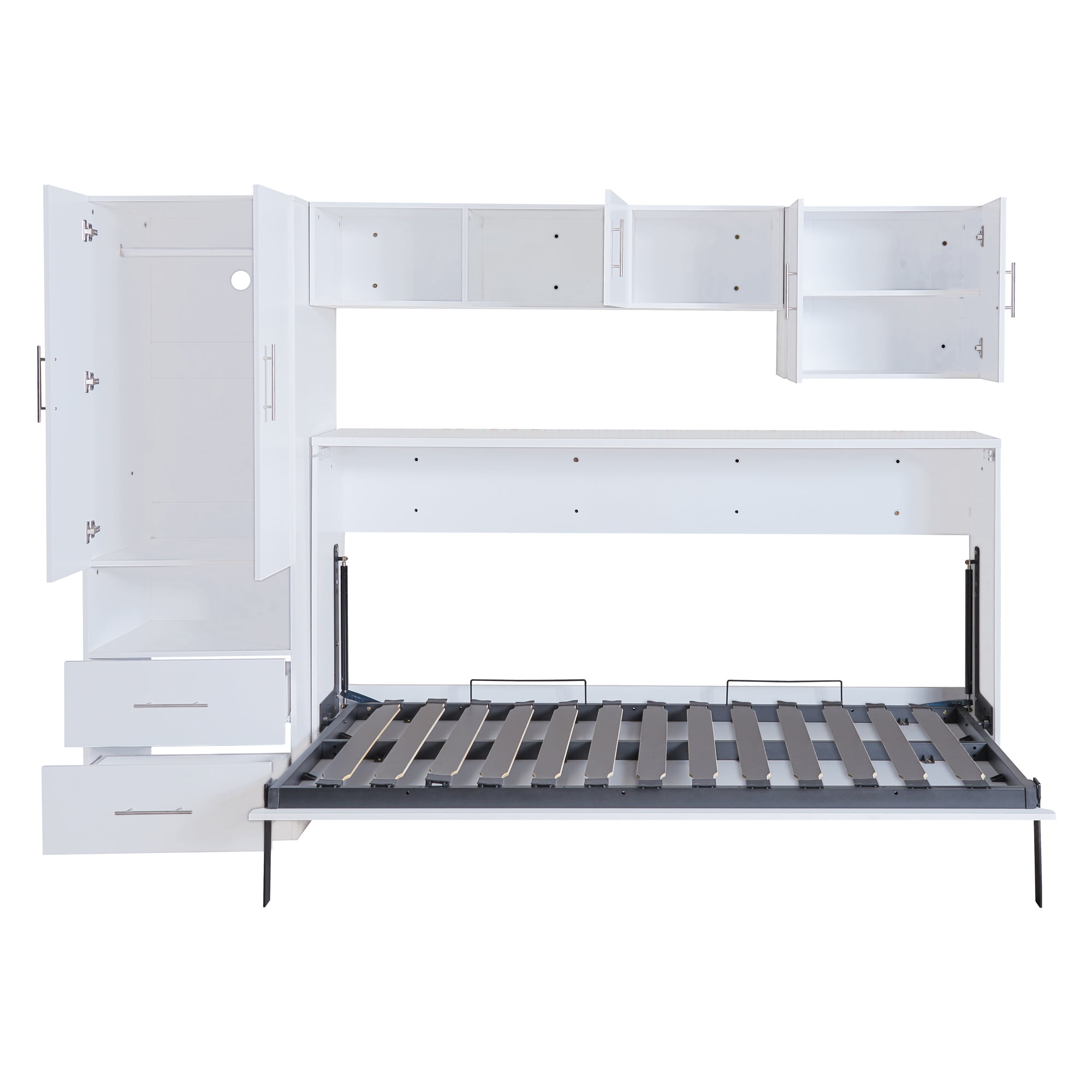 Twin Size Murphy Bed with Open Shelves and Storage Drawers, Built-in Wardrobe and Table