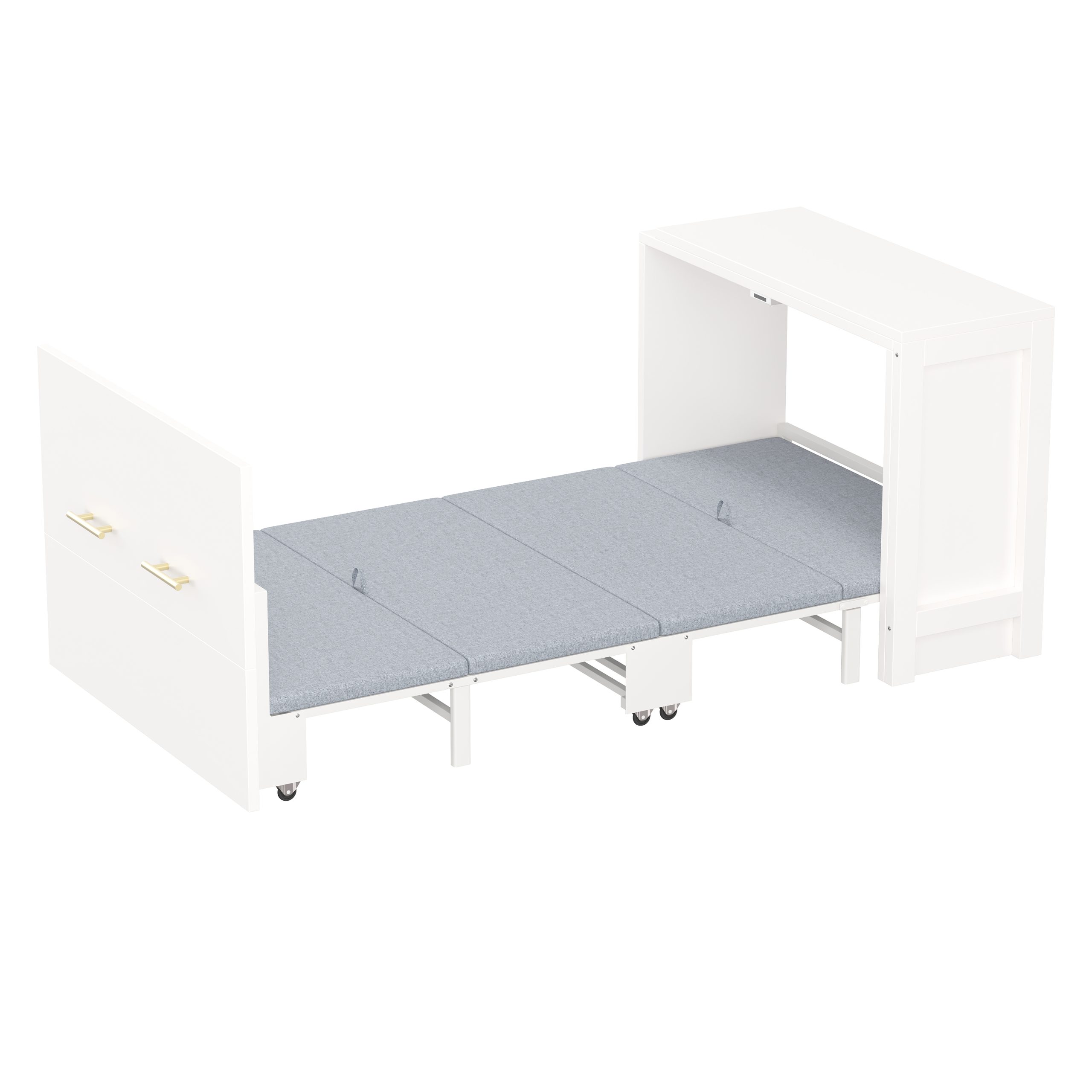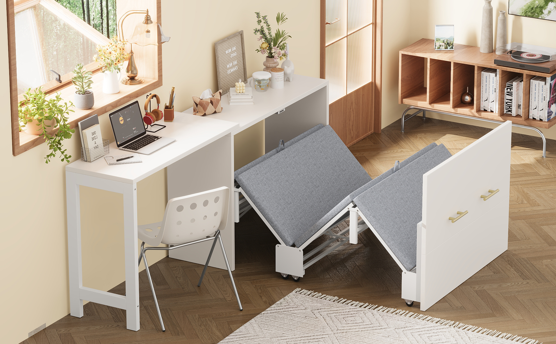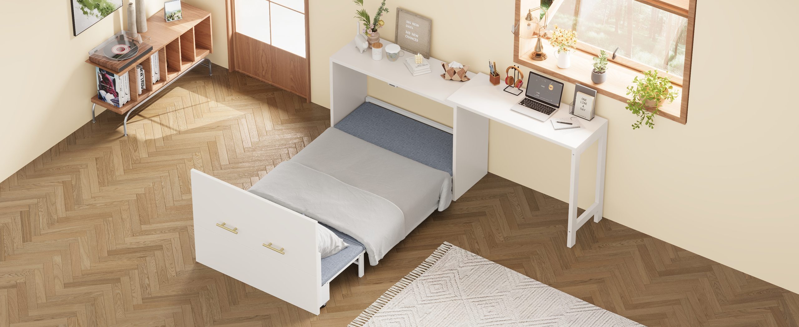 - Twin Size Murphy Cabinet Bed:This versatile Murphy bed seamlessly transforms to meet your needs. When closed, it functions as a stylish combination of a dresser and a desk — perfect for daily use in compact spaces. When opened, it becomes a comfortable bed while still keeping the desk accessible. A true space-saving solution that blends functionality and modern design, ideal for small apartments, guest rooms, or home offices.