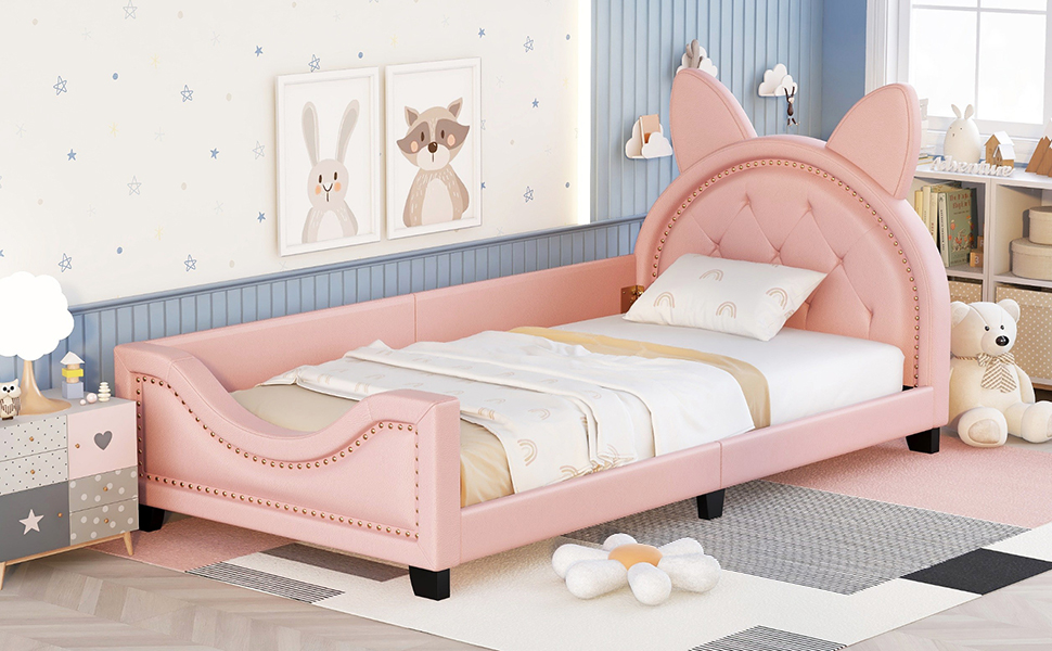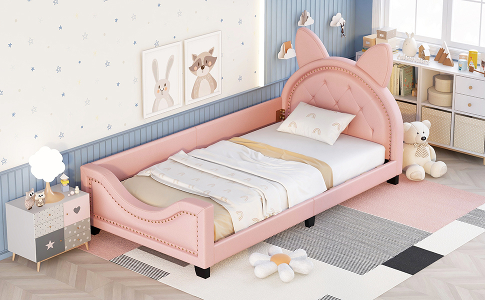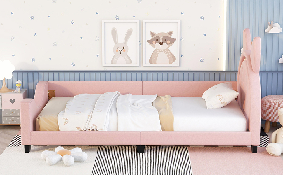 This twin daybed with bunny ears headboard is perfect for any modern kids room. The daybed features a strong wood frame that is built to last, while plush padding provides extra comfort and security. and is easy to assemble.
