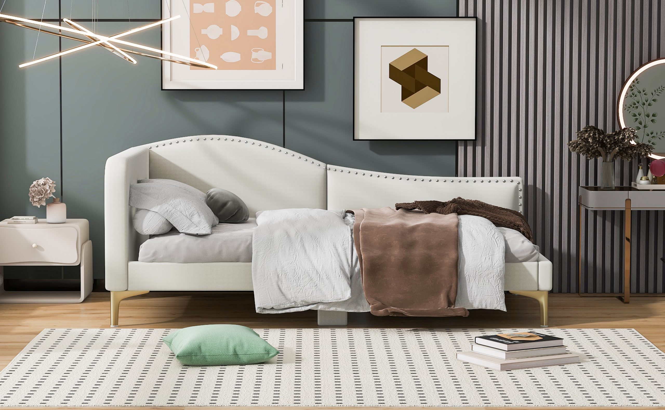 (Price Includes Shipping, No Tax Fee.)Playing the part of sofa and bed, daybeds are a fantastic solution for smaller spaces (think: studio apartments, guest rooms, home offices, etc.). They offer a cozy spot to curl up with a good book or catch a quick catnap, and they provide convenient sleeping arrangements for overnight guests during sleepovers and beyond. This one, for example, is crafted from a blend of solid pine wood and MDF and features a linen-blend upholstery awash in a solid finish. Its modern design, spacious sleeping area, and safety features, including guardrails, ensure a remarkable addition to your living space. Specifically designed for indoor spaces, it’s a fantastic addition to bedrooms, living rooms, or guest rooms.