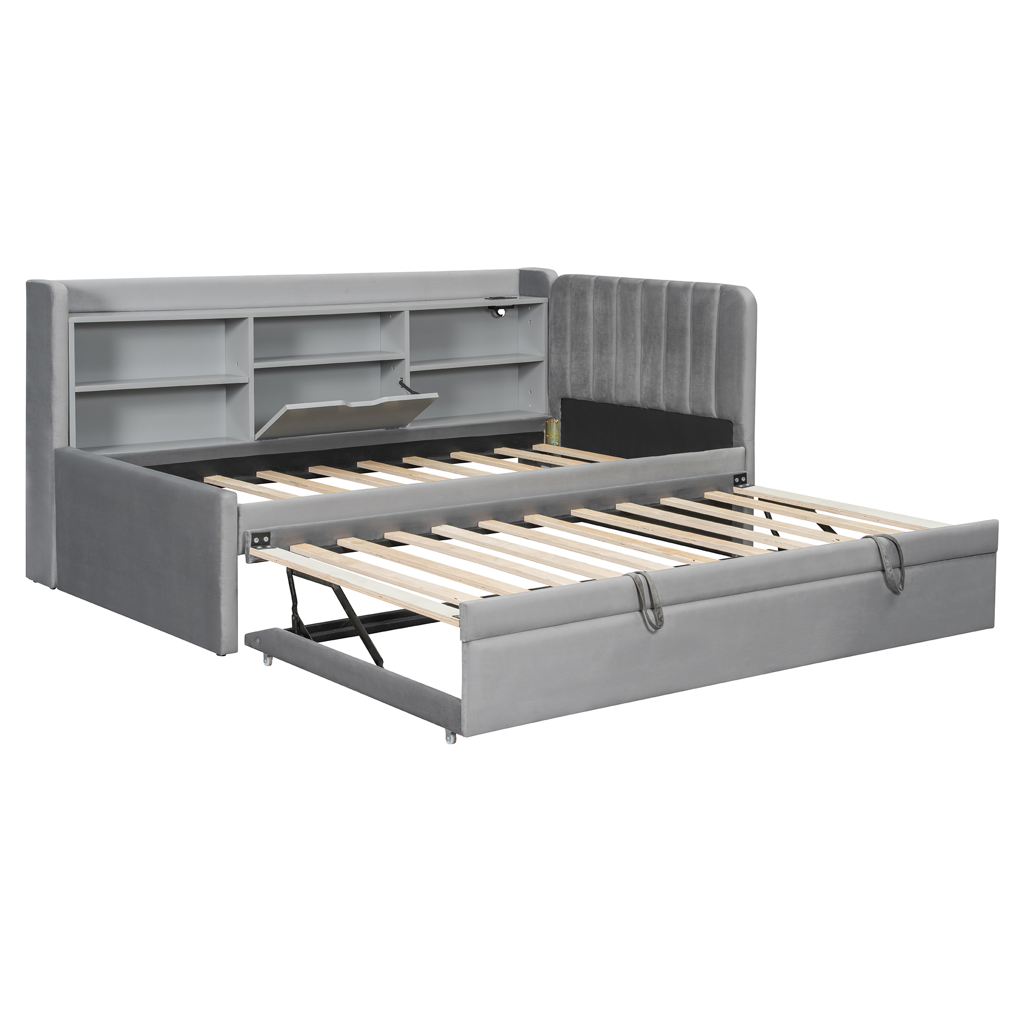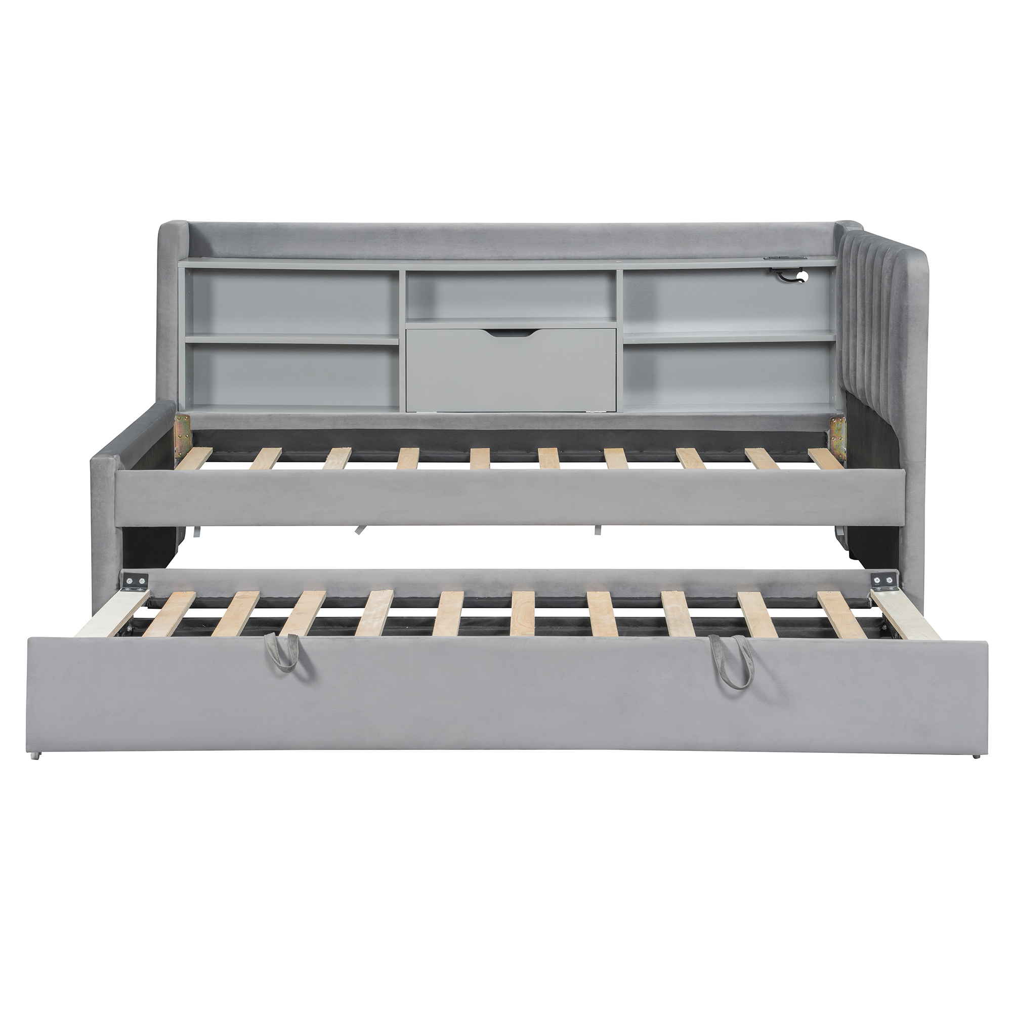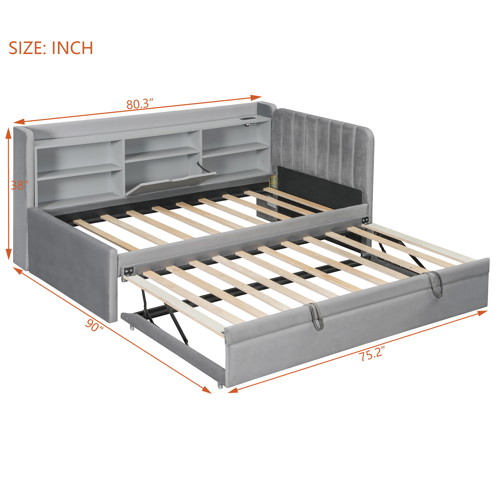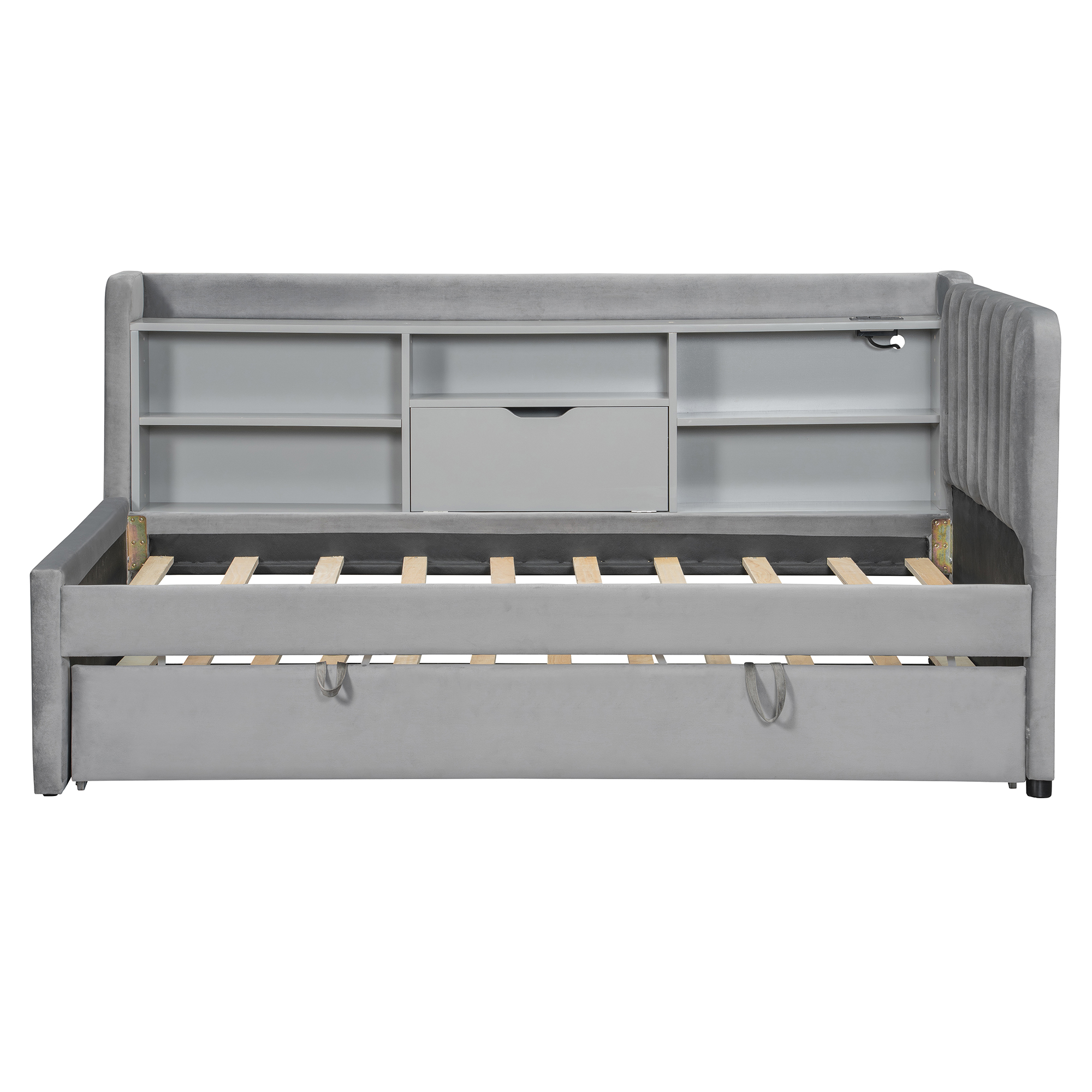 (Price Includes Shipping, No Tax Fee.)Upgrade your space with this Twin Size Upholstered Daybed with Pull-Up Trundle, designed for both comfort and convenience. Wrapped in soft velvet fabric for a plush, modern look, this daybed features a hidden twin-size trundle that lifts up to create additional sleeping space — perfect for sleepovers or guests. The high backrest is equipped with multiple open storage shelves and a flip-top storage compartment, ideal for keeping books, decor, or essentials close at hand. Plus, integrated USB ports and power outlets make it easy to charge devices or plug in a lamp. Ideal for bedrooms, guest rooms, or home offices, this multifunctional piece brings smart storage and style to any room.