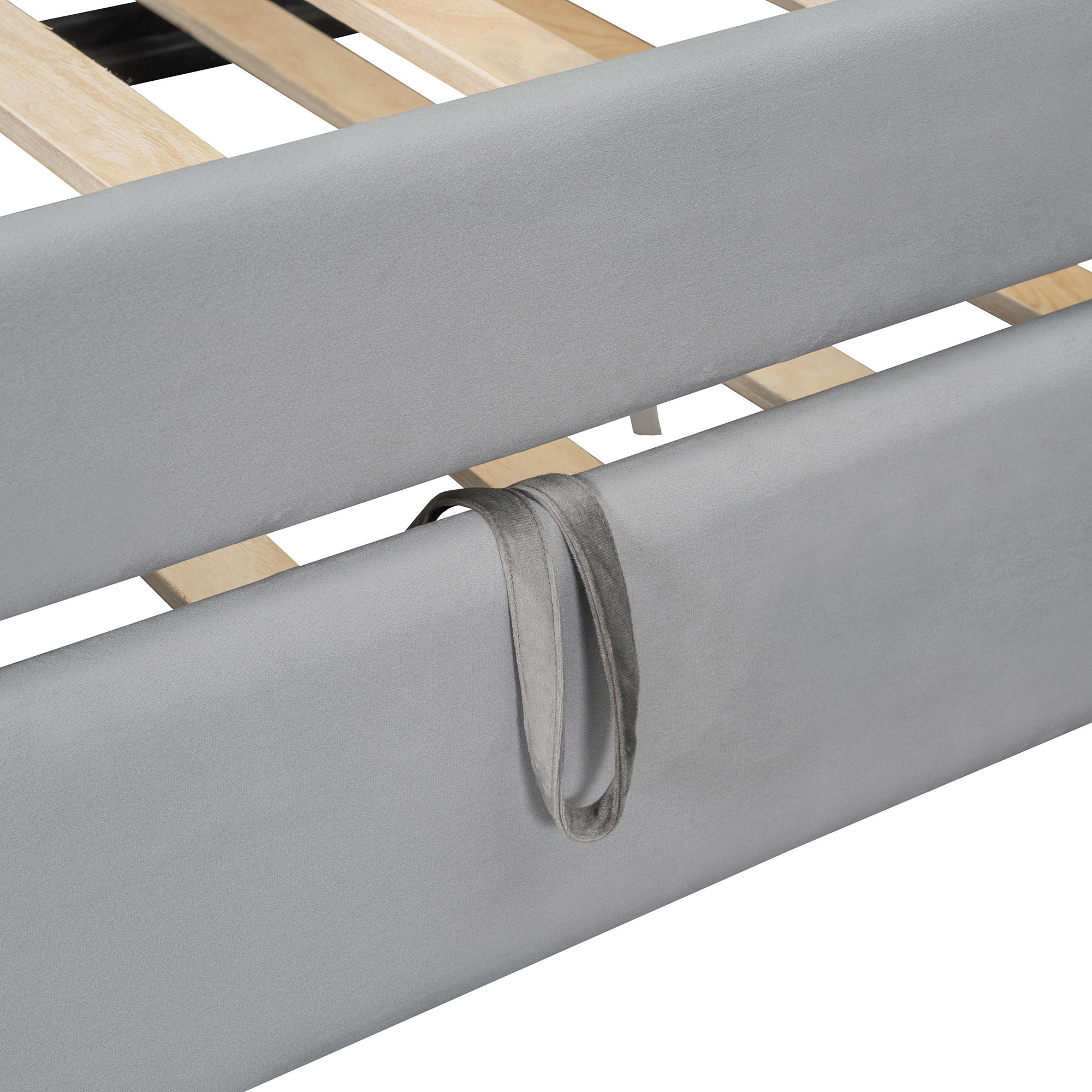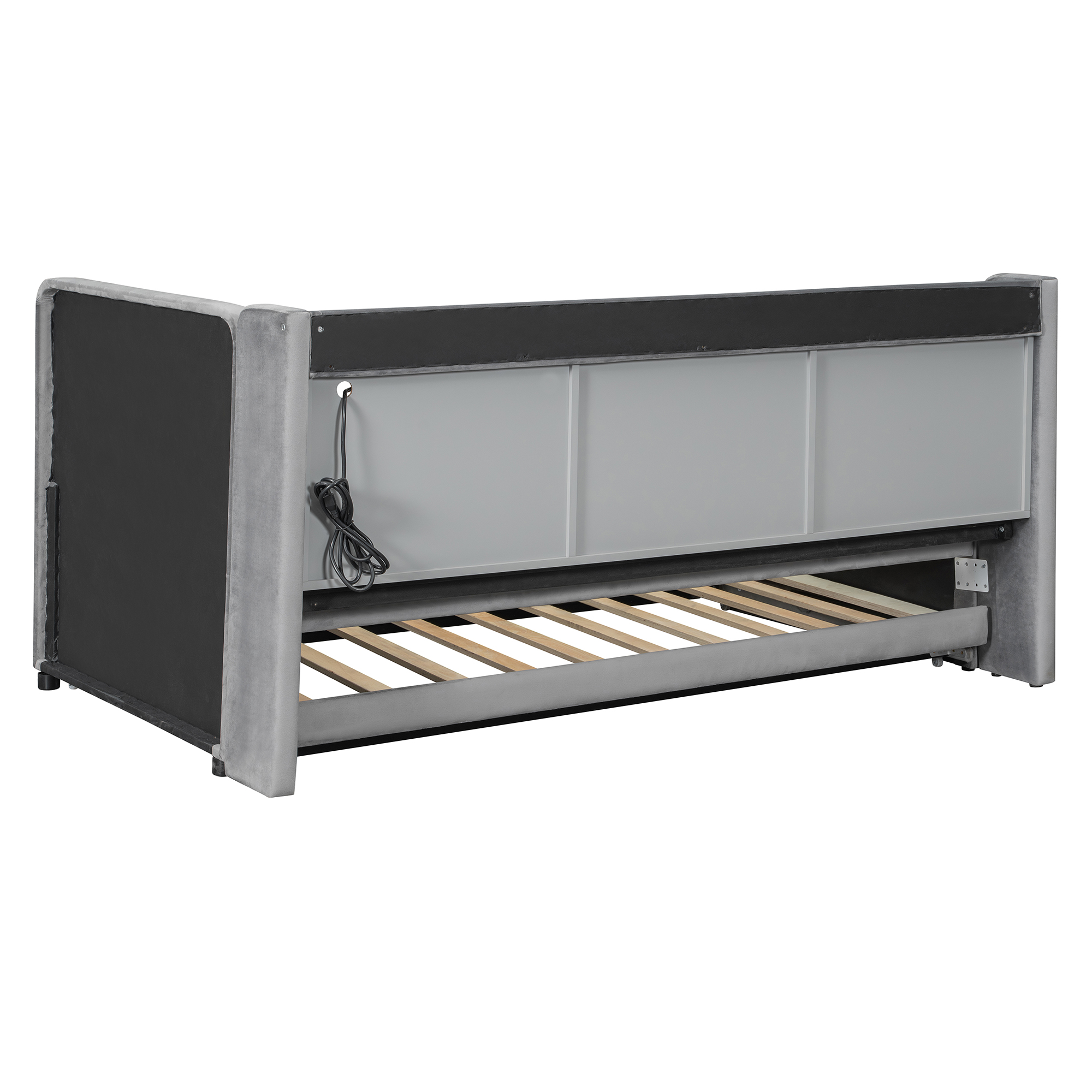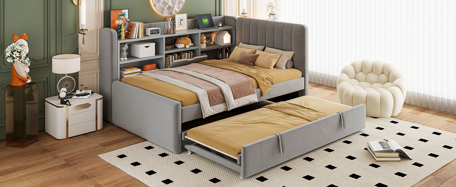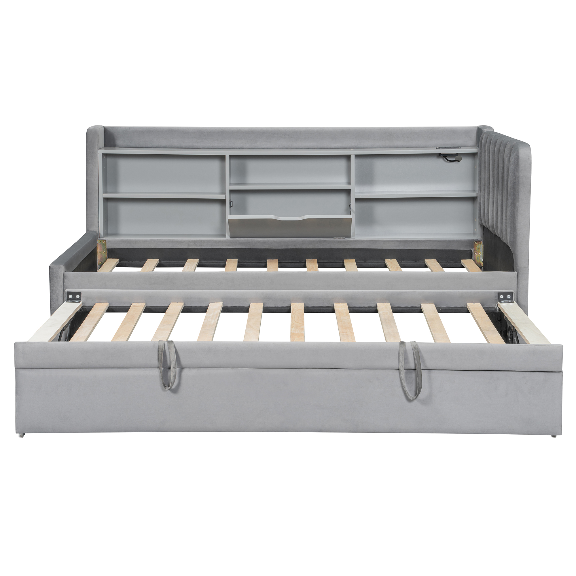 (Price Includes Shipping, No Tax Fee.)Upgrade your space with this Twin Size Upholstered Daybed with Pull-Up Trundle, designed for both comfort and convenience. Wrapped in soft velvet fabric for a plush, modern look, this daybed features a hidden twin-size trundle that lifts up to create additional sleeping space — perfect for sleepovers or guests. The high backrest is equipped with multiple open storage shelves and a flip-top storage compartment, ideal for keeping books, decor, or essentials close at hand. Plus, integrated USB ports and power outlets make it easy to charge devices or plug in a lamp. Ideal for bedrooms, guest rooms, or home offices, this multifunctional piece brings smart storage and style to any room.