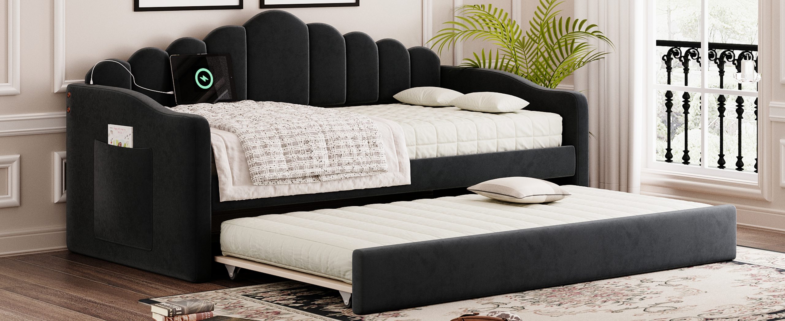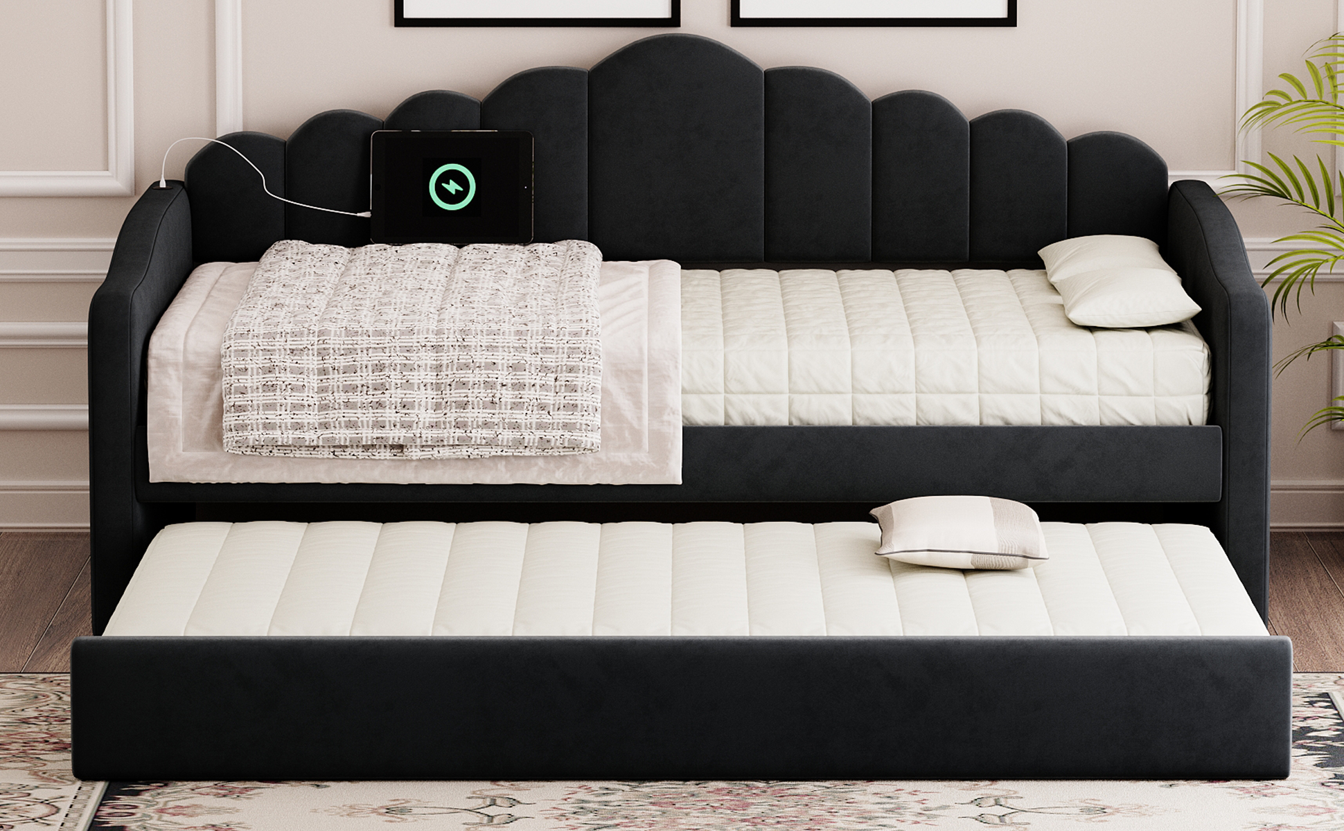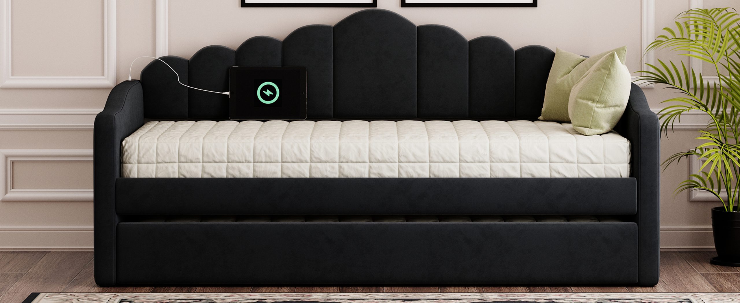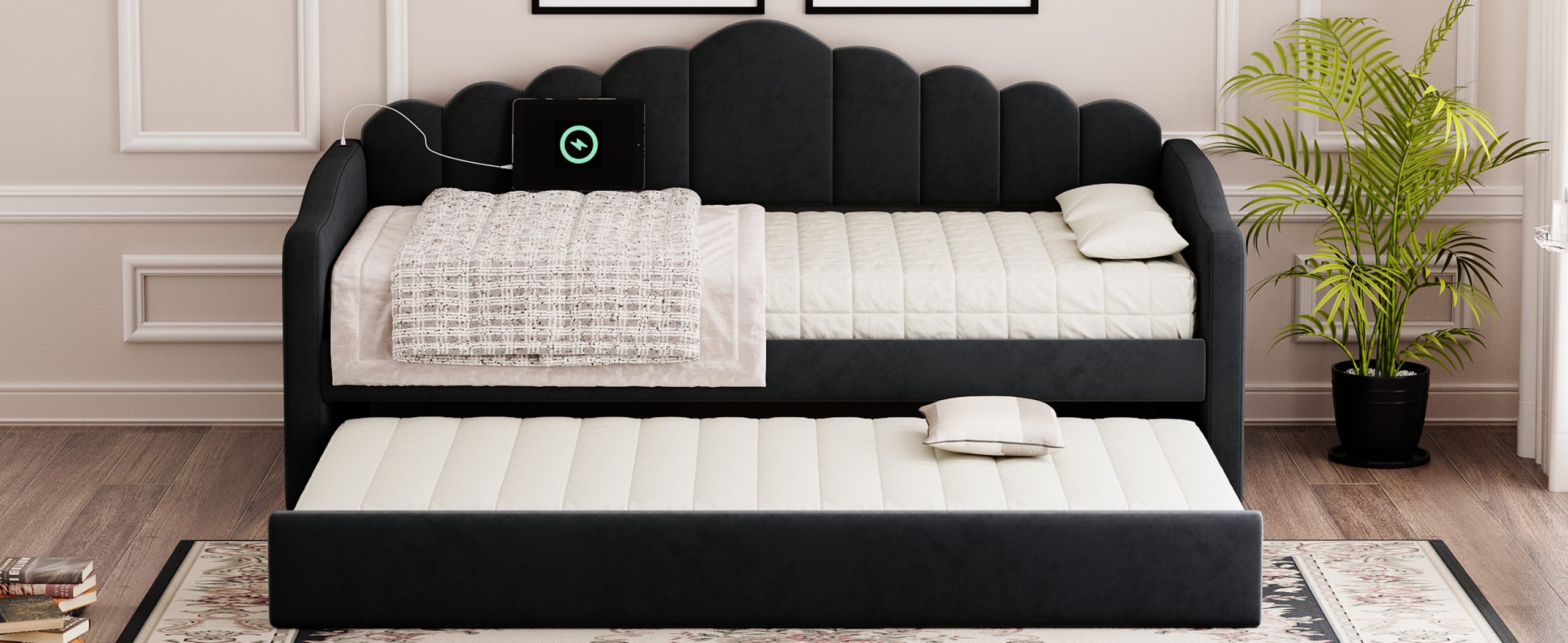 Twin Size Upholstered Daybed With Trundle , USB Charging Ports
