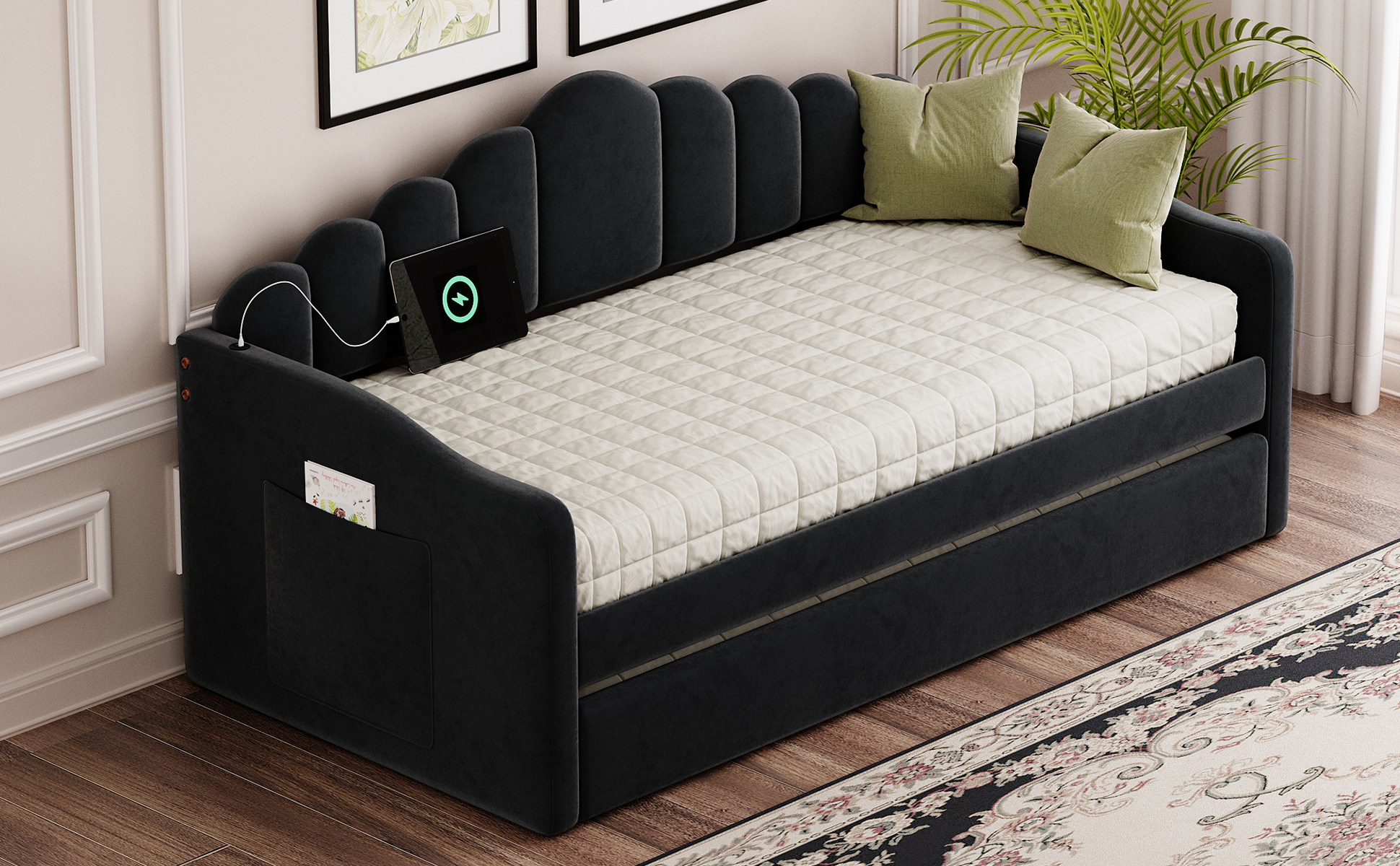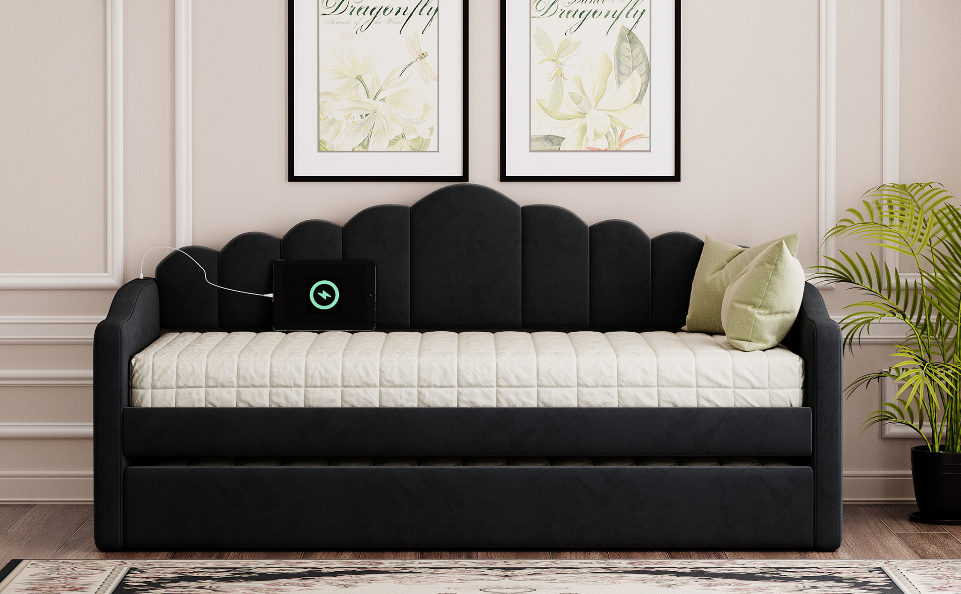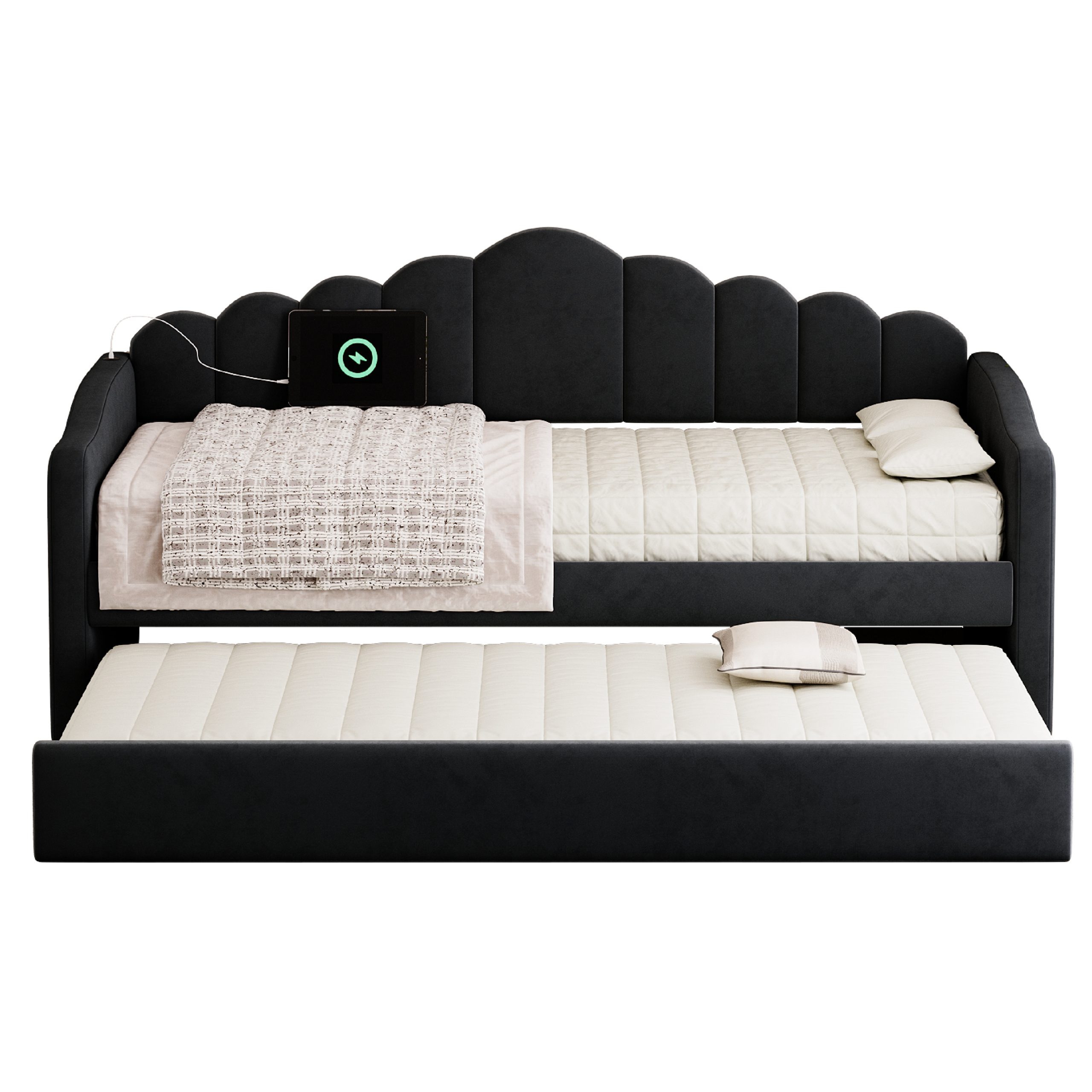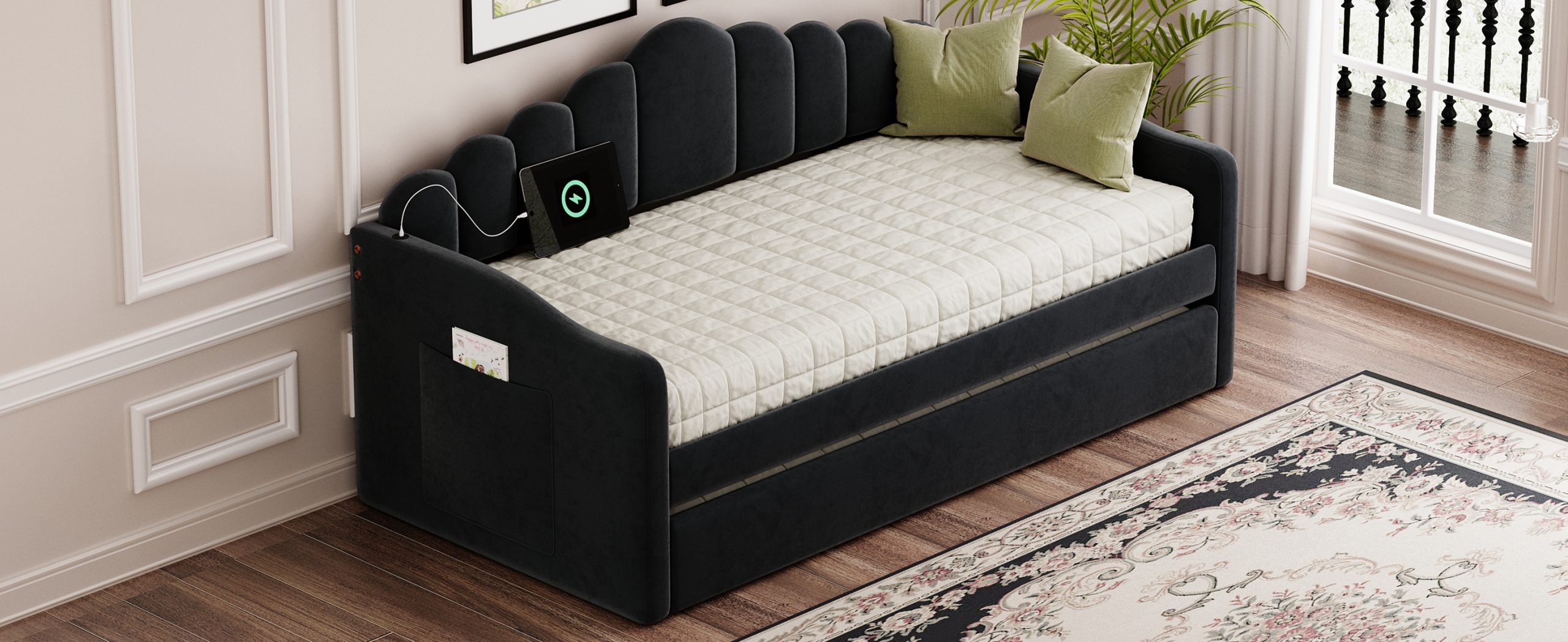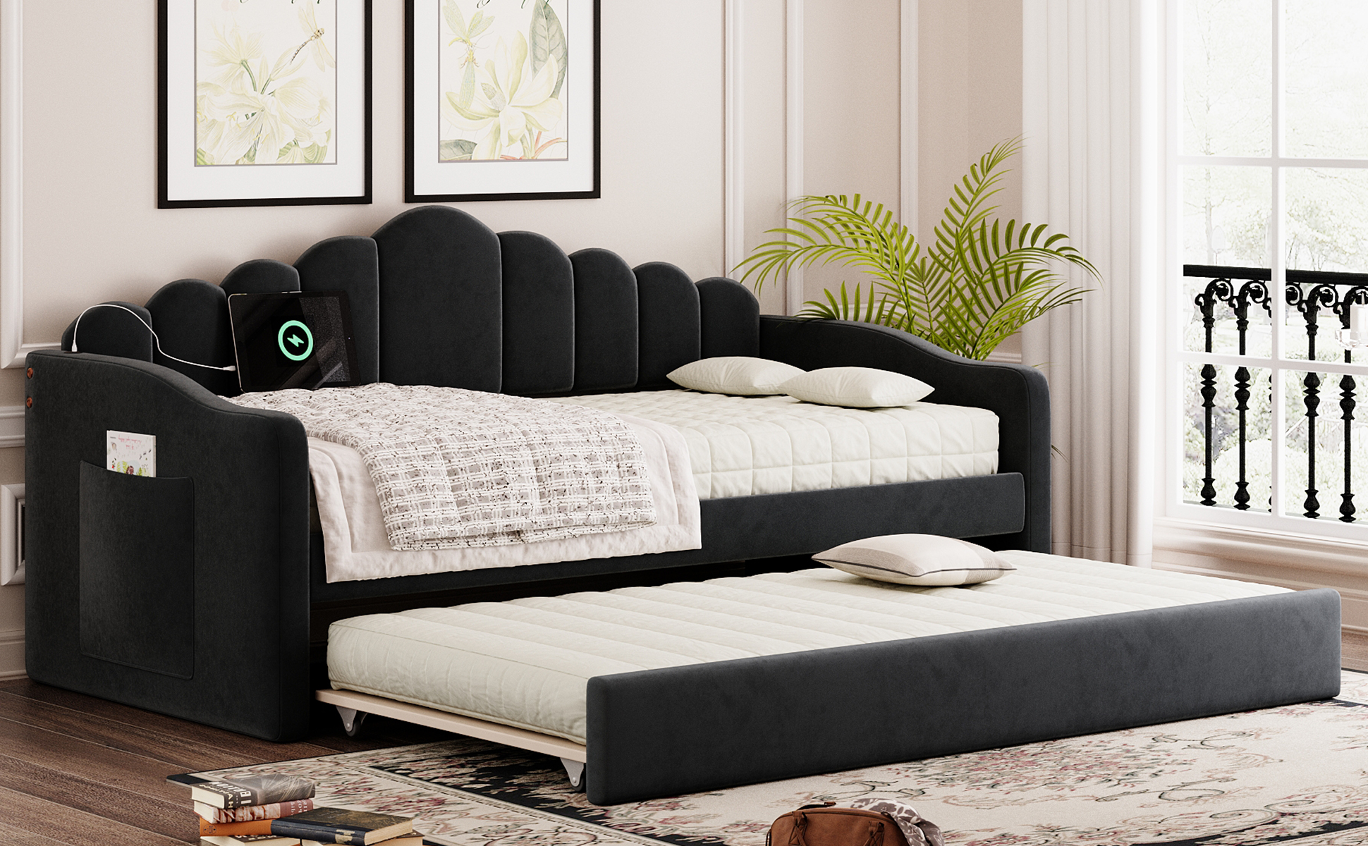Twin Size Upholstered Daybed With Trundle , USB Charging Ports