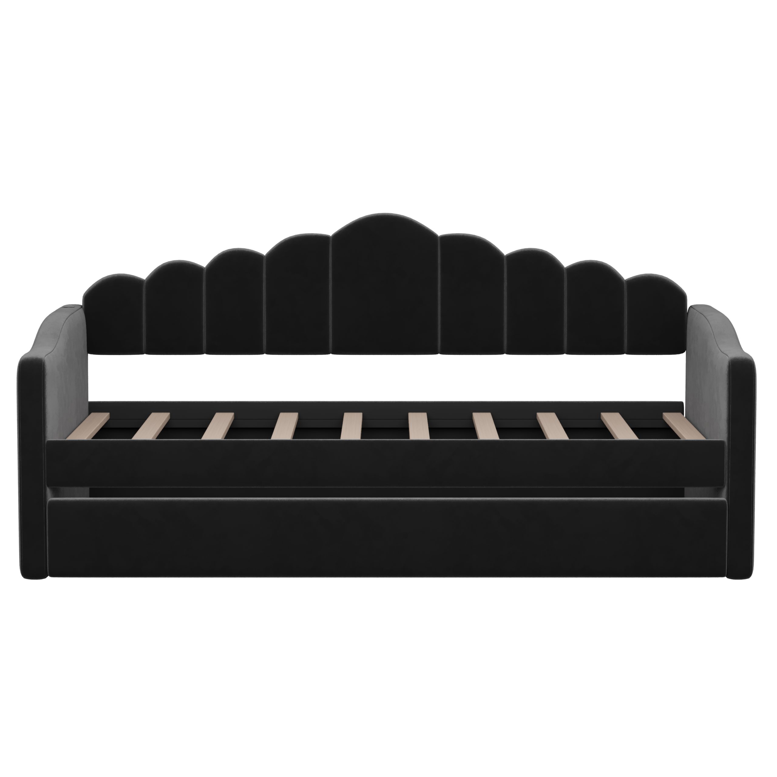 This sofa bed is made of selected velvet fabrics, with one backrest and two armrests, the backrest is designed with vertical stripes, elegant and generous, not only suitable for any home decoration, but also designed to last forever Not out of date. A soft fabric headboard provides comfort.This unique twin size daybed frame designed with a 2 USB Ports charging station on right armrest, when you are lying on the sofa bed and your phone is out of power, you can charge your phone in time.