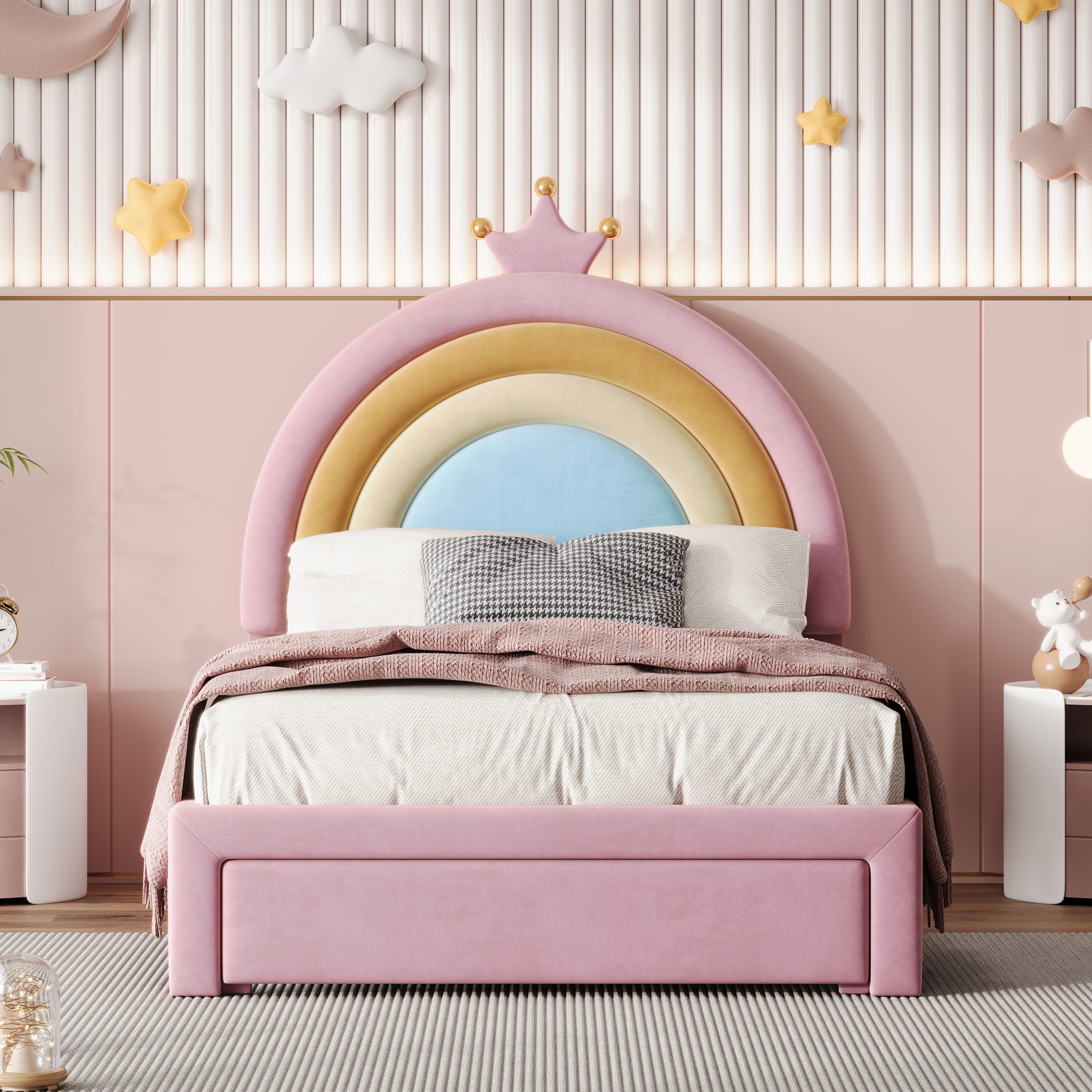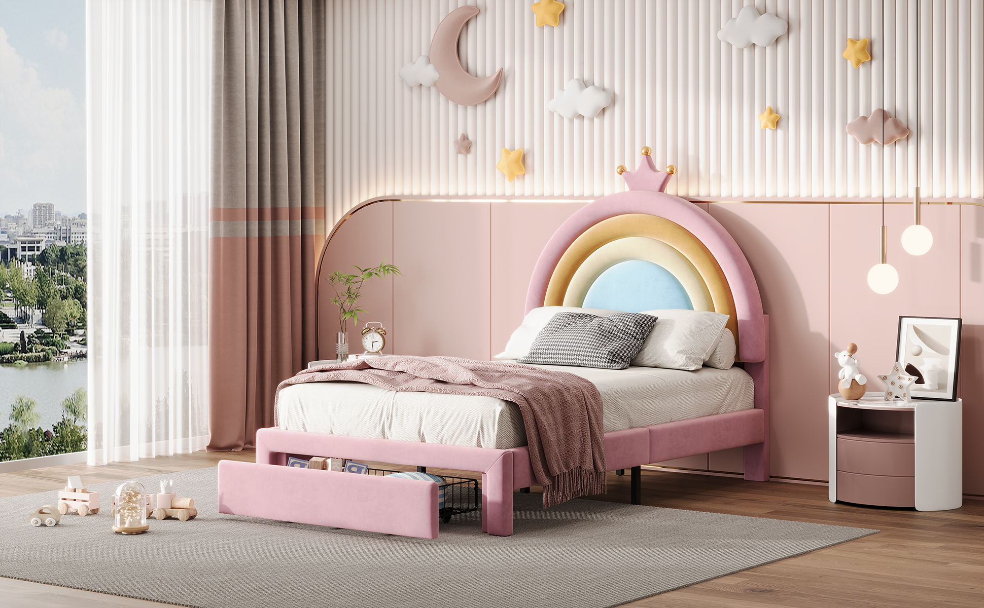 Bring color and functionality to your bedroom with the rainbow design bed. Featuring a vibrant rainbow design and soft velvet upholstery, it adds style and comfort to any space. The platform frame requires no box spring, while a built-in storage drawer keeps essentials neatly organized. Perfect for a bold and practical bedroom upgrade.