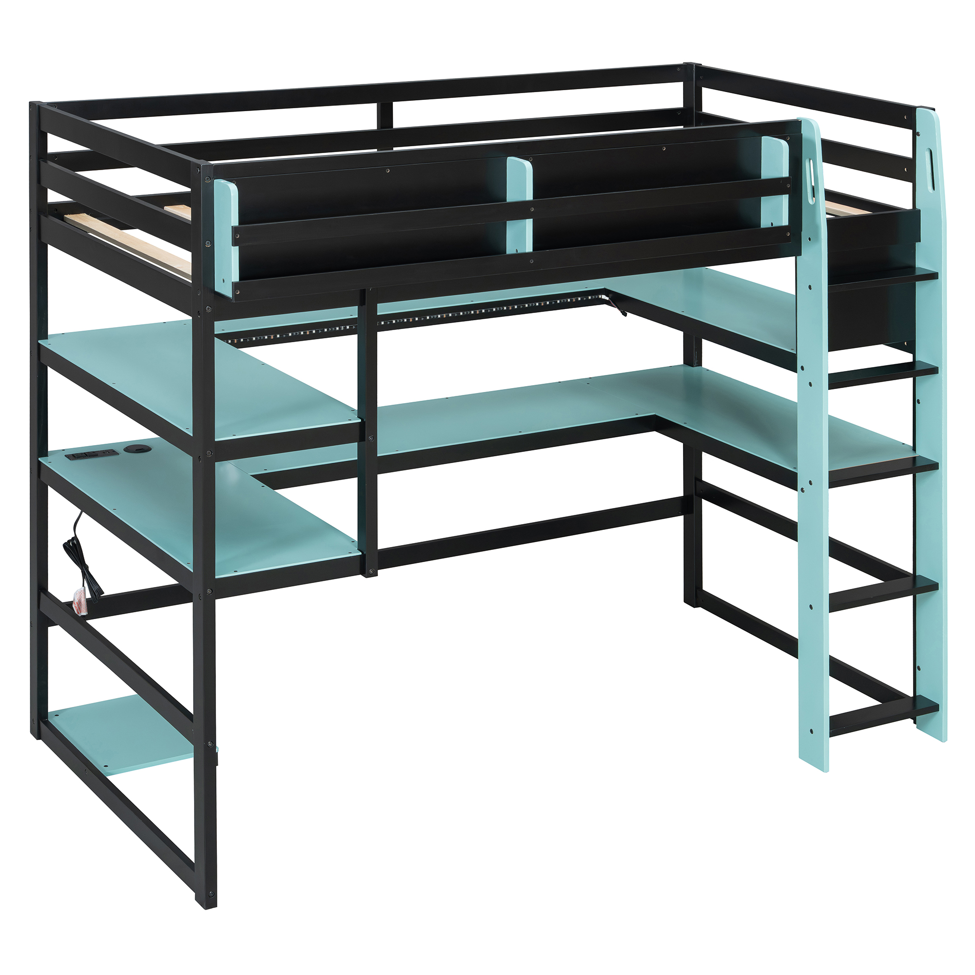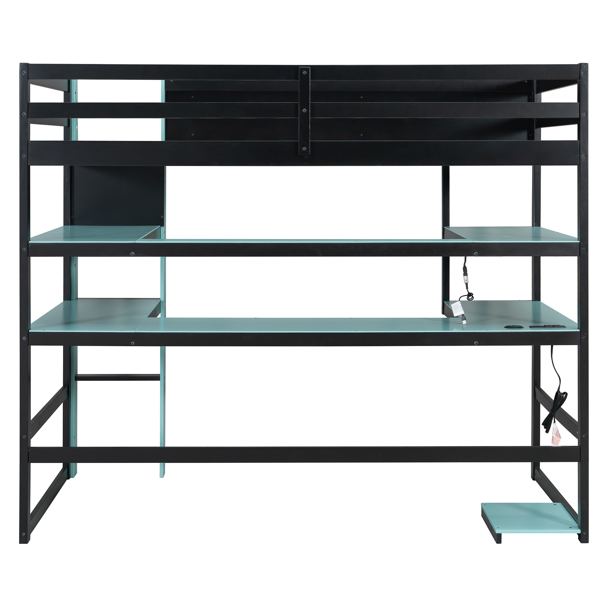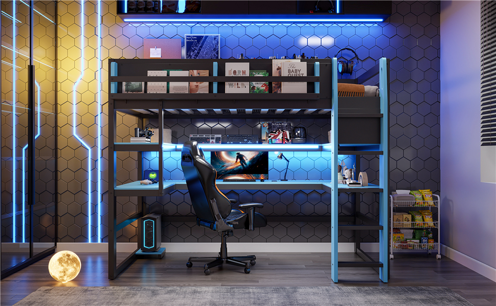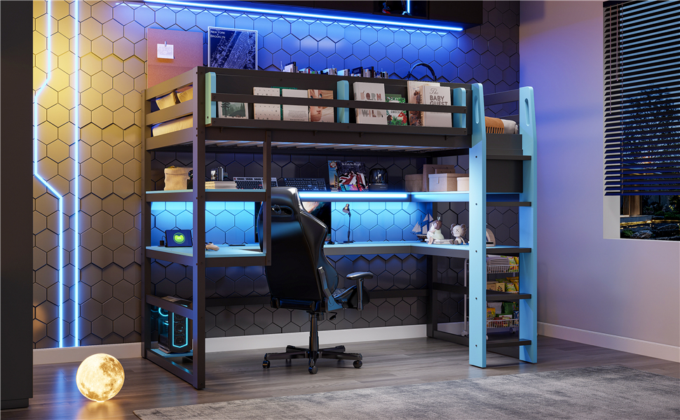 (Price Includes Shipping, No Tax Fee.)Upgrade your bedroom or gaming room with this Gaming Wood Loft Bed. Designed for both functionality and style, it combines a sturdy wood construction with a trendy black-red, black-green, black-sky blue color scheme that fits perfectly in any modern or gaming-themed space.The loft bed comes with rich storage solutions: a circular double-sided storage platform under the bed offers large capacity for gaming gear, daily items and decorations, while the outer rail shelves provide easy access to books, headphones and small essentials.For added convenience, the bed is equipped with USB charging ports and LED light strips, allowing you to charge your devices anytime and enjoy a cool, immersive lighting environment. Whether for study, rest or gaming, it meets all your daily needs while saving space and enhancing room style.