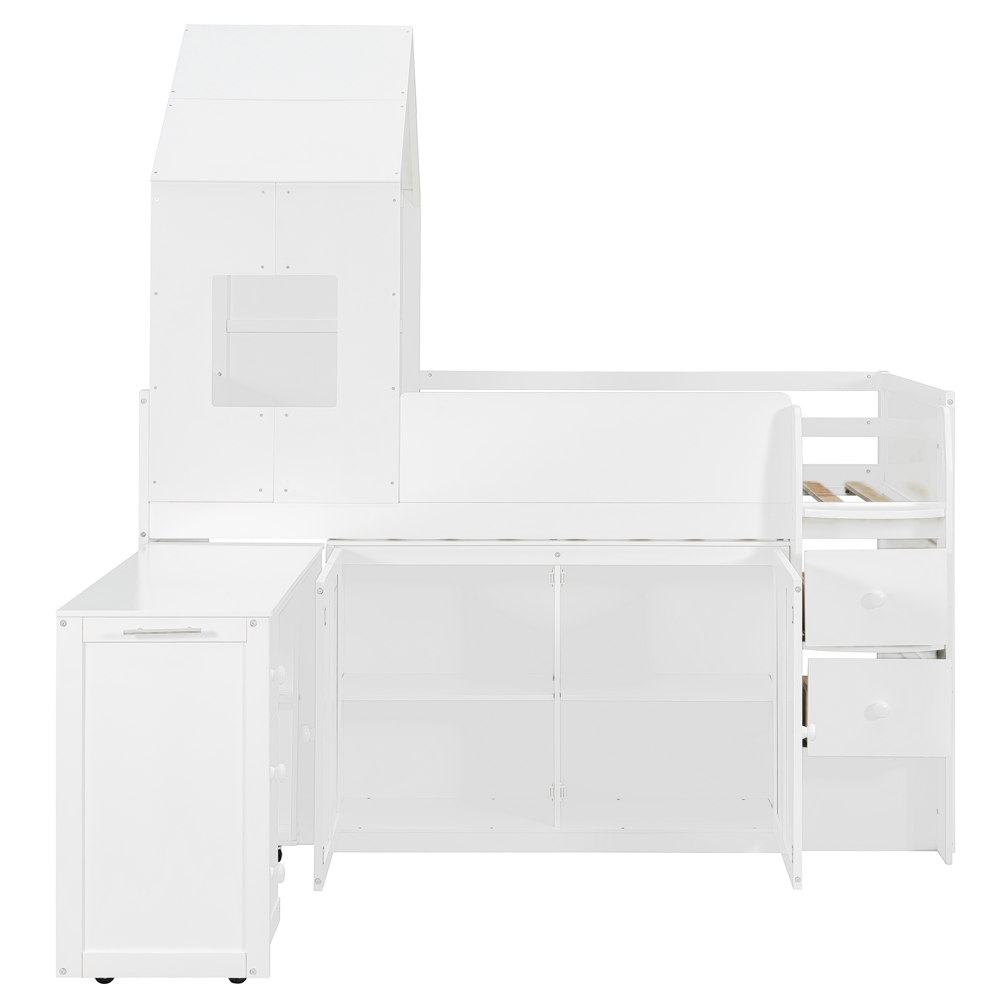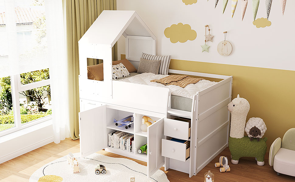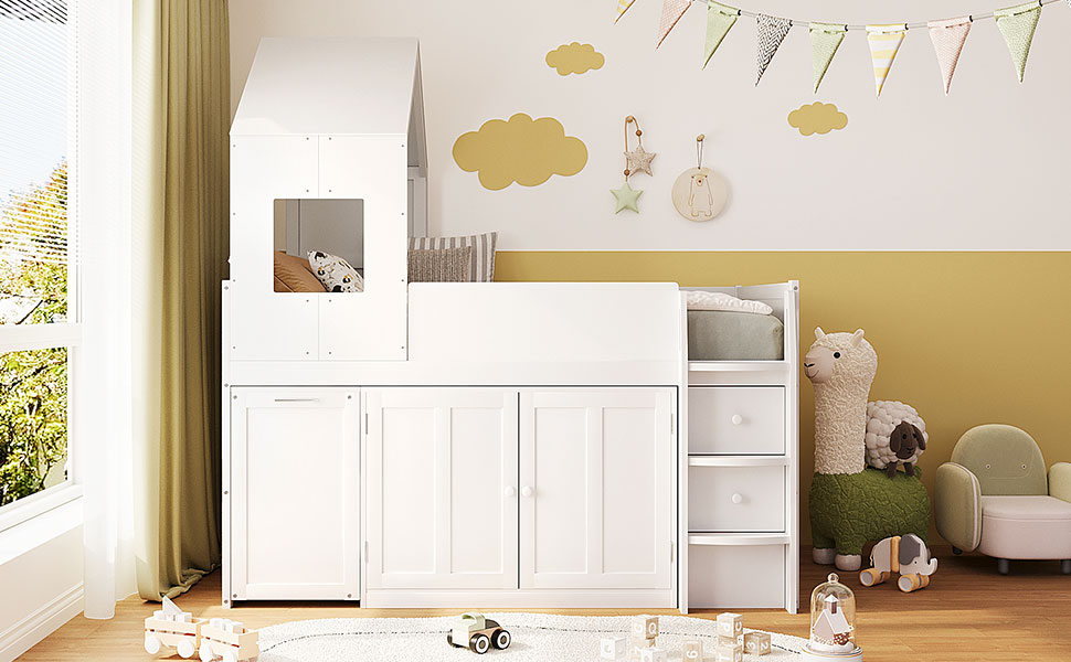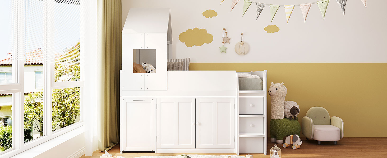 - This loft bed features a unique house-style roof structure combined with window details, creating a warm and playful environment that inspires imagination and creativity. The architectural design makes the bed feel like a private little hideout while adding strong visual appeal to any teen’s bedroom.