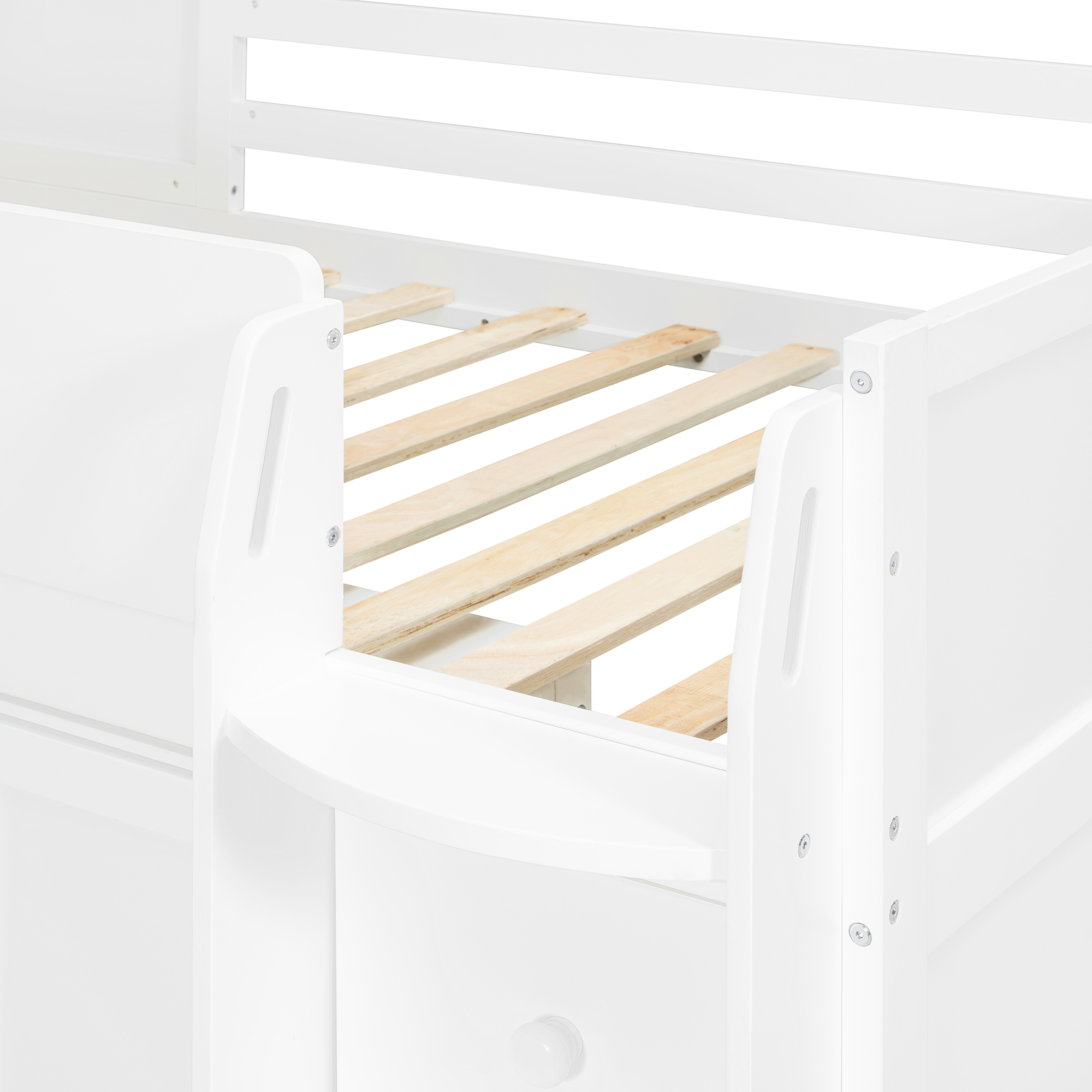 - The sturdy staircase not only provides safe and easy access to the upper bed but also includes two built-in storage drawers. These drawers are perfect for books, school bags, or daily items, turning every step into functional storage and further enhancing convenience for everyday living.