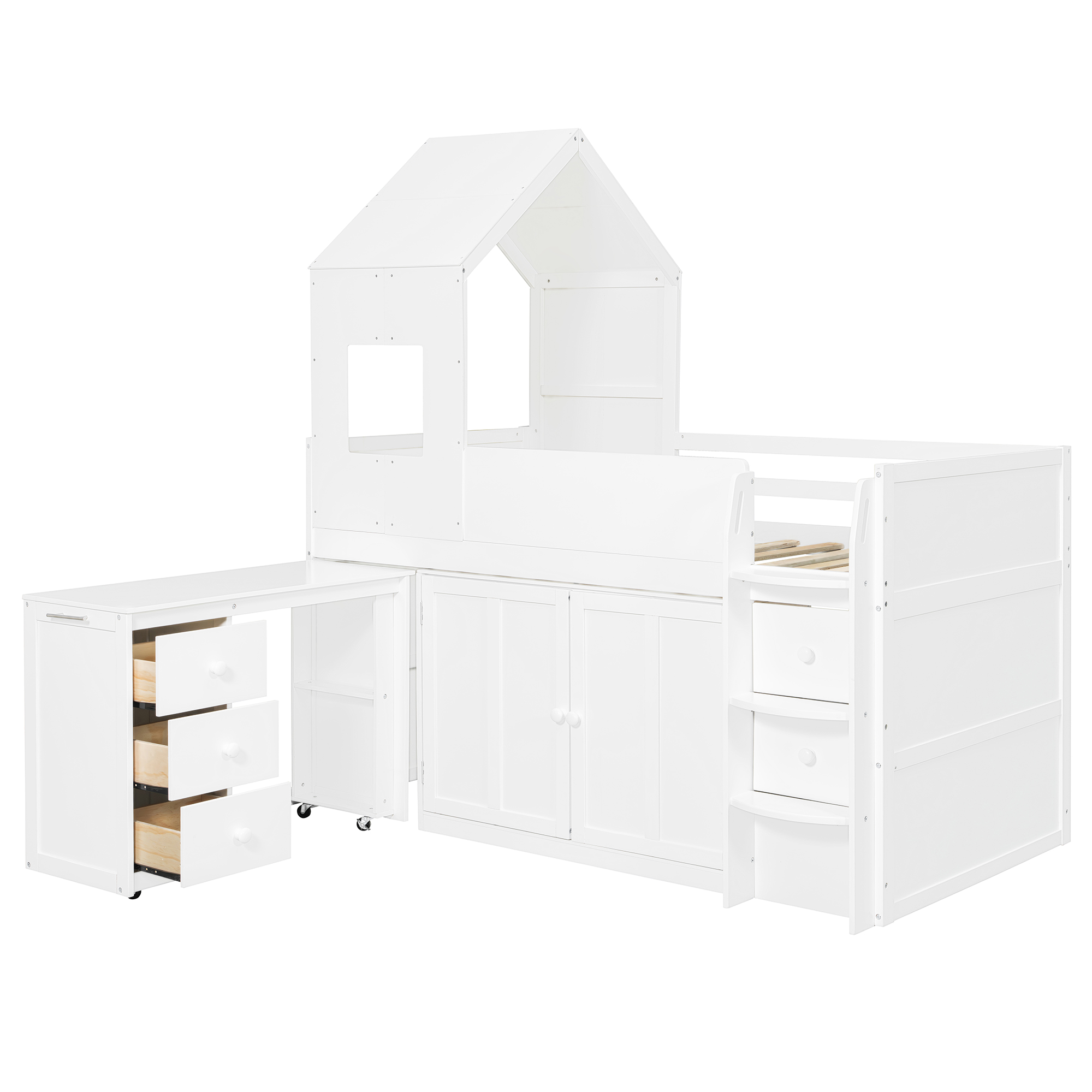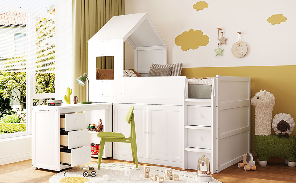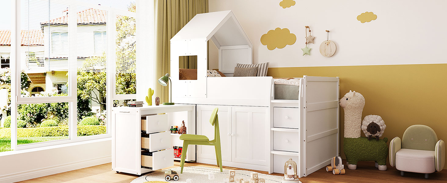 - Equipped with a smooth-rolling desk on wheels, this loft bed allows you to easily pull the desk out when it’s time for studying, working, or creative activities. When not in use, the desk slides neatly back under the bed, maximizing floor space and keeping the room clean and organized.