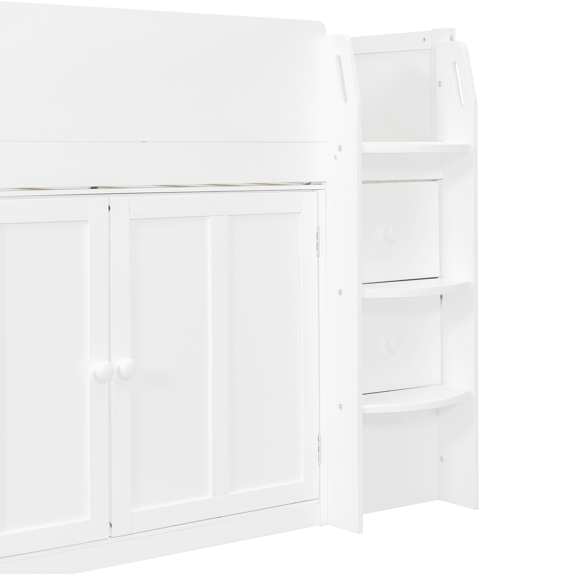 - Directly beneath the loft bed are four fully enclosed storage cabinets, ideal for storing toys, clothes, bedding, or seasonal items. The closed design helps keep belongings dust-free and visually tidy, offering a clean, organized look while significantly increasing the room’s overall storage capacity.