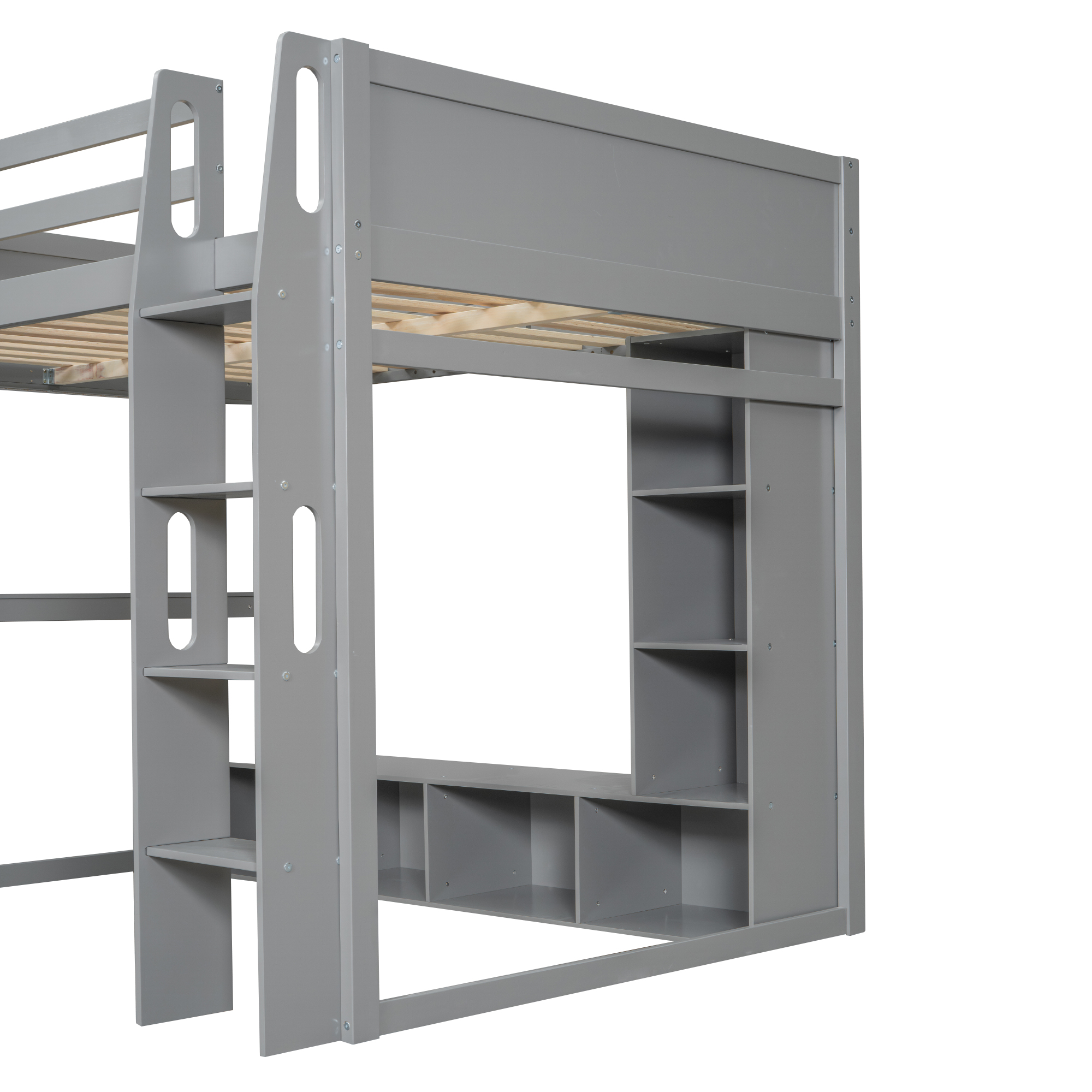 Wood Full Size Gaming Loft Bed with Desk, Multi-storage Shelves, LED and a Hanging Clothes Rack