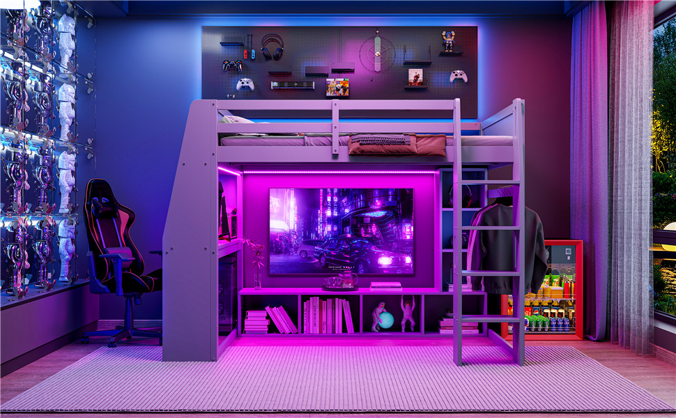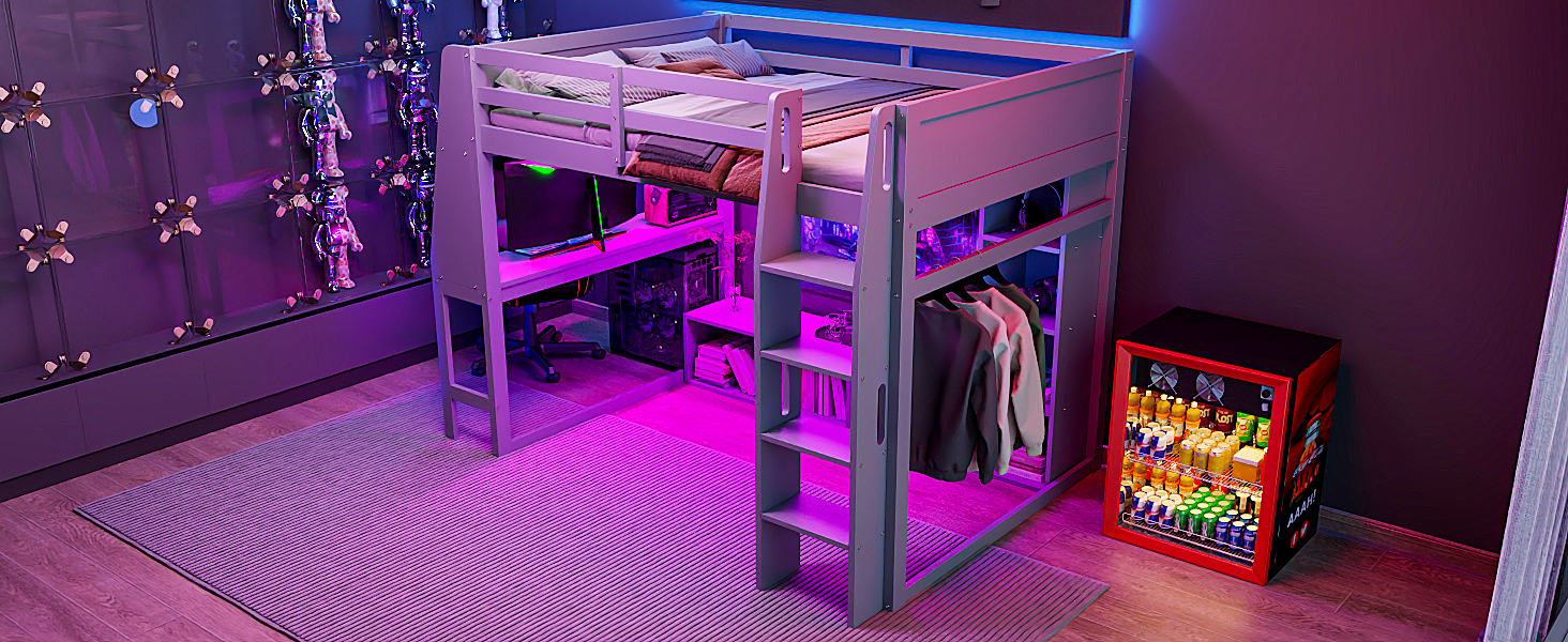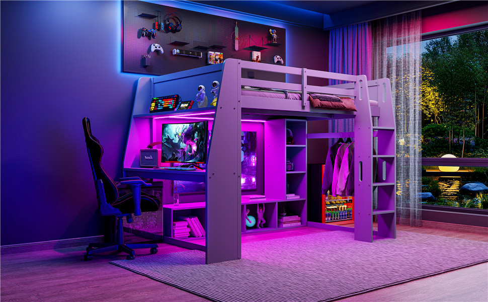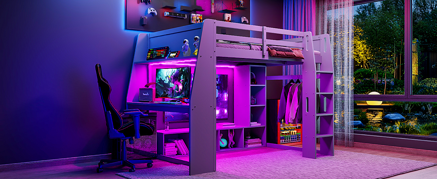 A gaming bed, desk, hang rack and storage built into one. This wood gaming loft bed collection provides the perfect space saving solution for any kids bedroom. There is a desk next to the bed with its own bookshelf brings convenience to your entertainment or study. Whether you’re playing under the bed or organizing things, there will be LED lighting.