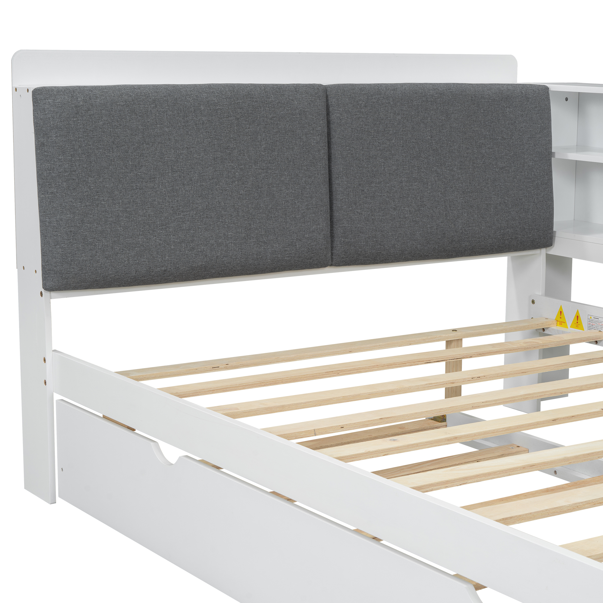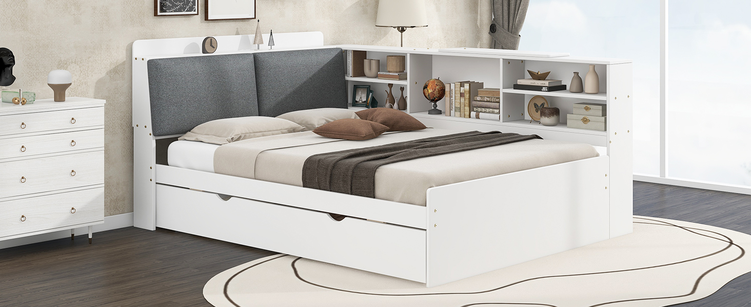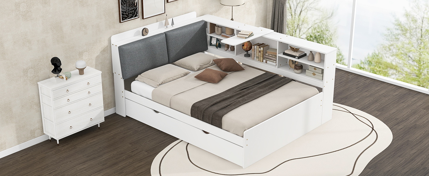 - [Multiple Storage Space] The headboard features built-in storage shelves and box. Your bedding, toys, mobile phones, and so on can all be properly stored.