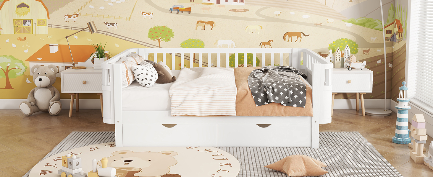 - The kids bed come with different use, can place the side without rails against the wall which suitable for little kids. You can also use it as a daybed. Besides, the right side rails of the bed can be taken off when no need. This design meet your growing child’s changing needs.
