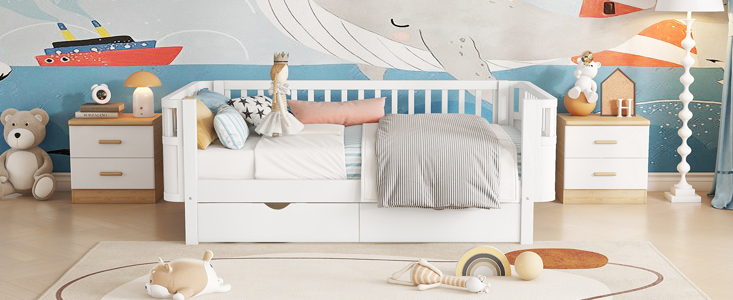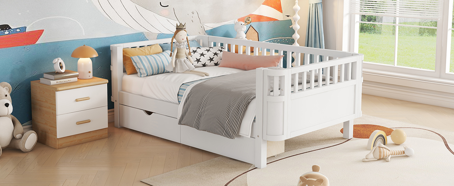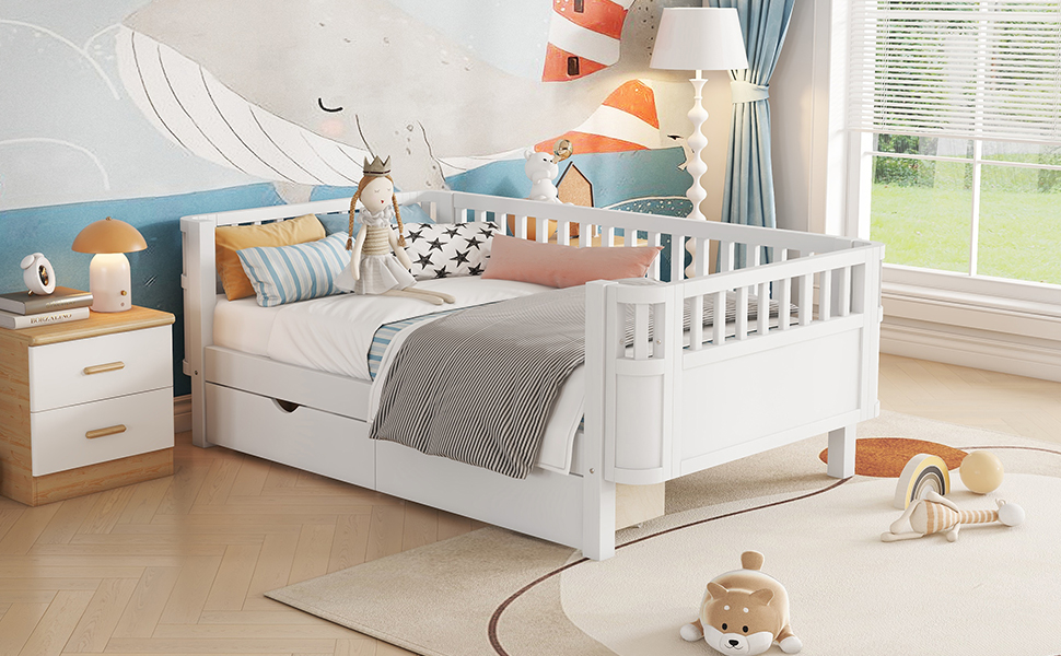 - The kids bed come with different use, can place the side without rails against the wall which suitable for little kids. You can also use it as a daybed. Besides, the right side rails of the bed can be taken off when no need. This design meet your growing child’s changing needs.