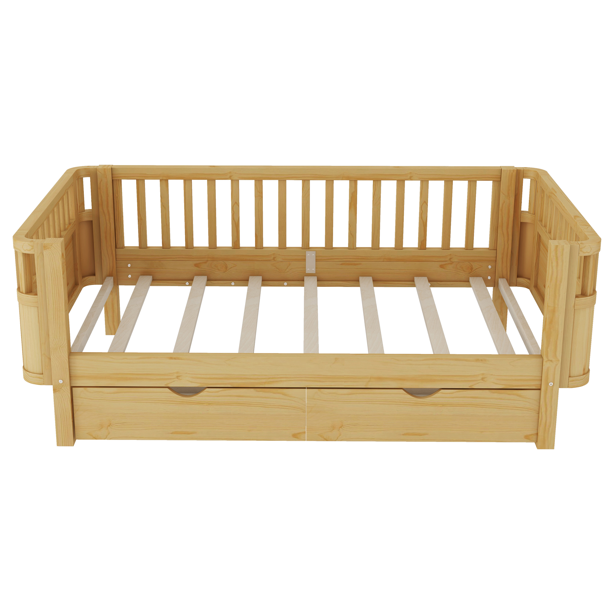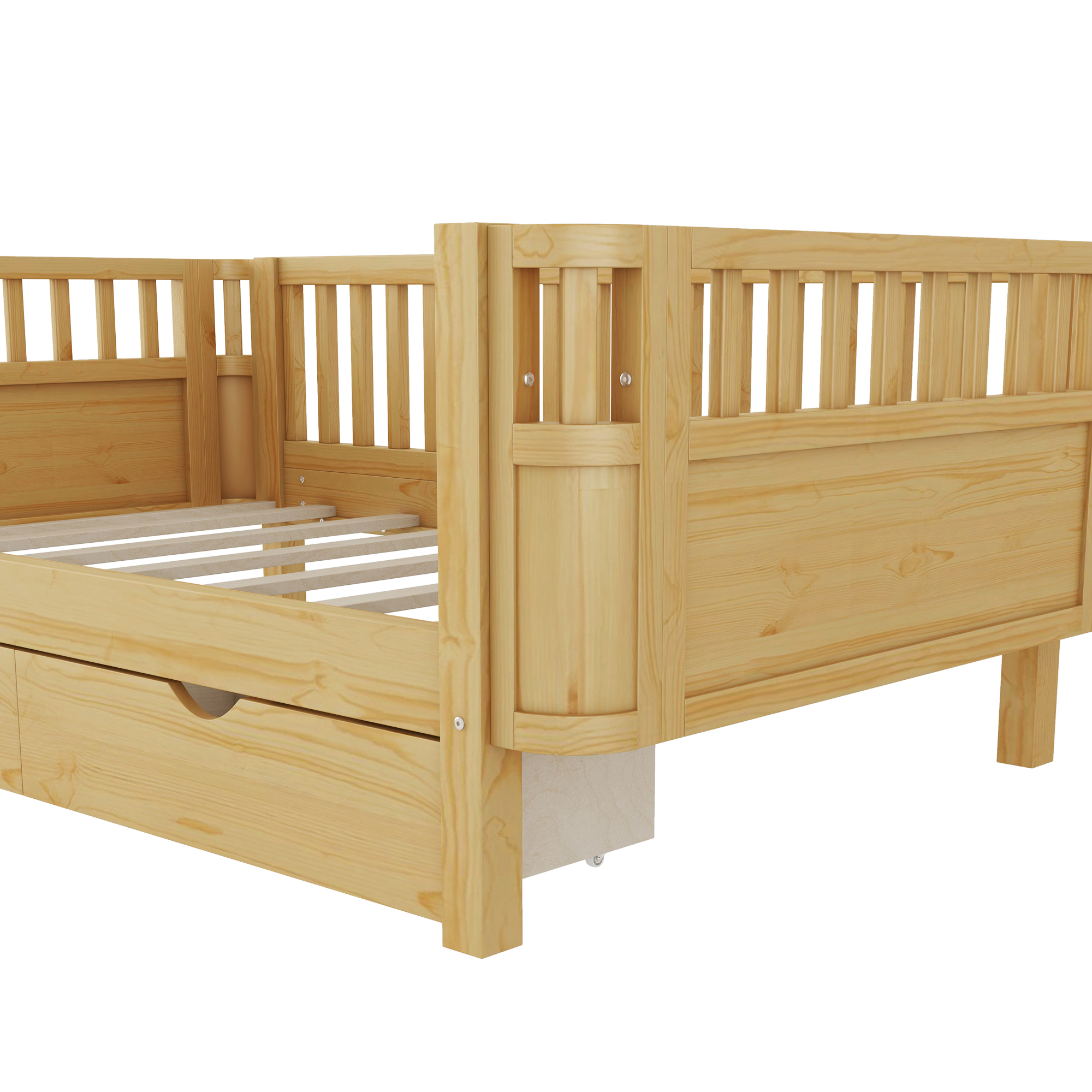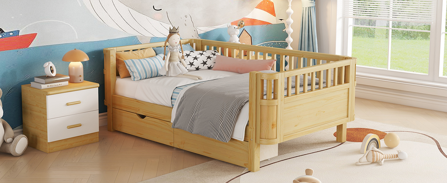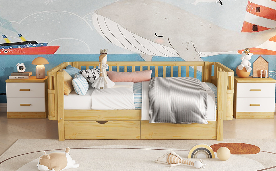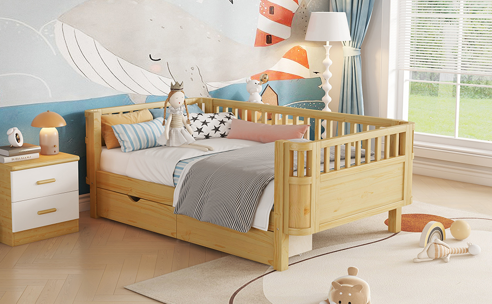 - The kids bed come with different use, can place the side without rails against the wall which suitable for little kids. You can also use it as a daybed. Besides, the right side rails of the bed can be taken off when no need. This design meet your growing child’s changing needs.