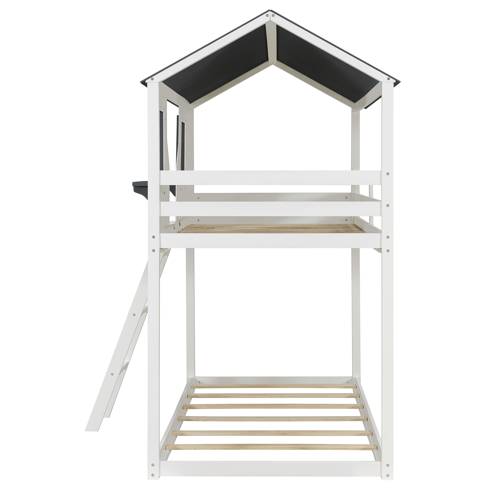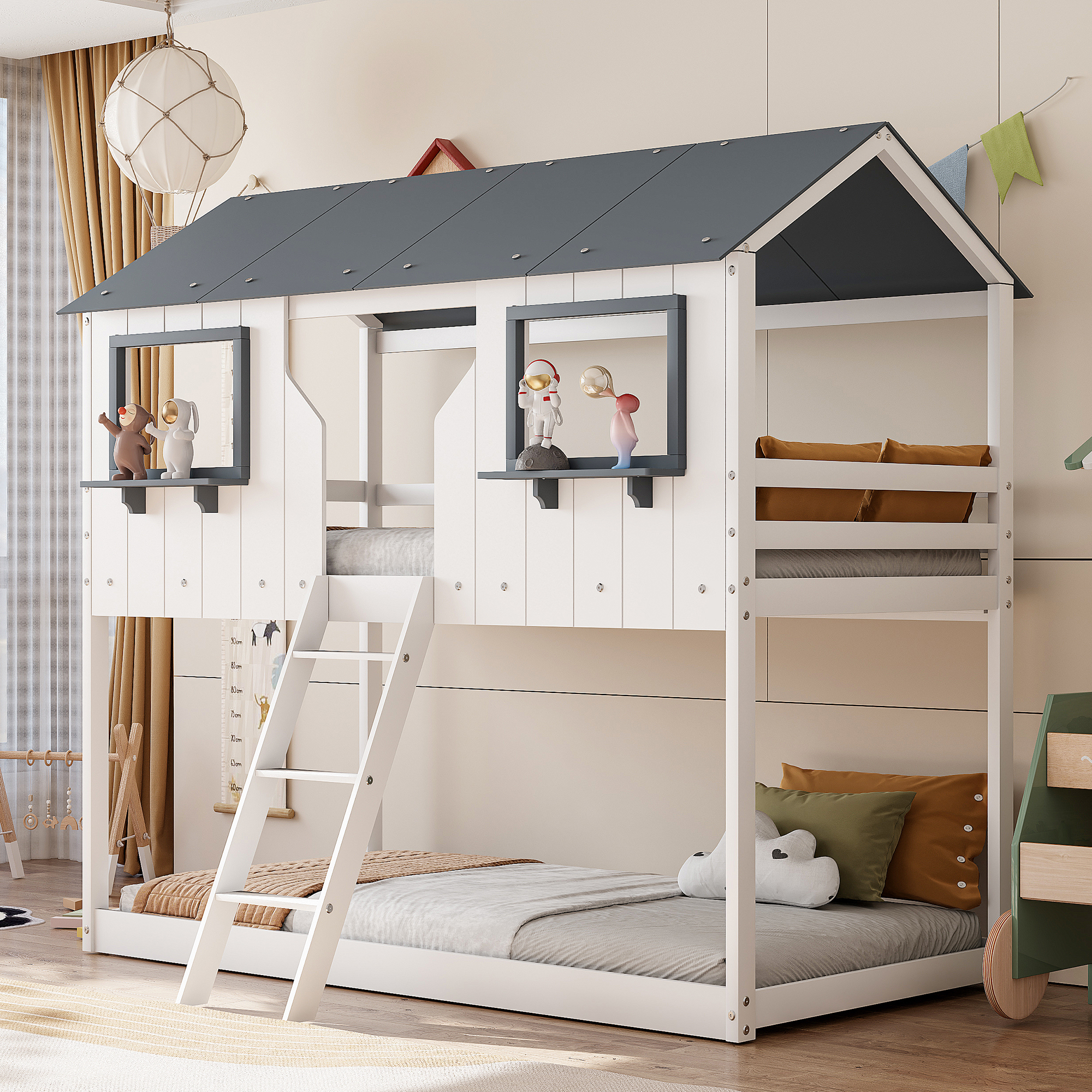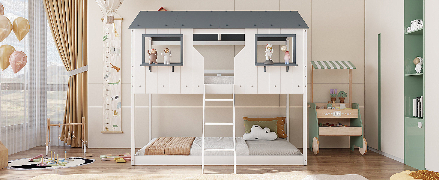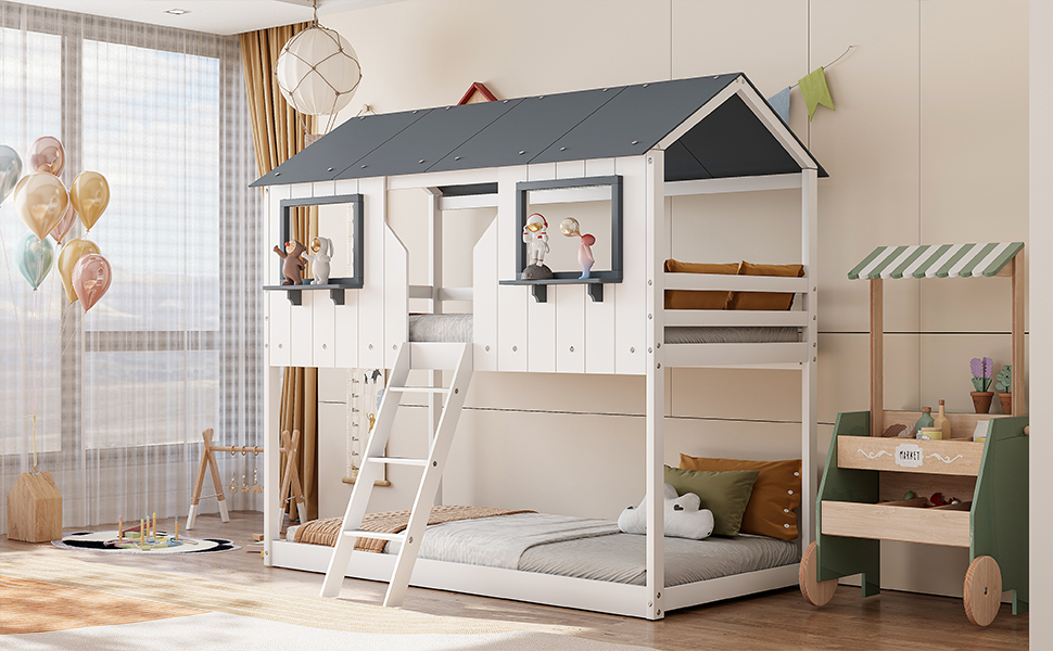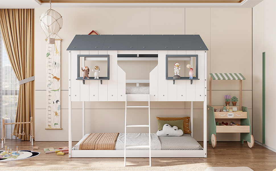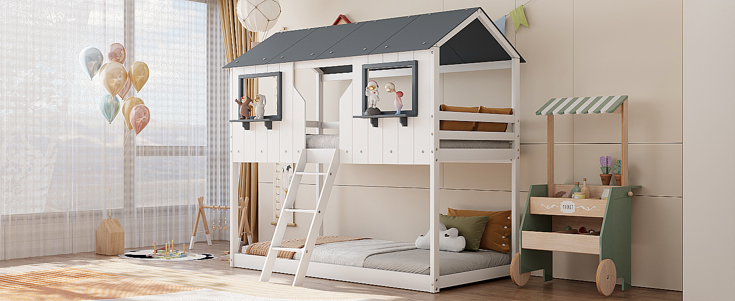 - [Playhouse Design] Featuring a pitched roof and two front windows, this unique and intricately designed bunk bed creates a fun and adorable space that not only serves as a comfortable sleeping area but also double as a space for you to play and have fun.