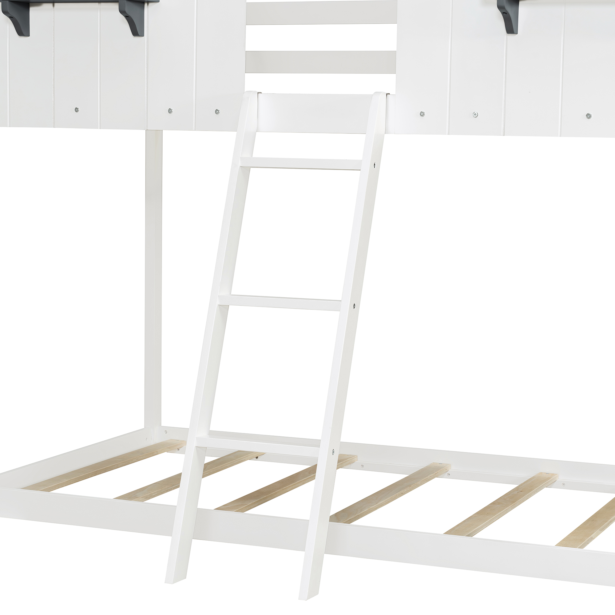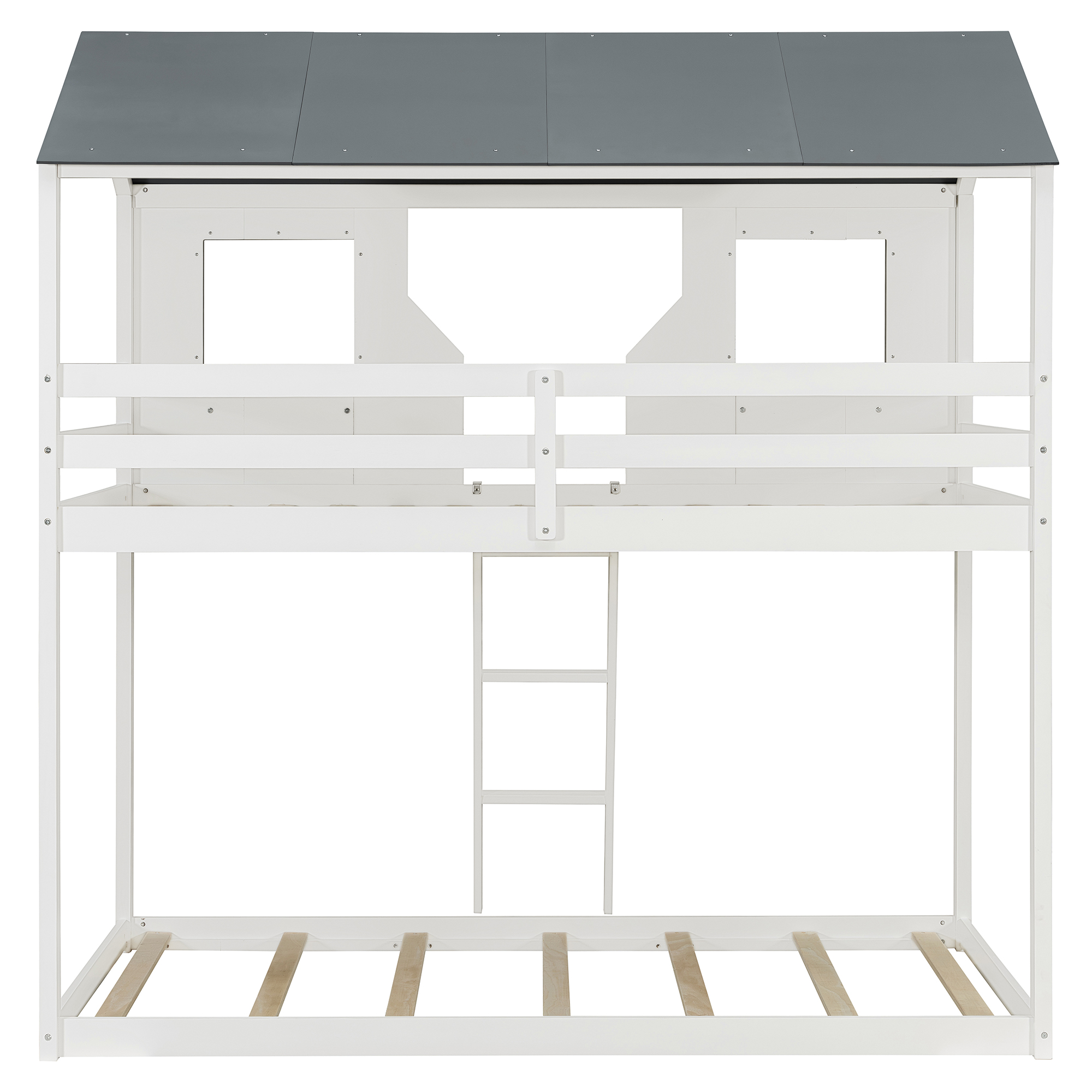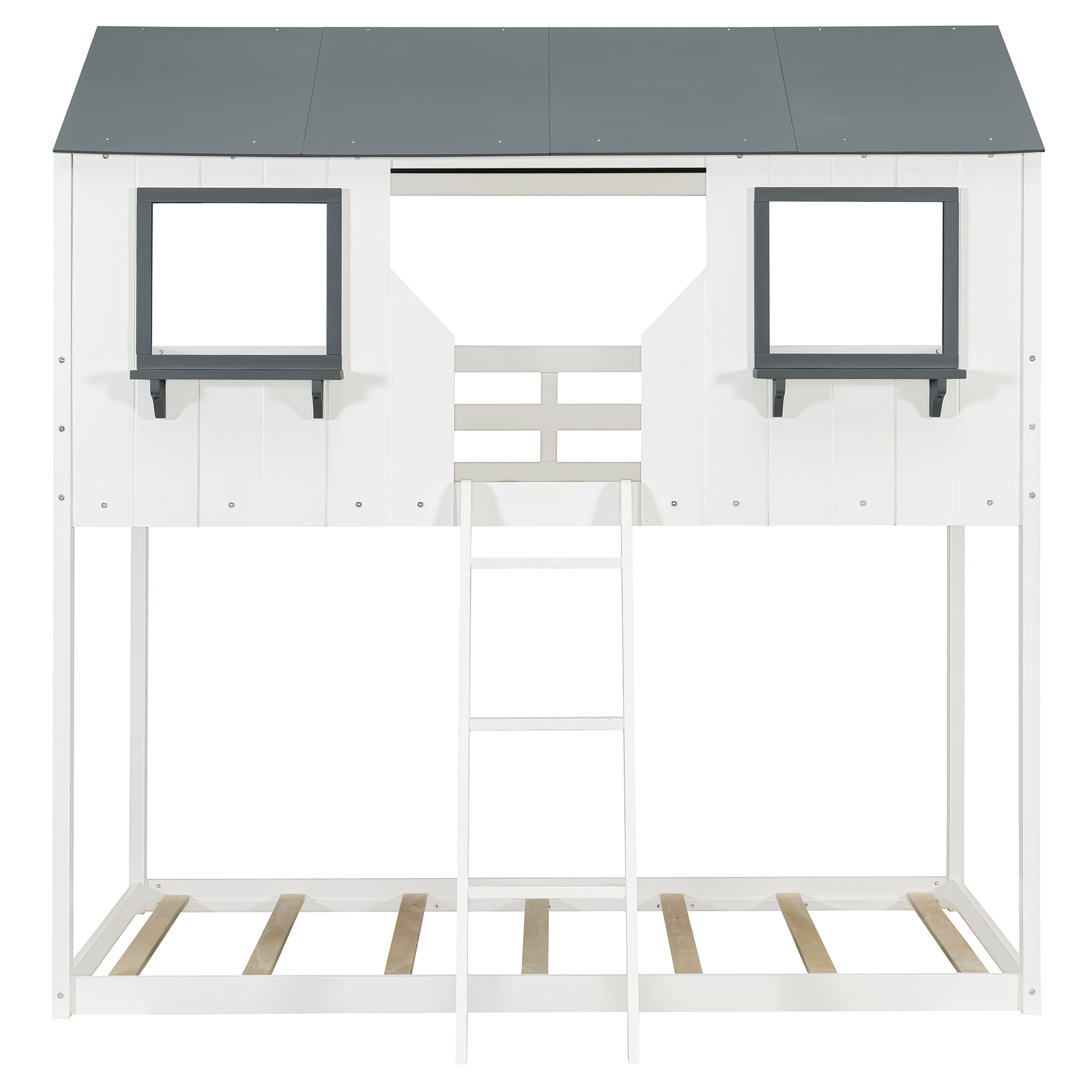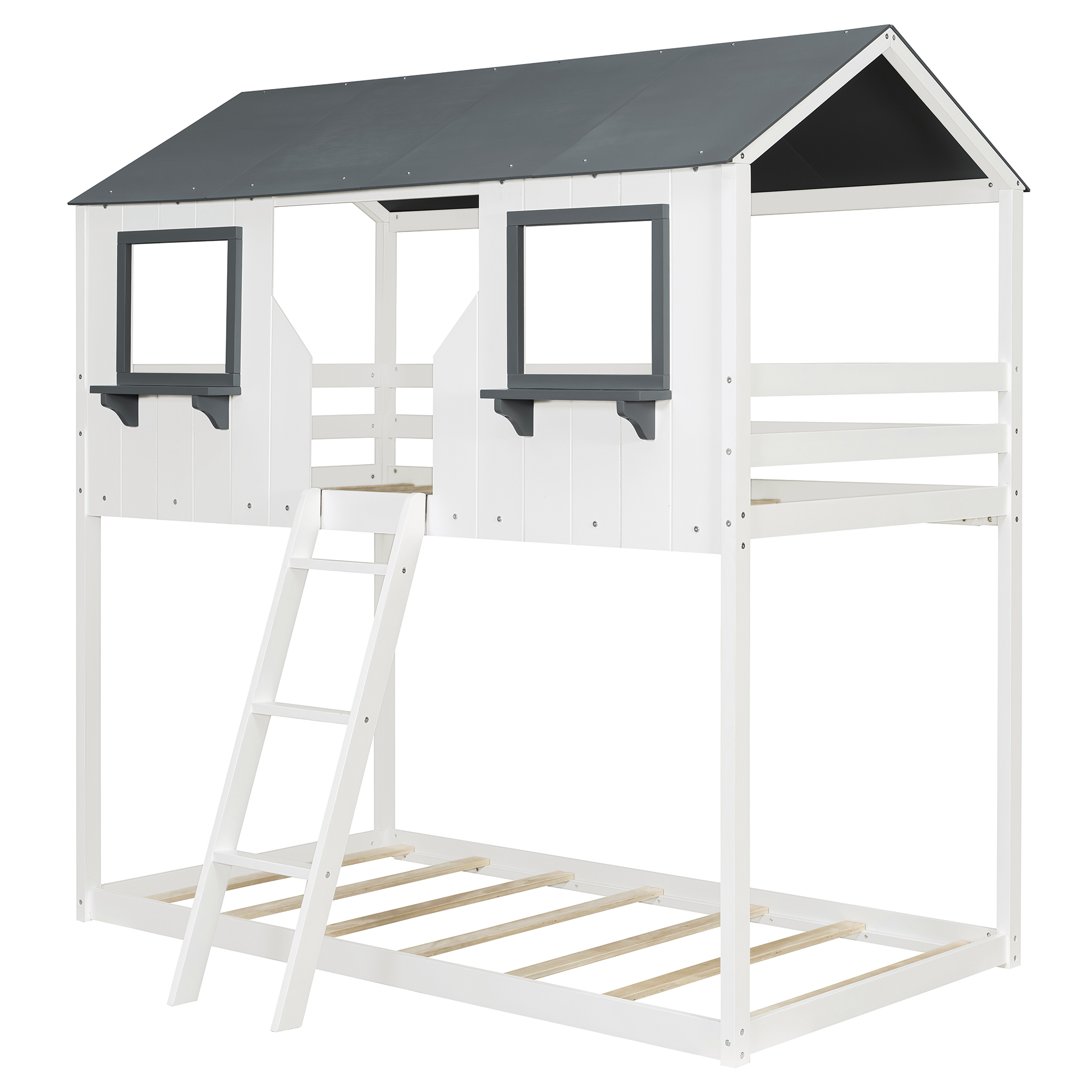 - [Playhouse Design] Featuring a pitched roof and two front windows, this unique and intricately designed bunk bed creates a fun and adorable space that not only serves as a comfortable sleeping area but also double as a space for you to play and have fun.