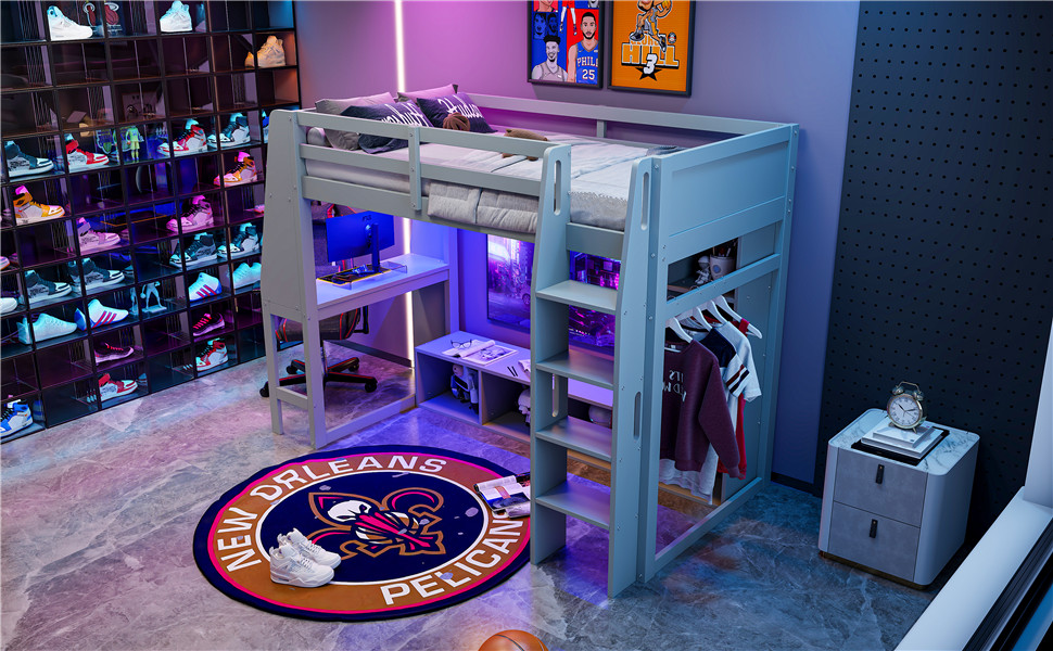 - [Space-saving and Multi-function] There is a desk and storage cabinets under the bed for you to study or place daily supplies. The hanging clothes rack makes full use of space, you can hang clothes for the next day.