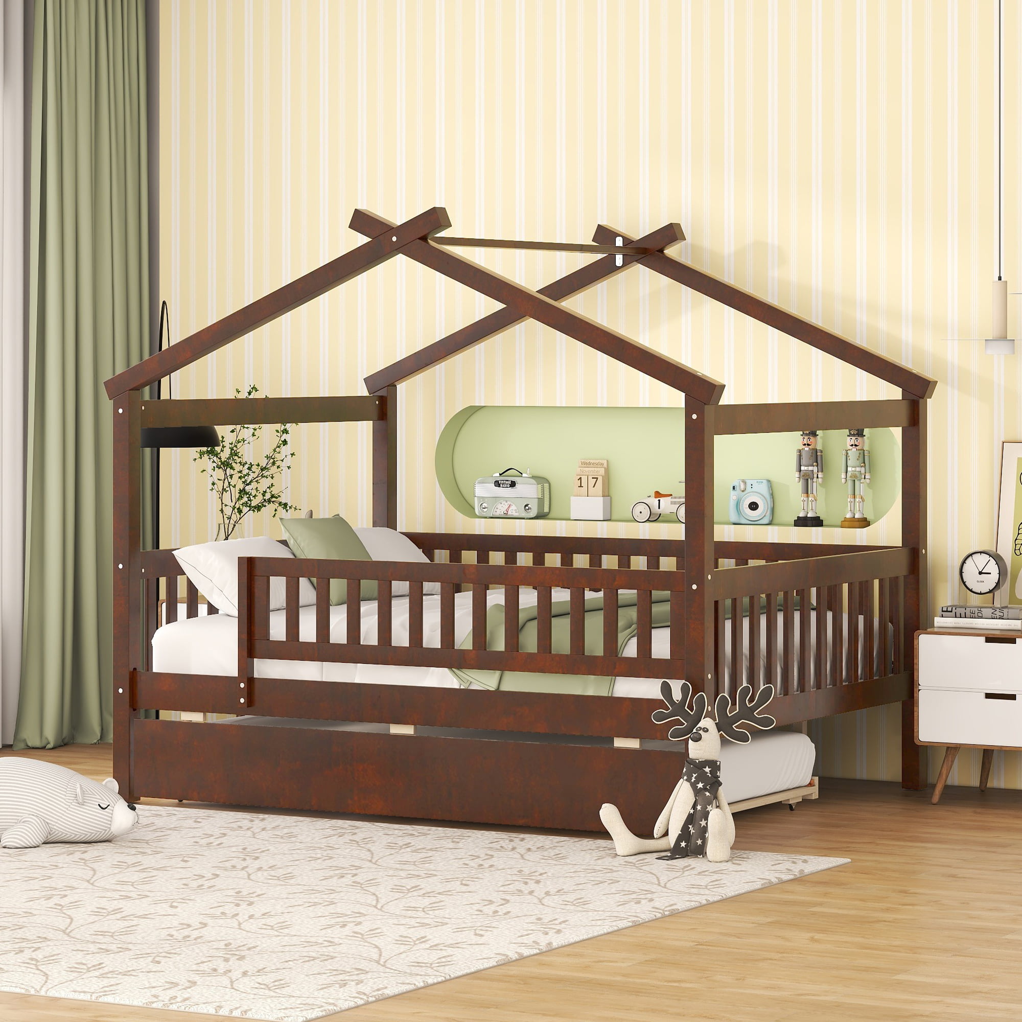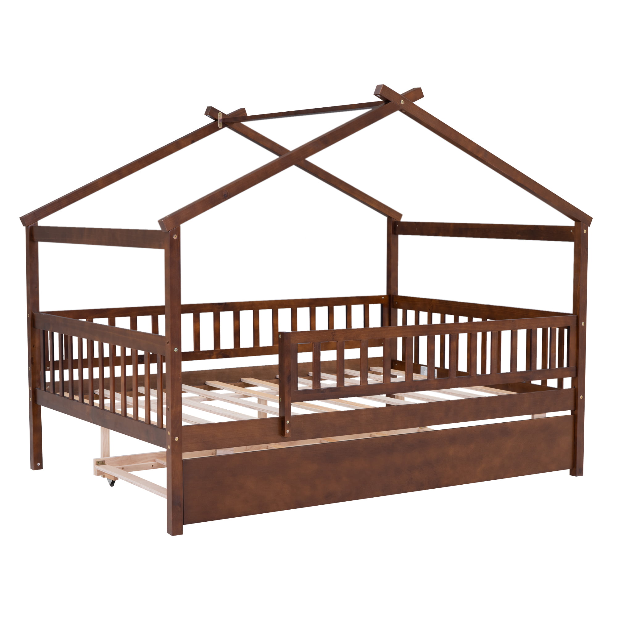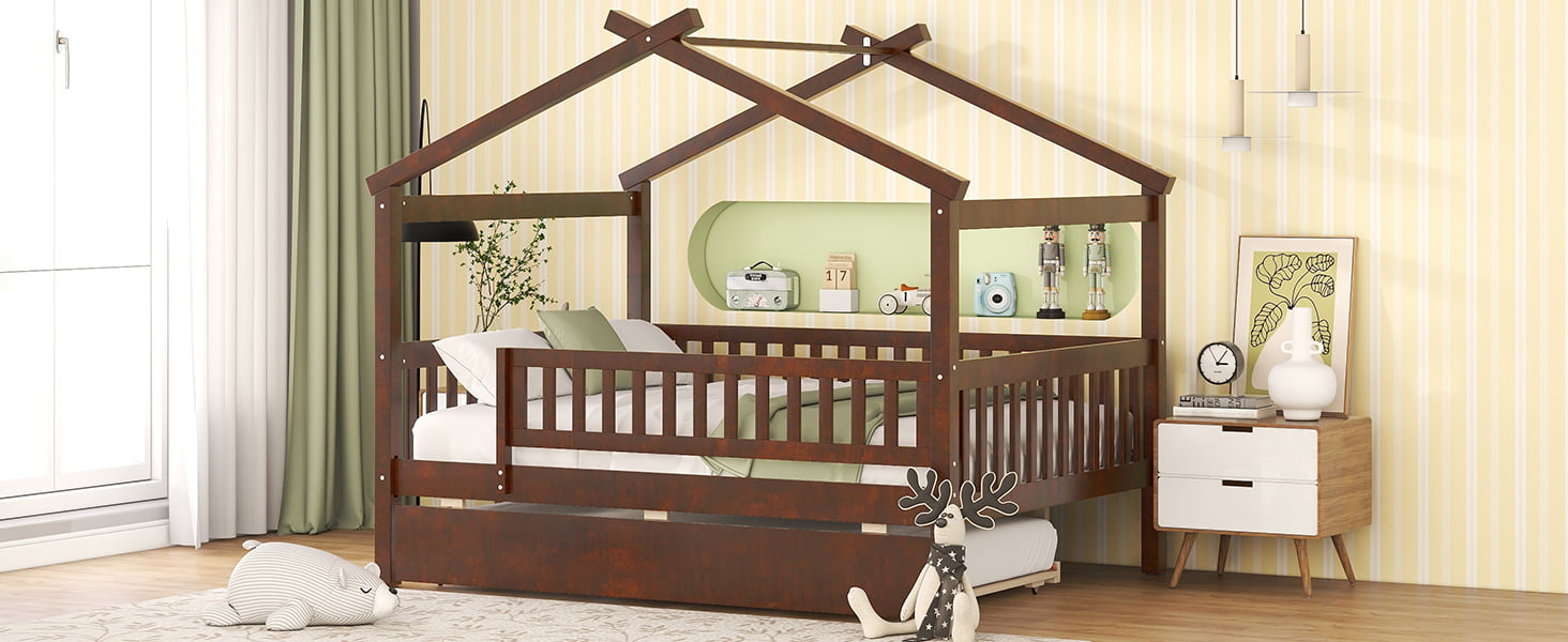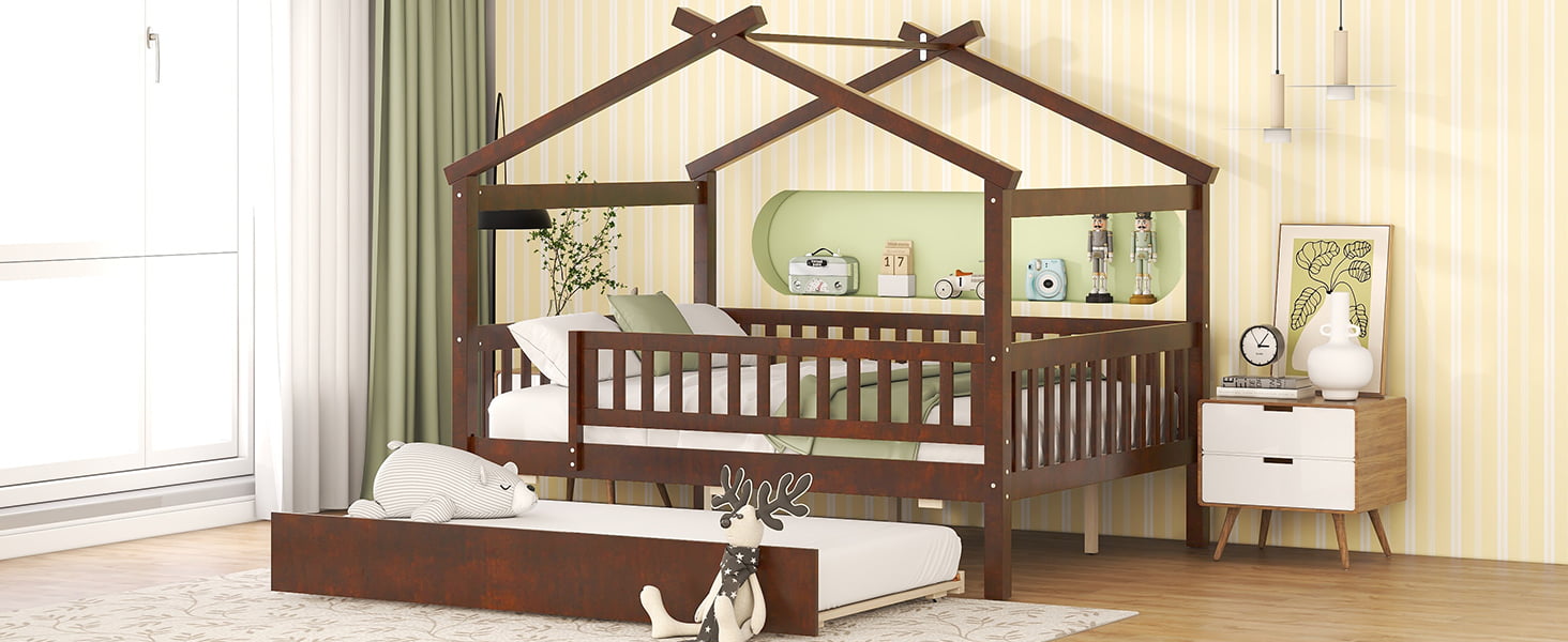 - [Spacious Storage] The wood house platform bed with trundle offer extra sleeping space for sleep-over. Simply just roll out when needed and roll in when it’s not in use. It’s a perfect space-saving solution to you.