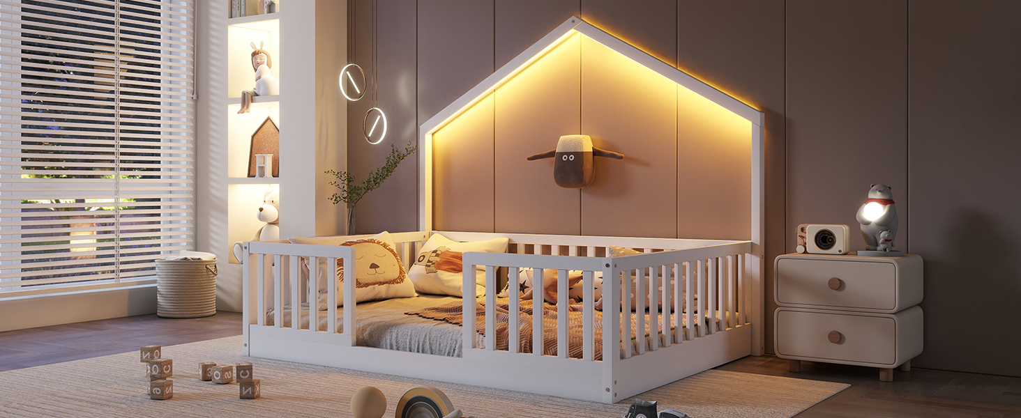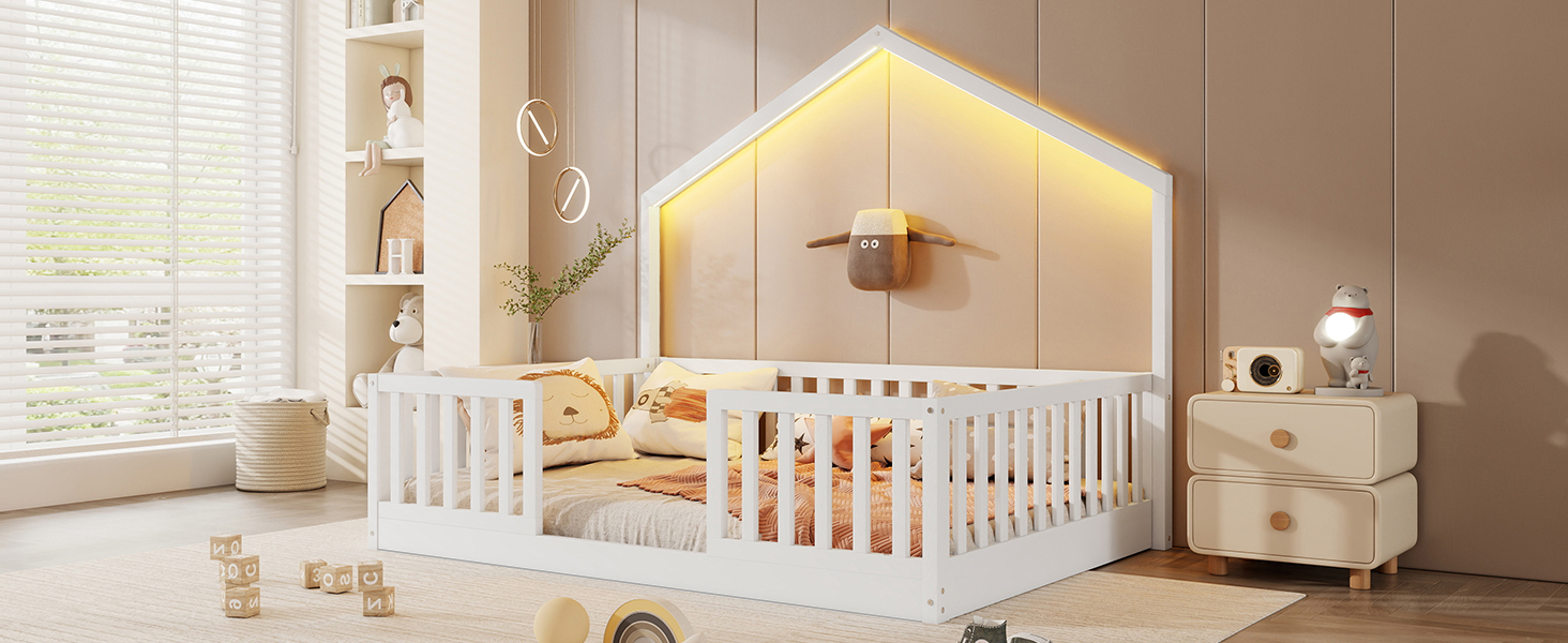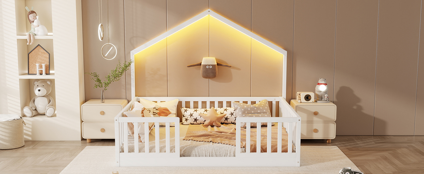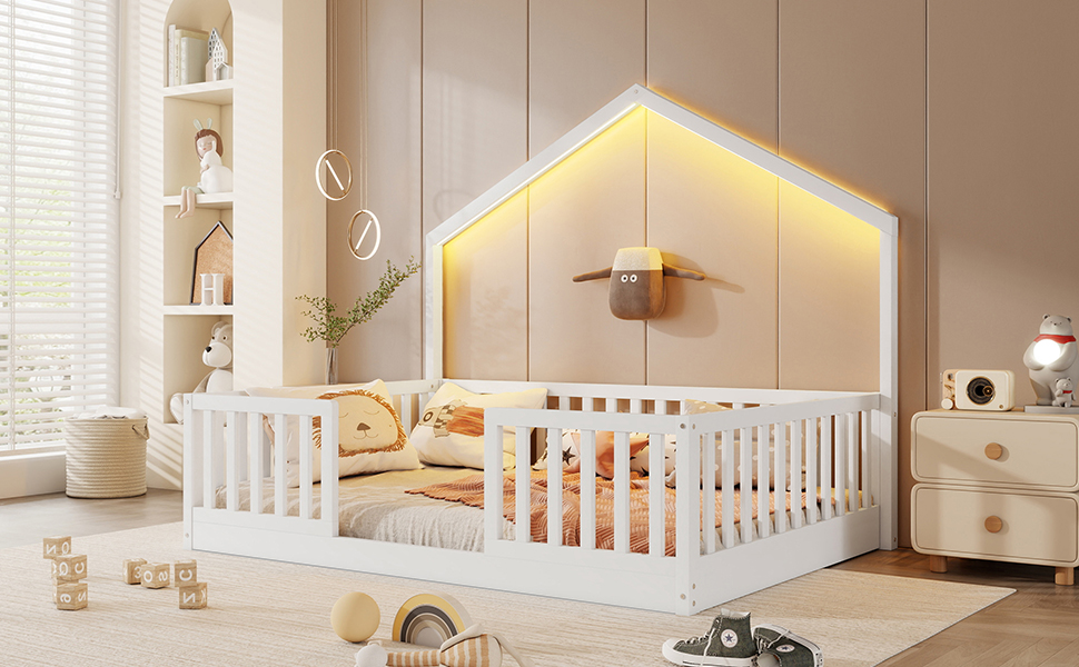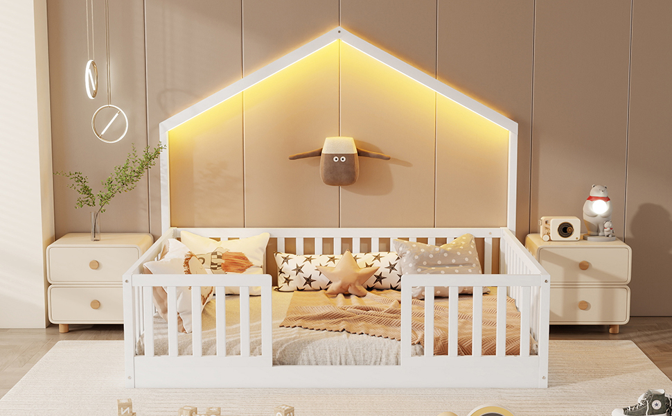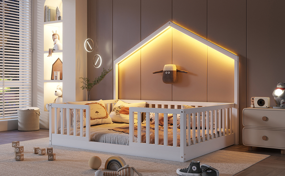 - Floor Bed with LED Light: This full size floor bed with simple house shaped and included LED strip lights to create a cozy, dreamy atmosphere for bedtime. P.S. The light only have 1 color, can’t change in different colors.