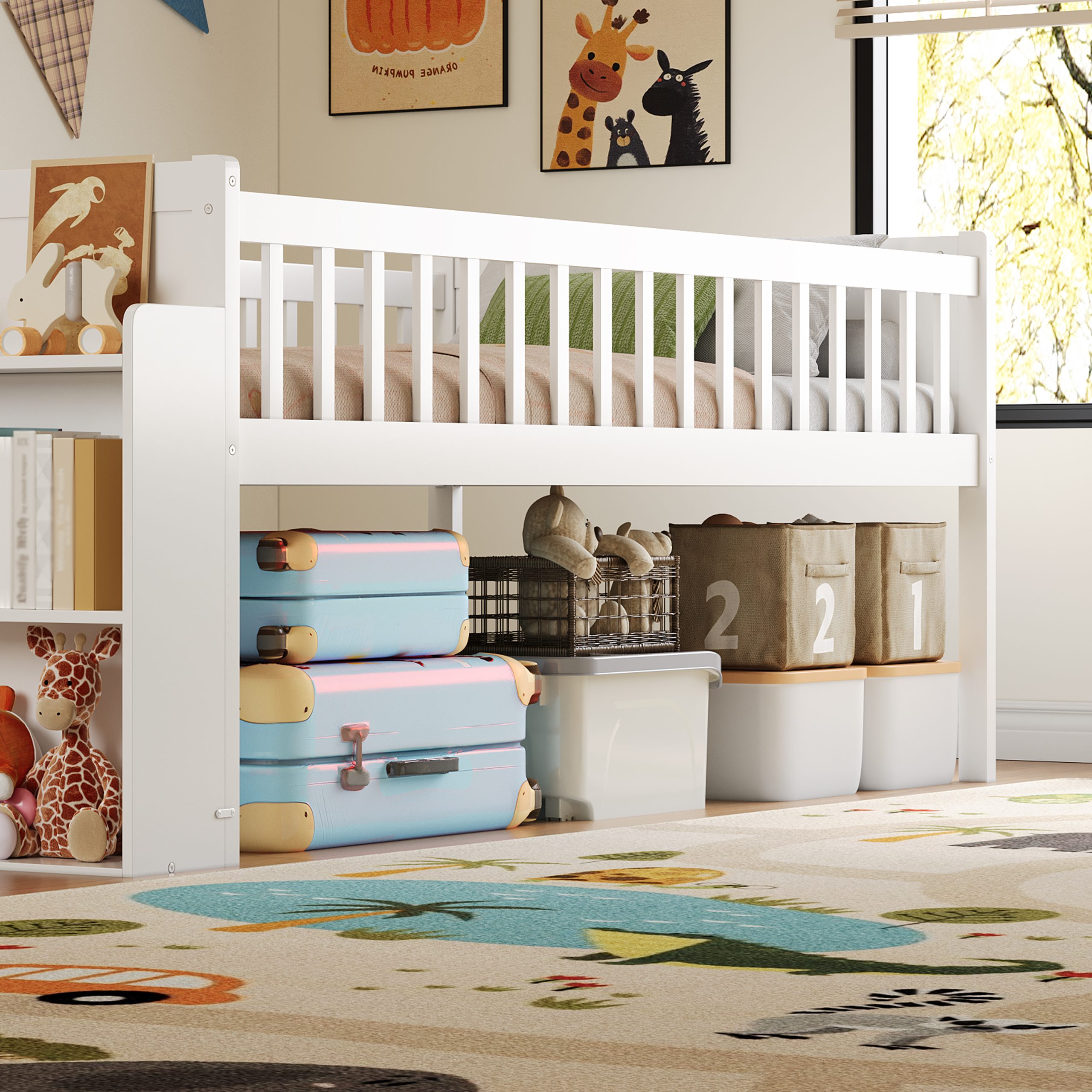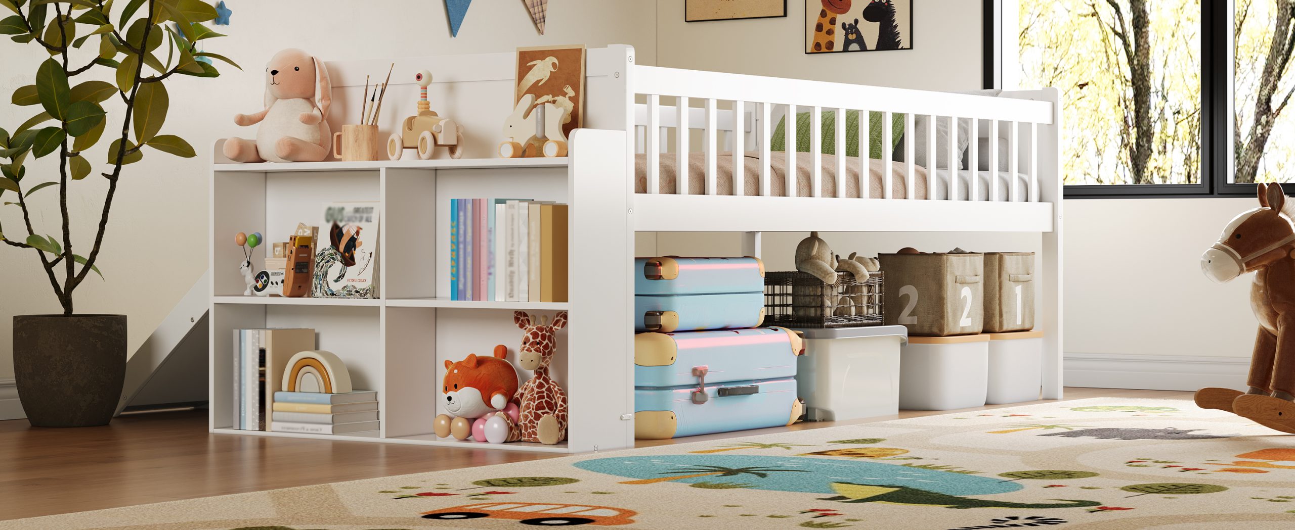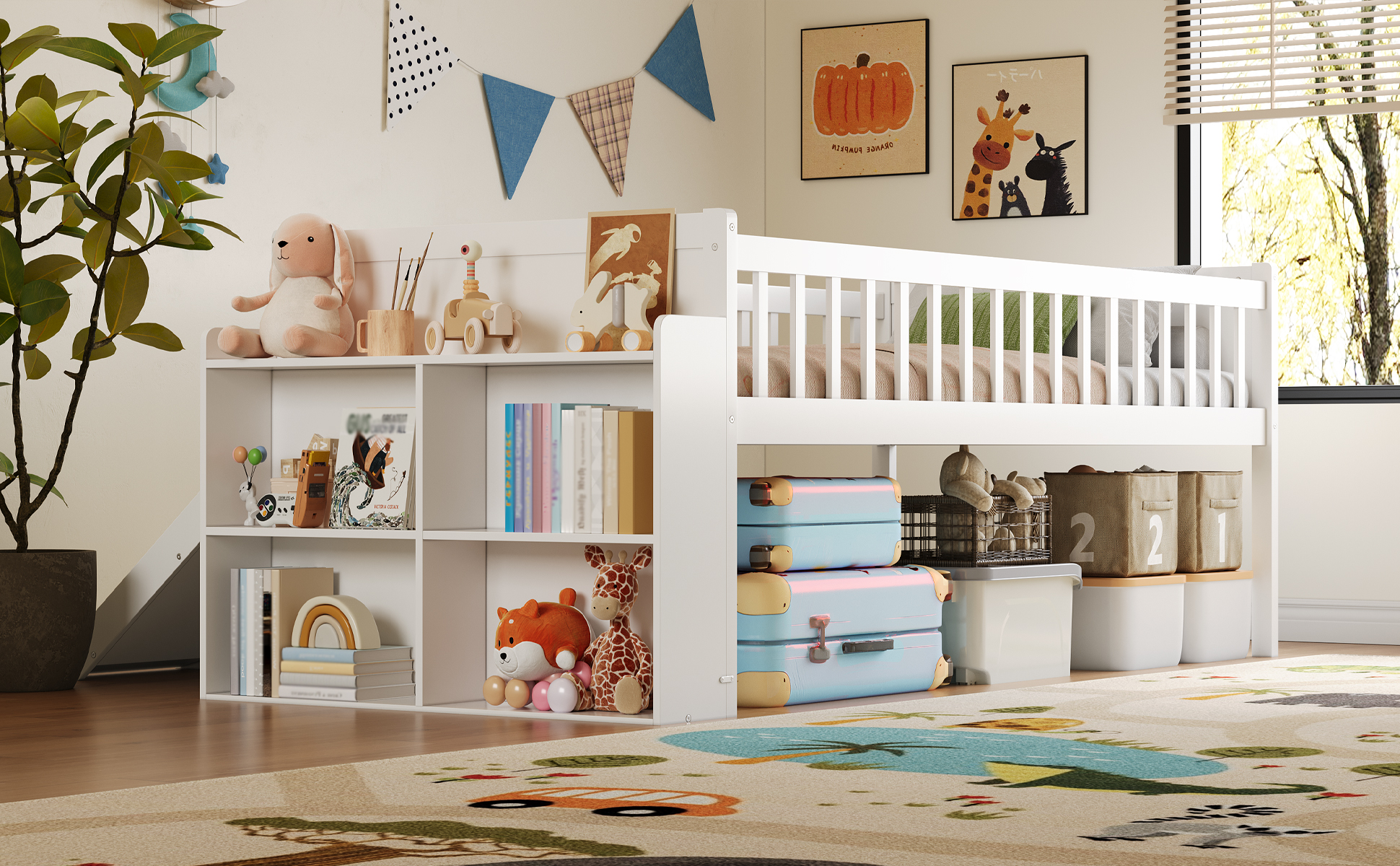 - [Twin Bed Frame with Storage Shelf] This bed features a built-in storage shelf at the foot of the bed frame, perfect for keeping books, toys, or other essentials organized, maximizing space in smaller rooms.