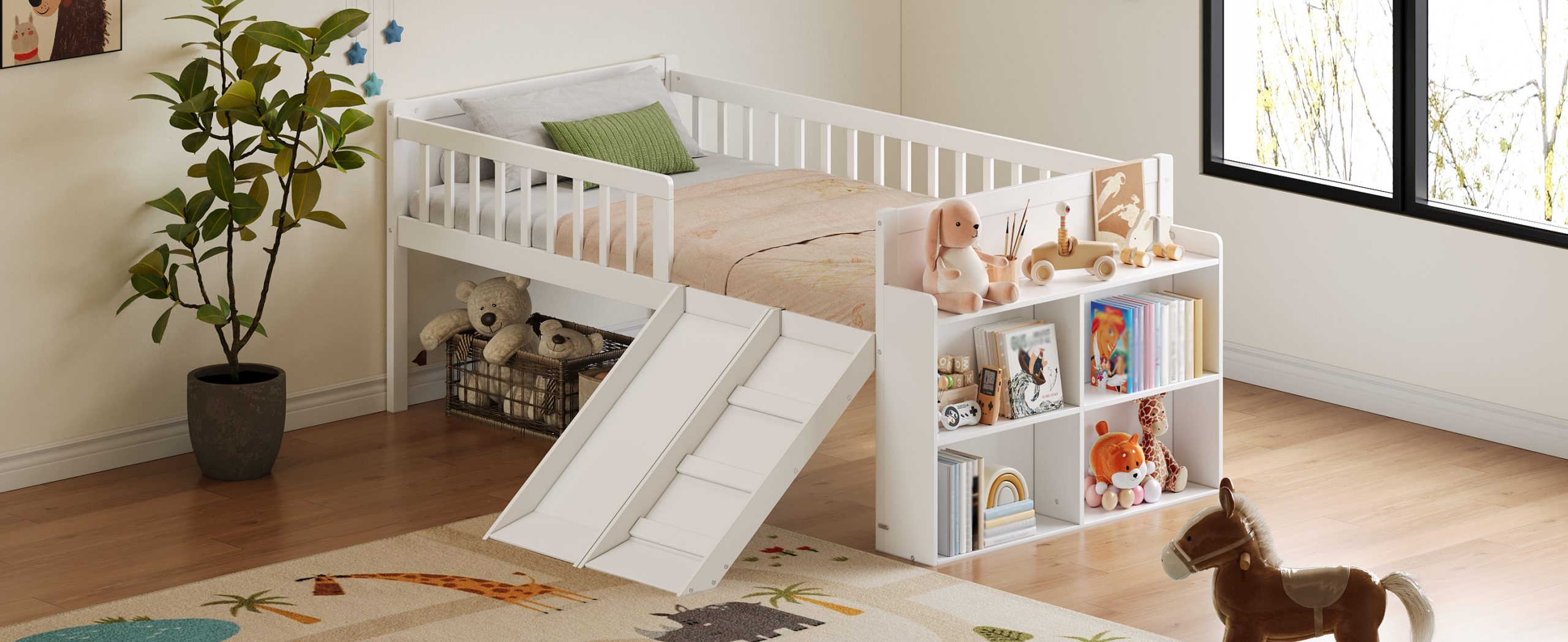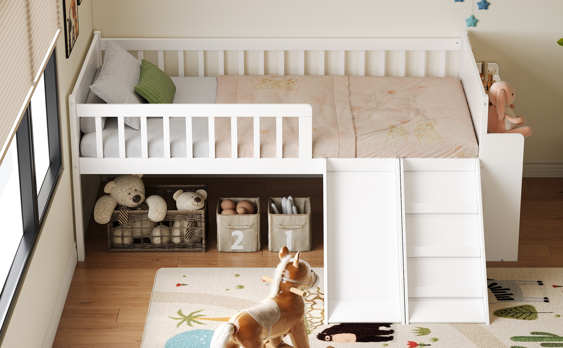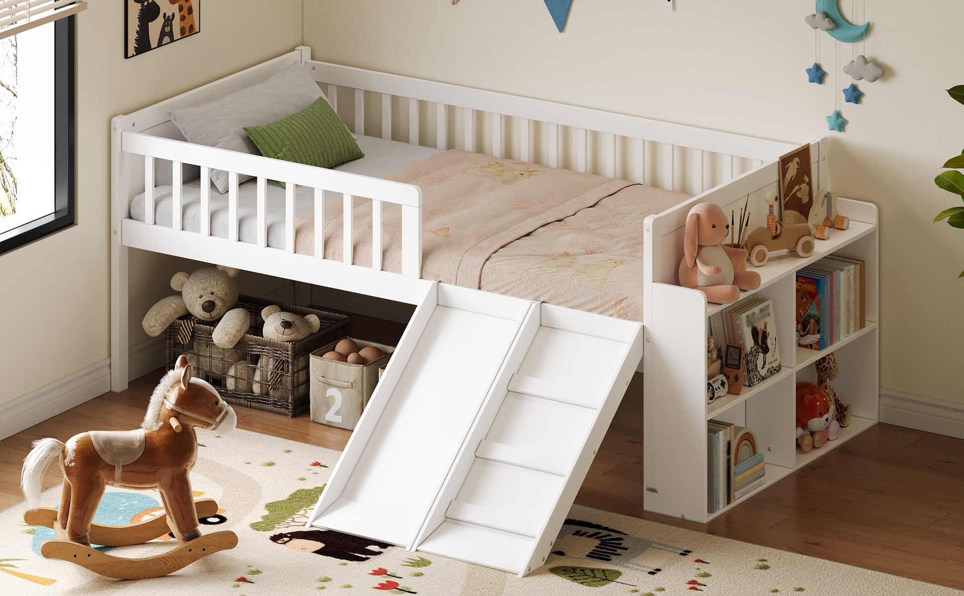 - [Twin Bed Frame with Convenient Slide and Ladder] This wooden twin bed frame comes with a ladder for easy climbing and a smooth slide that makes bedtime more exciting. It turns a regular bed into a playful and functional sleeping space, encouraging kids’ independence and adding a fun feature to their daily routine—perfect for active children who love imaginative play.