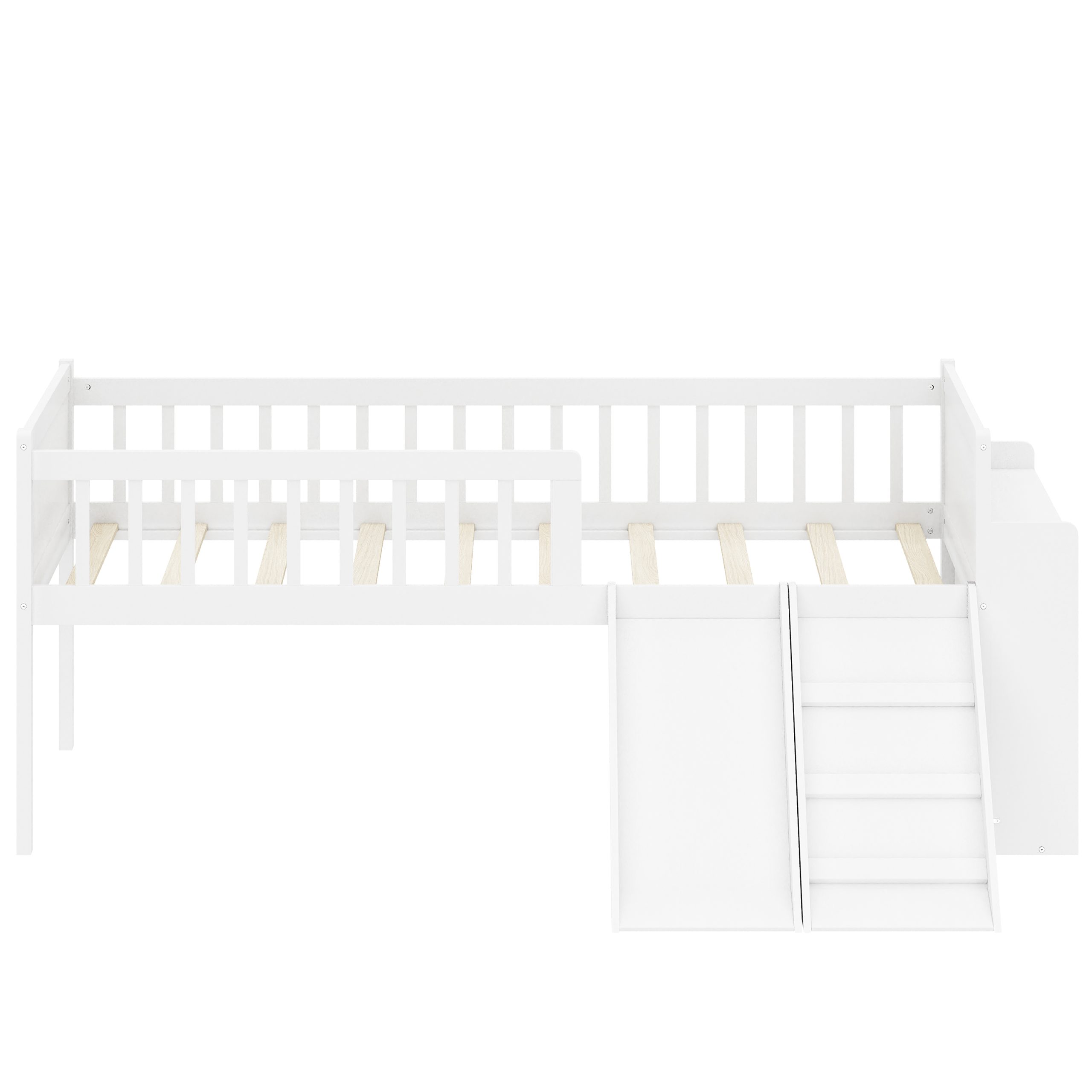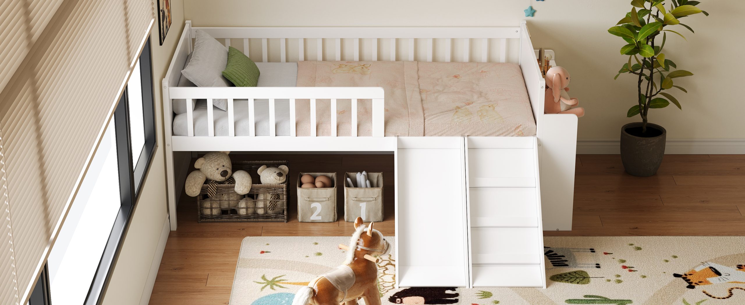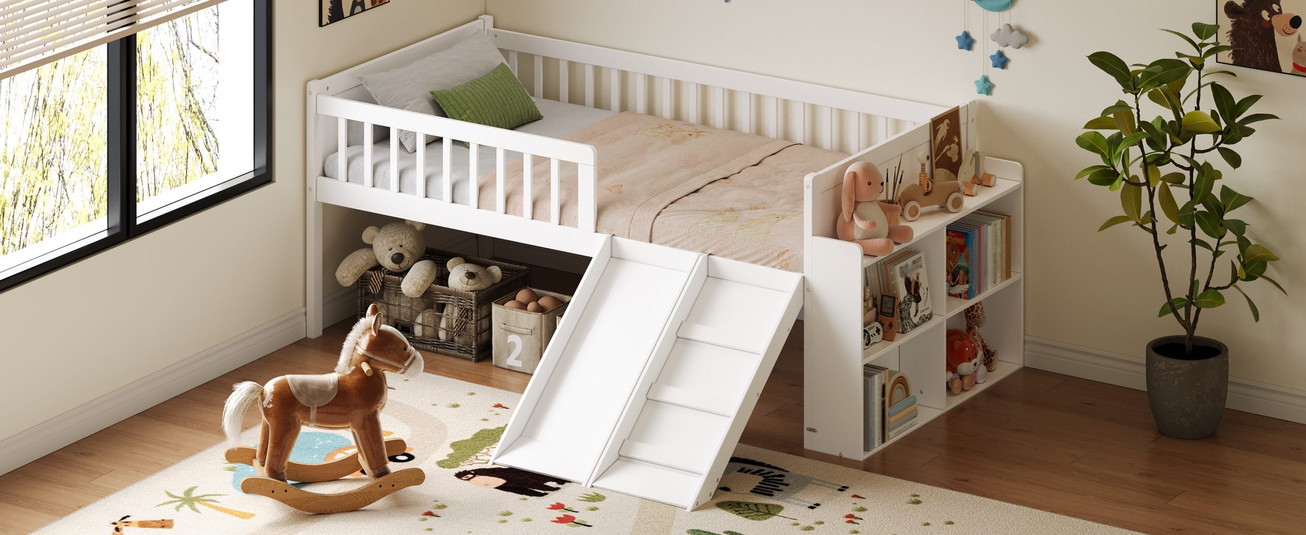 - [Twin Bed Frame with Convenient Slide and Ladder] This wooden twin bed frame comes with a ladder for easy climbing and a smooth slide that makes bedtime more exciting. It turns a regular bed into a playful and functional sleeping space, encouraging kids’ independence and adding a fun feature to their daily routine—perfect for active children who love imaginative play.